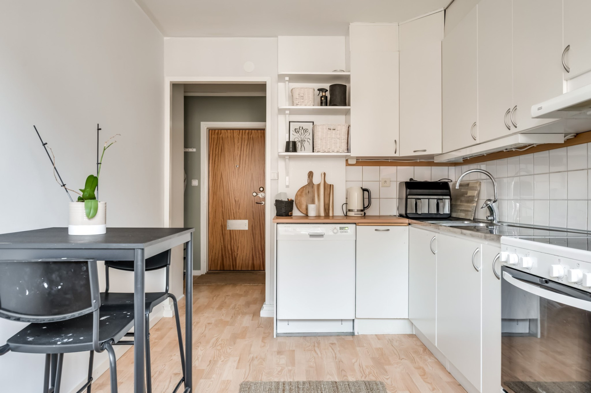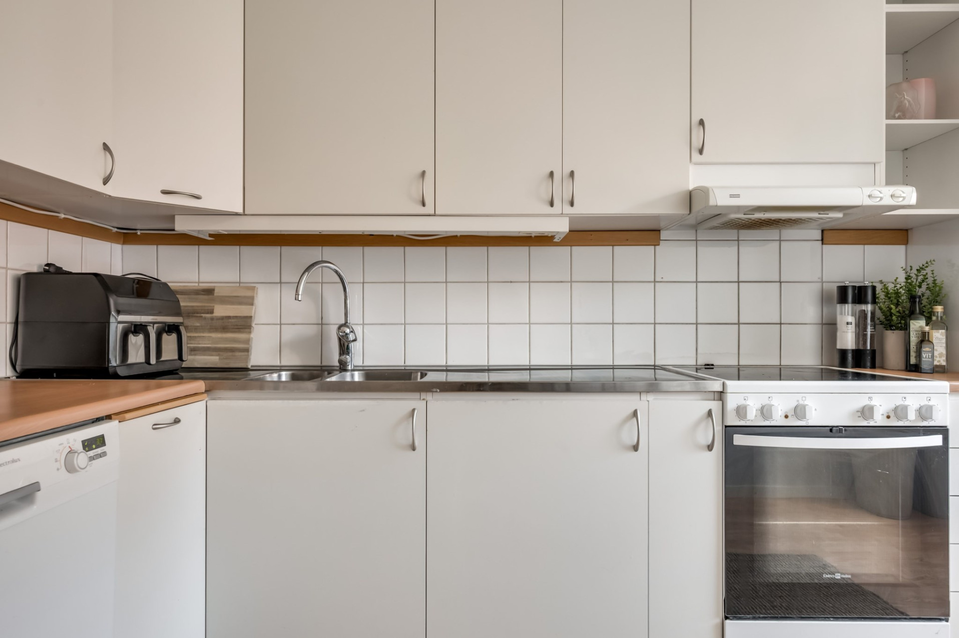 Rymligt kök utrustat med spis, fläkt, kyl, frys samt diskmaskin.