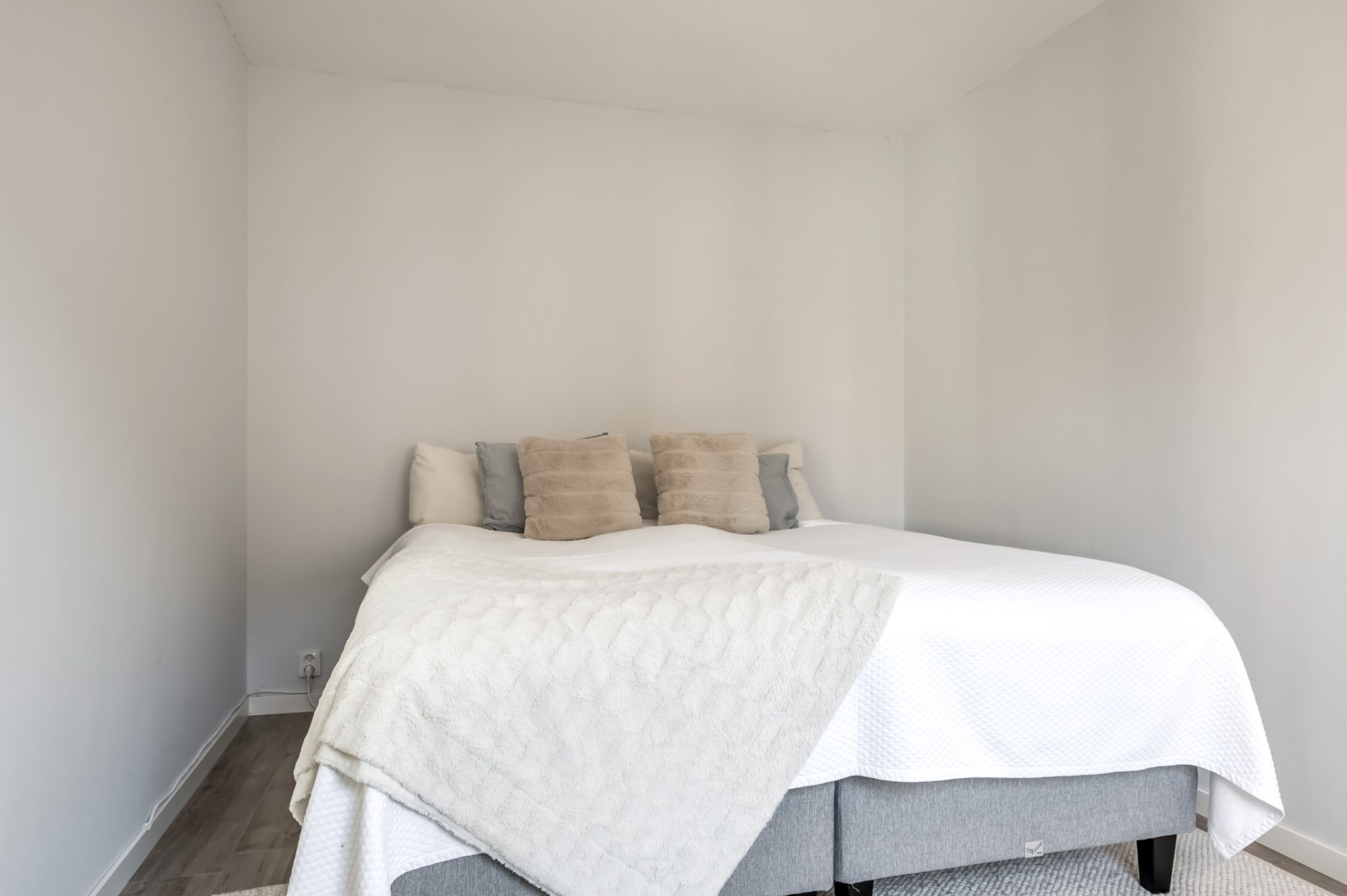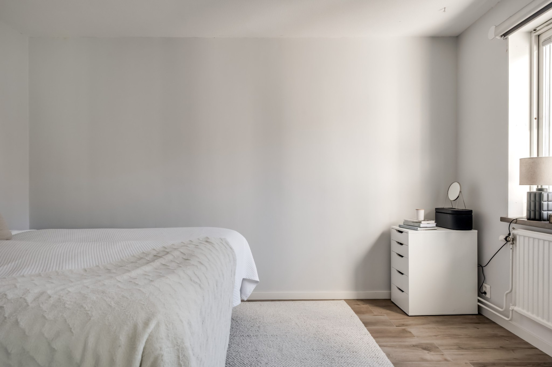 Sovrum med plats för dubbelsäng samt annat möblemang.