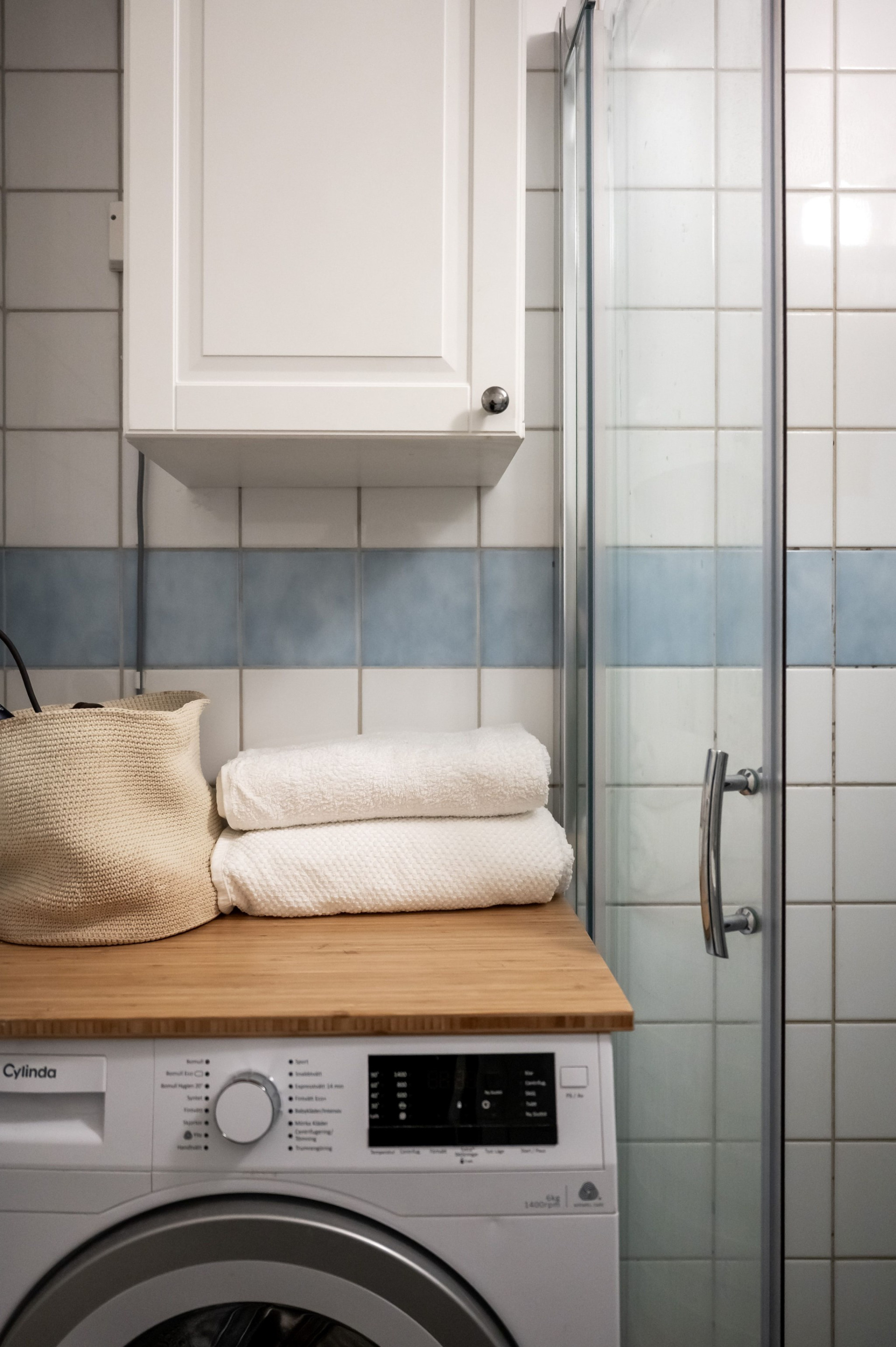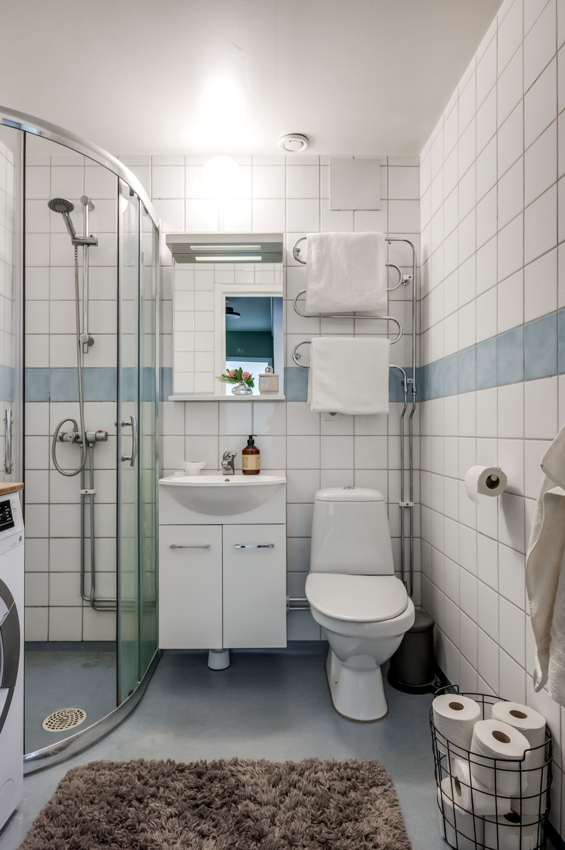 Badrum med kakel på vägg samt våtrumsmatta på golv. Här finns dusch, tvättställ med kommod, wc samt tvättmaskin.
