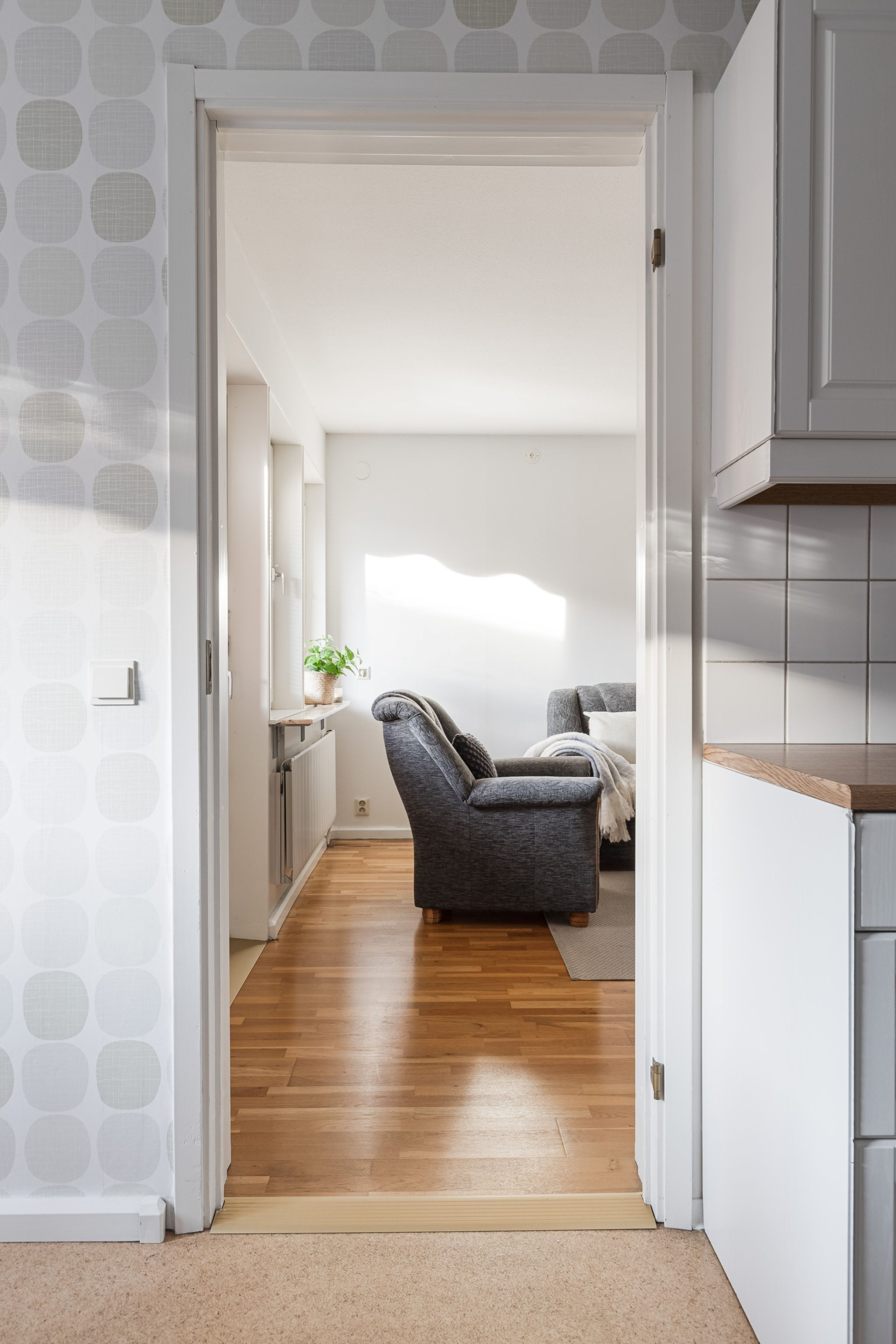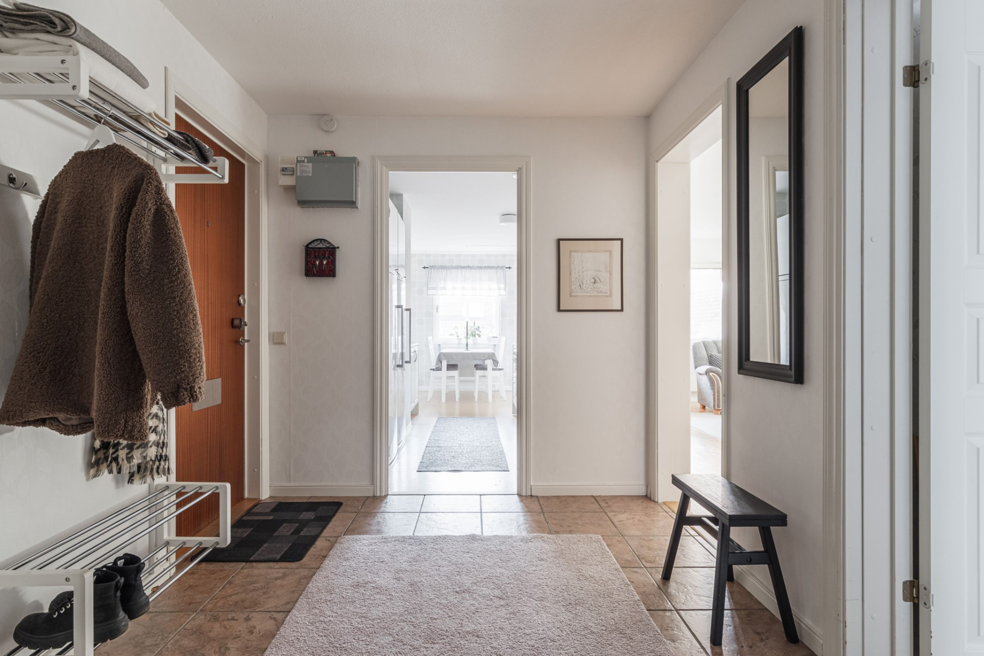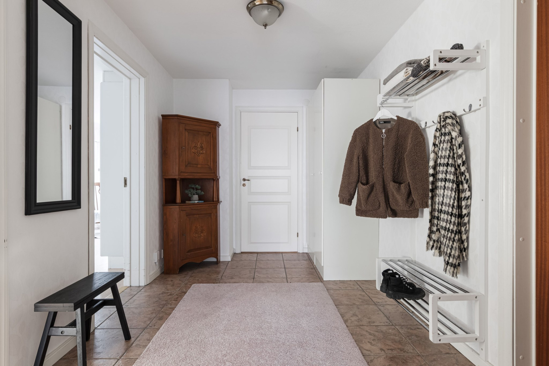 Rymlig hall med goda förvaringsmöjligheter. Klinker på golv samt tapet på vägg.