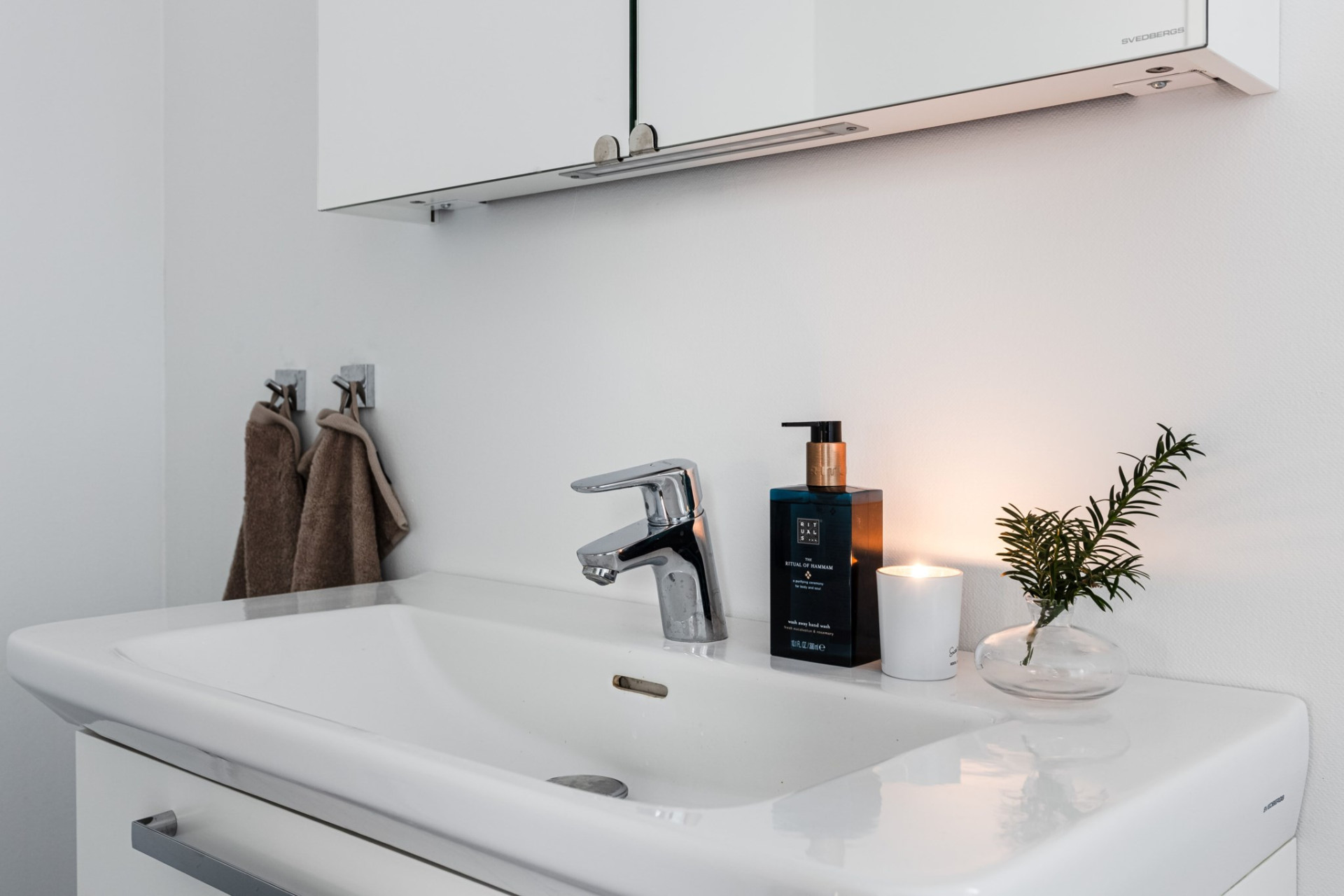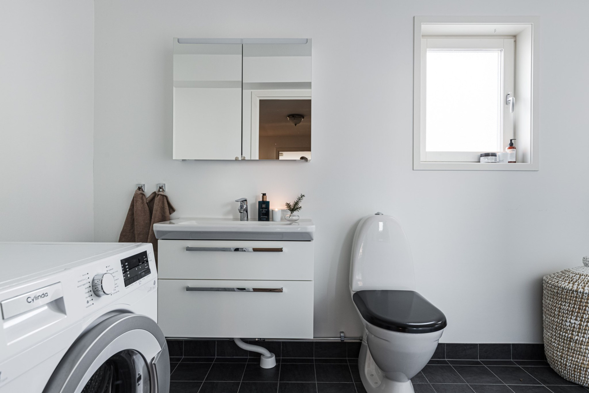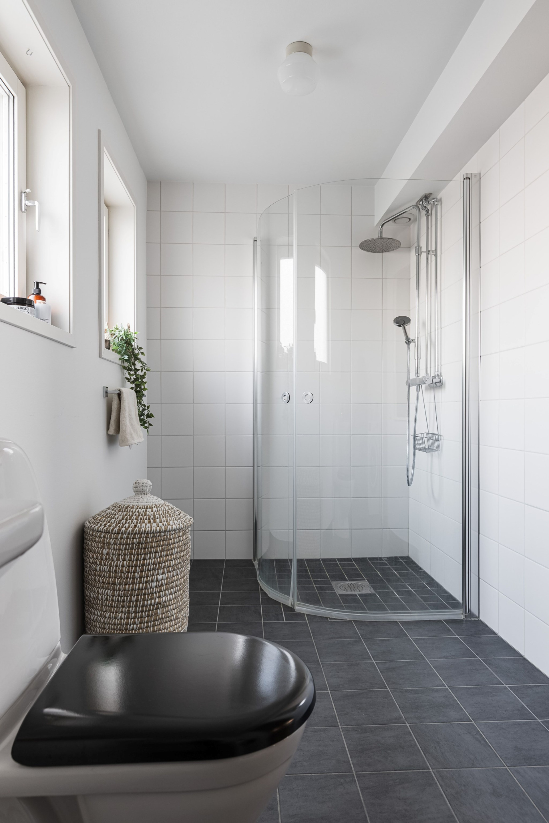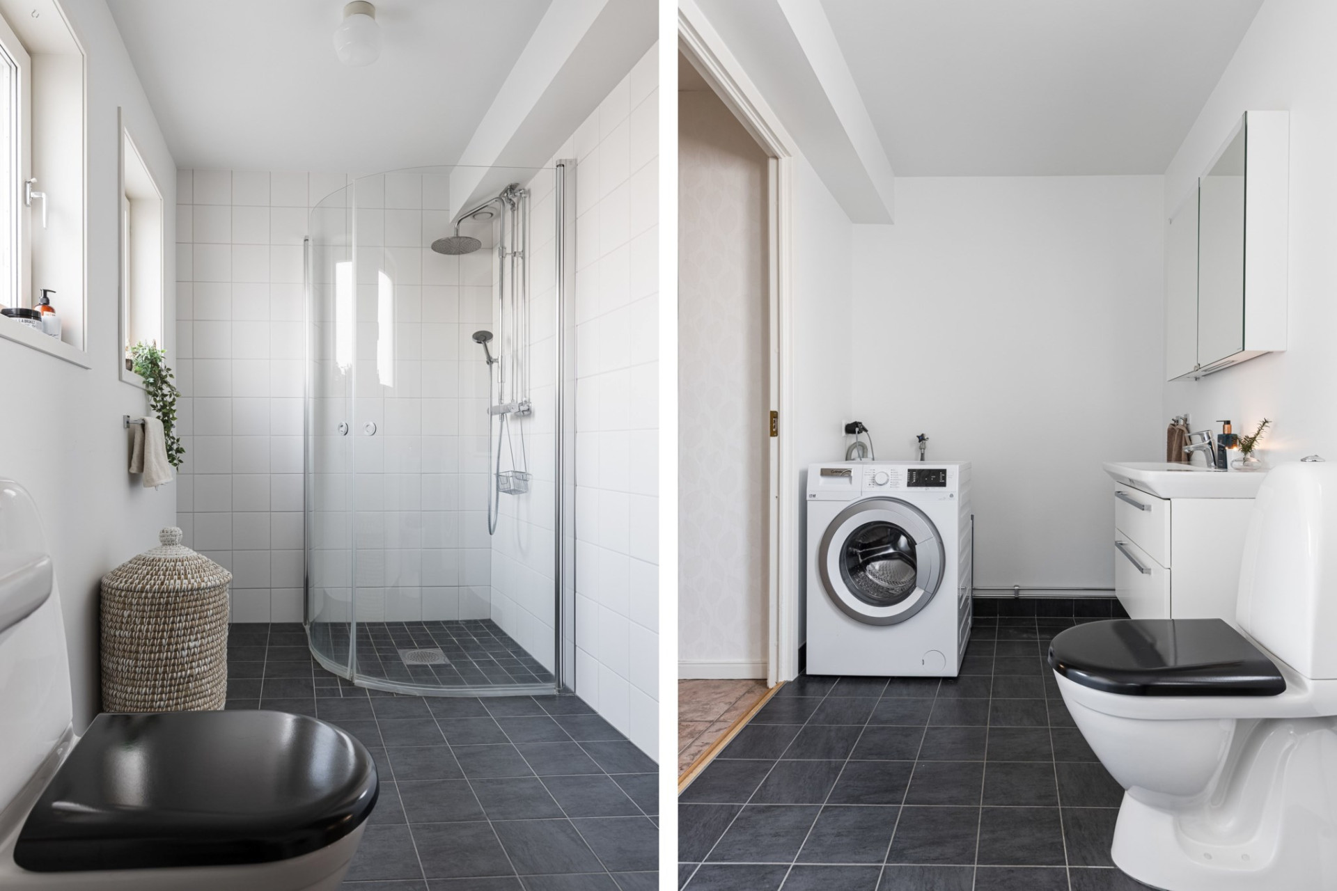 Kaklat badrum med golvvärme, renoverat 2018. Här finns wc, tvättställ med kommod, dusch samt tvättmaskin.