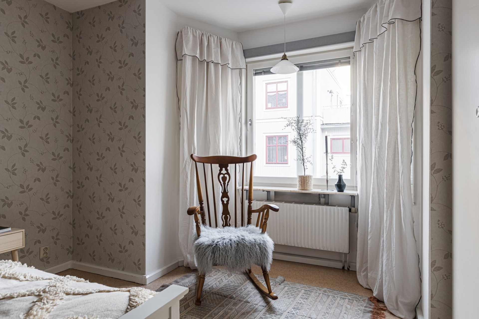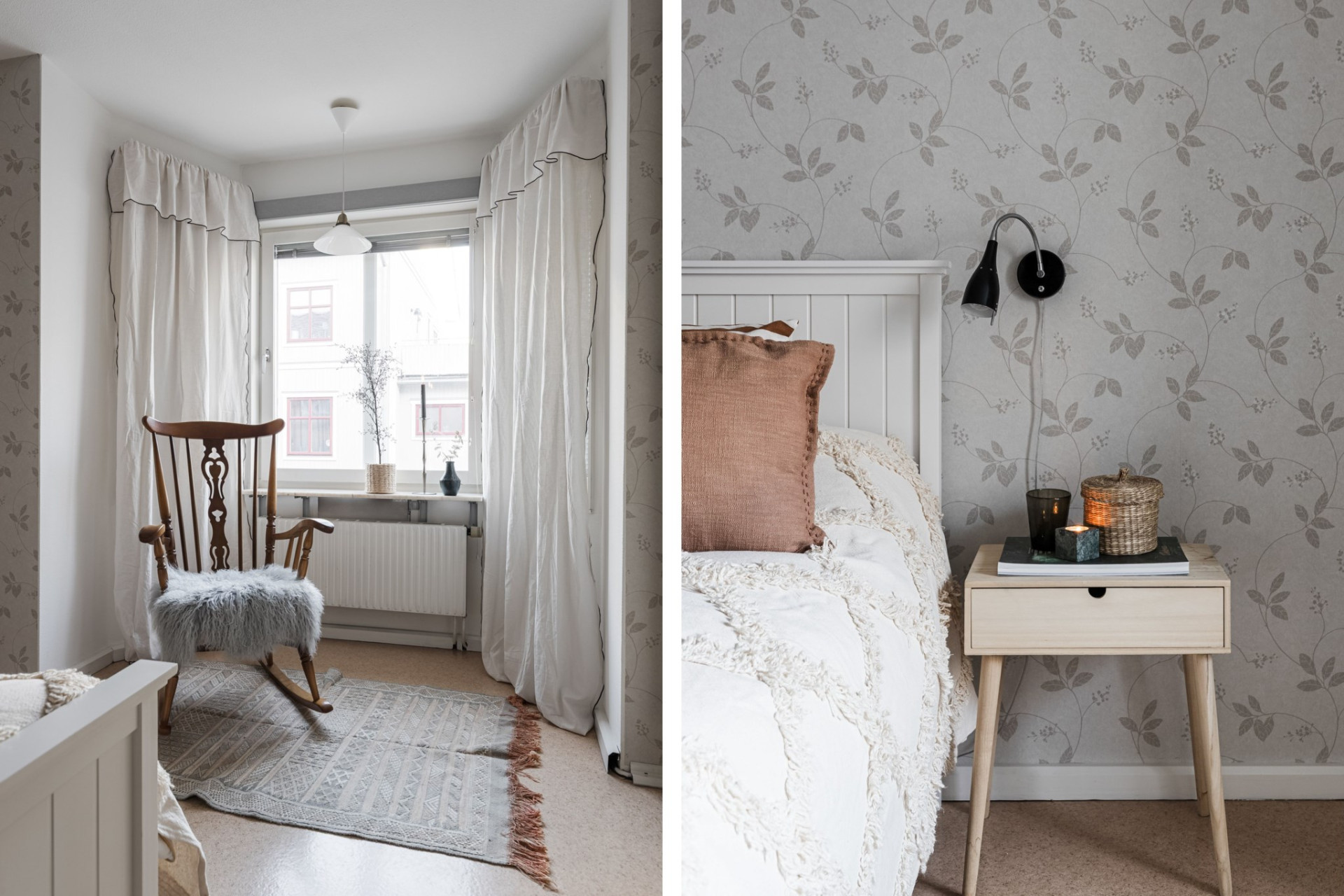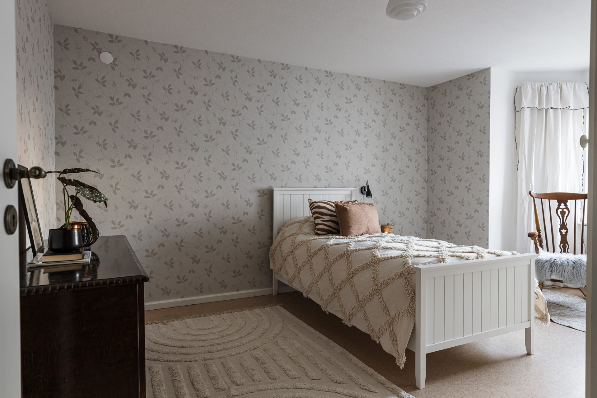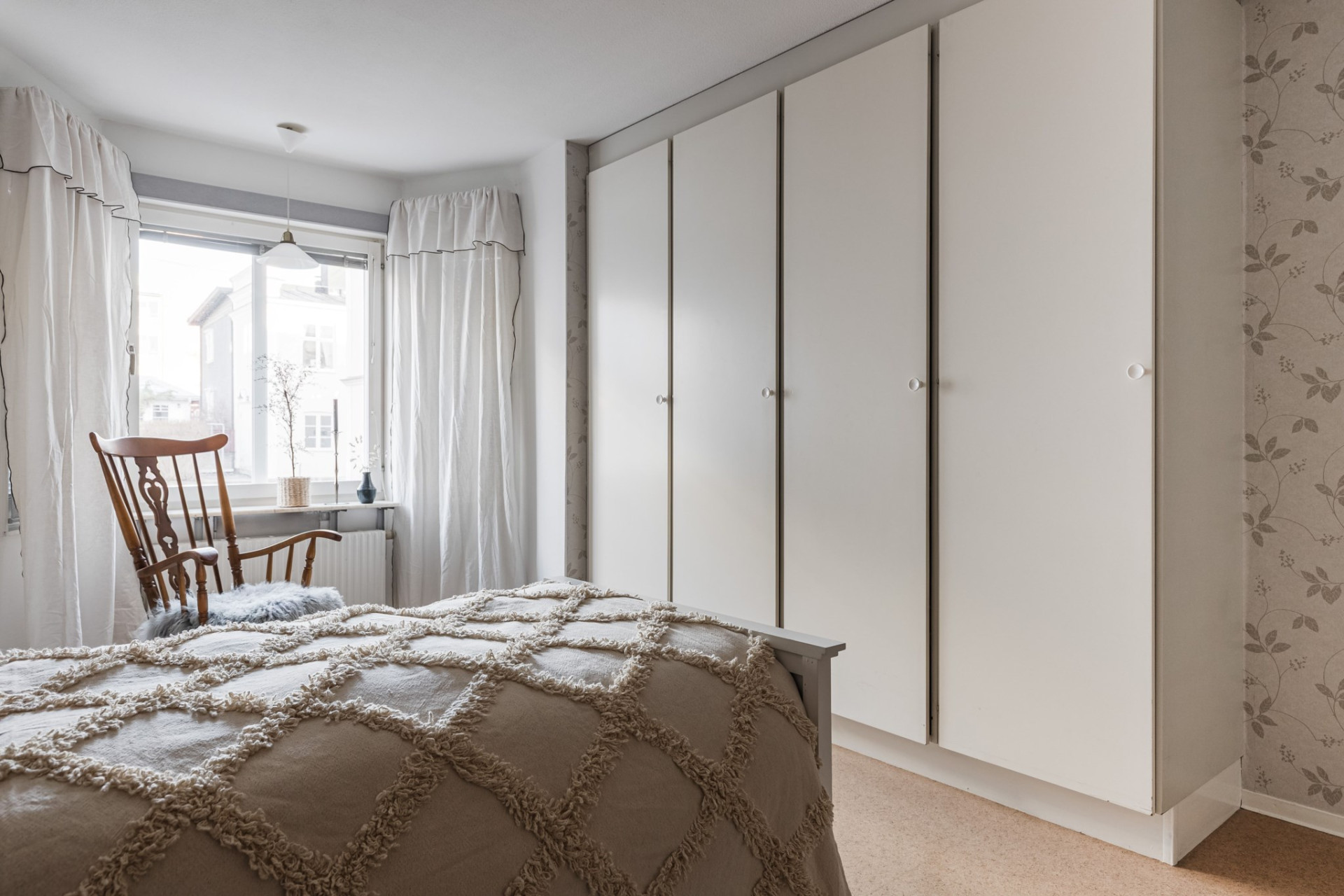 Sovrum med gott om plats för dubbelsäng och övrigt möblemang. Rummet har fyra garderober för praktisk förvaring samt vackert burspråk. Väggarna är tapetserade och golvet har plastmatta.