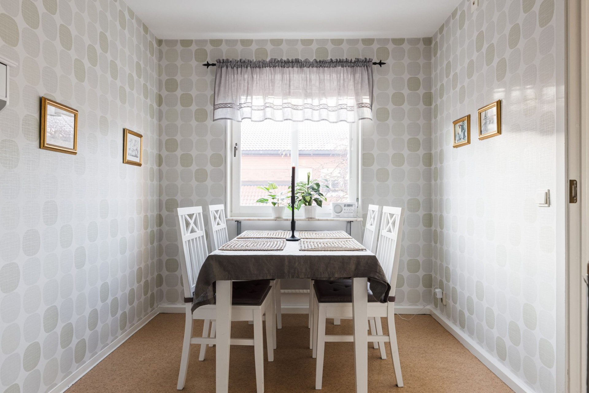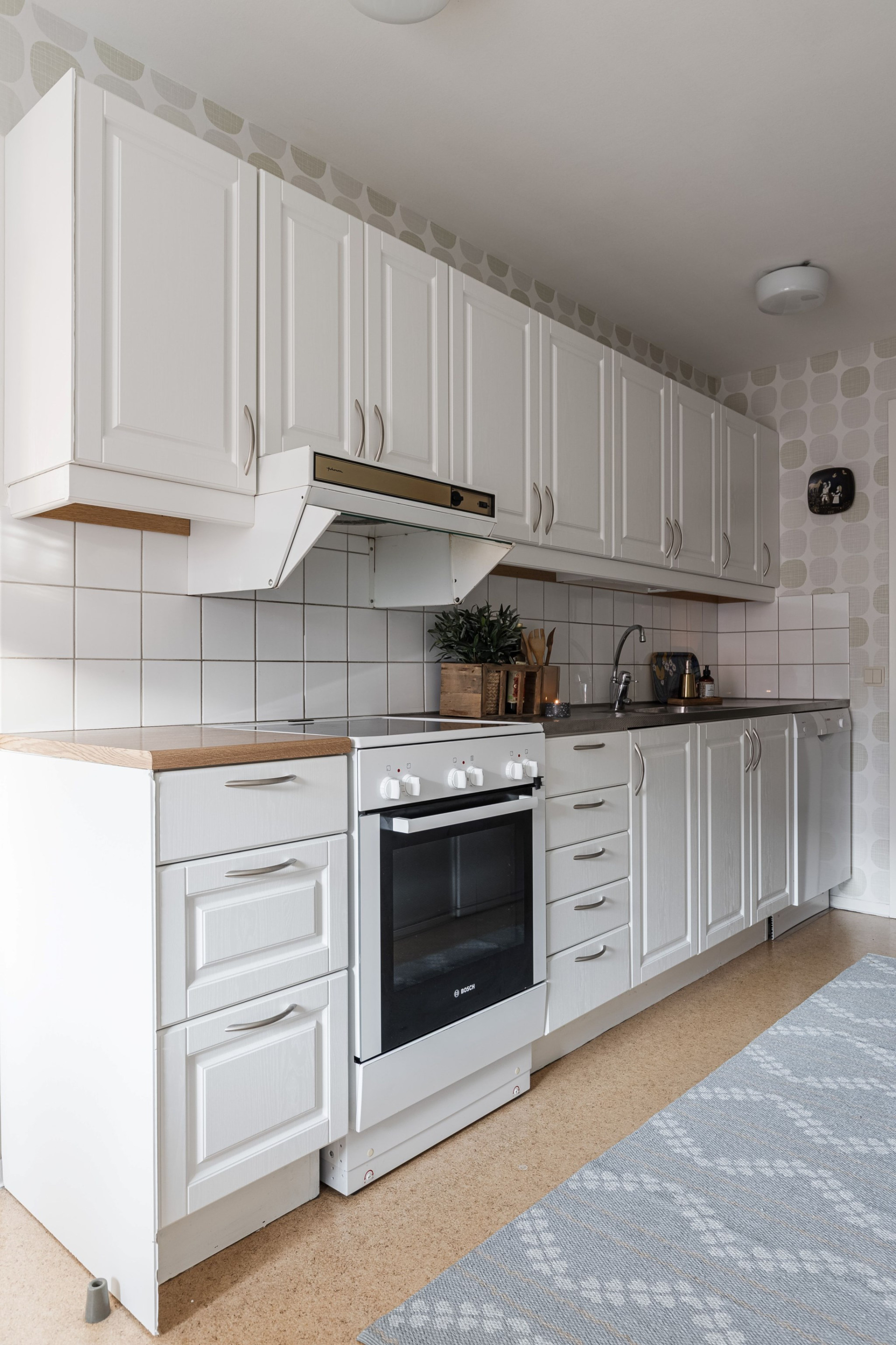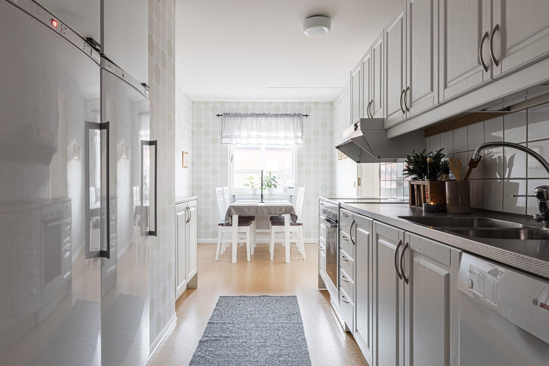 Kök med plats för matbord vid fönster! Här finns hel kyl och frys, spis, ugn, fläkt samt diskmaskin. Plastmatta på golv samt tapet på vägg.