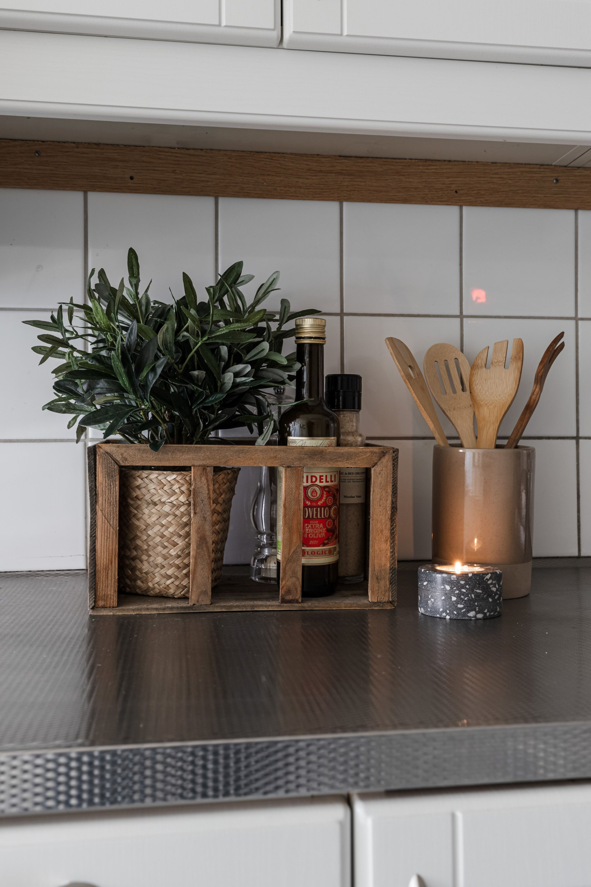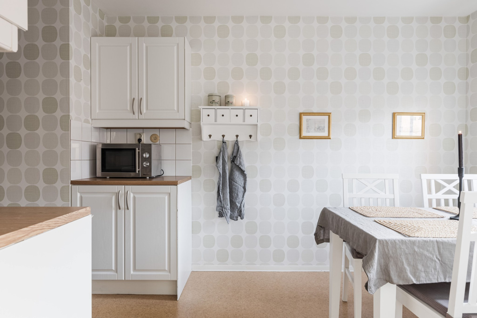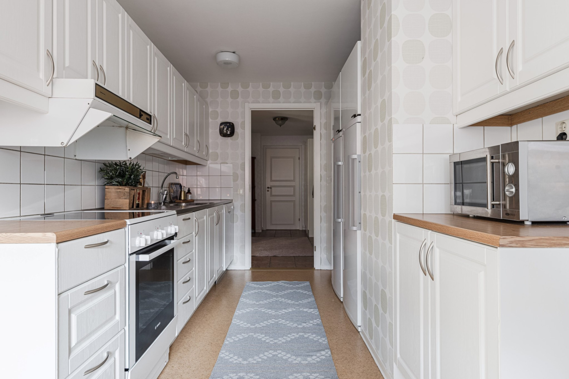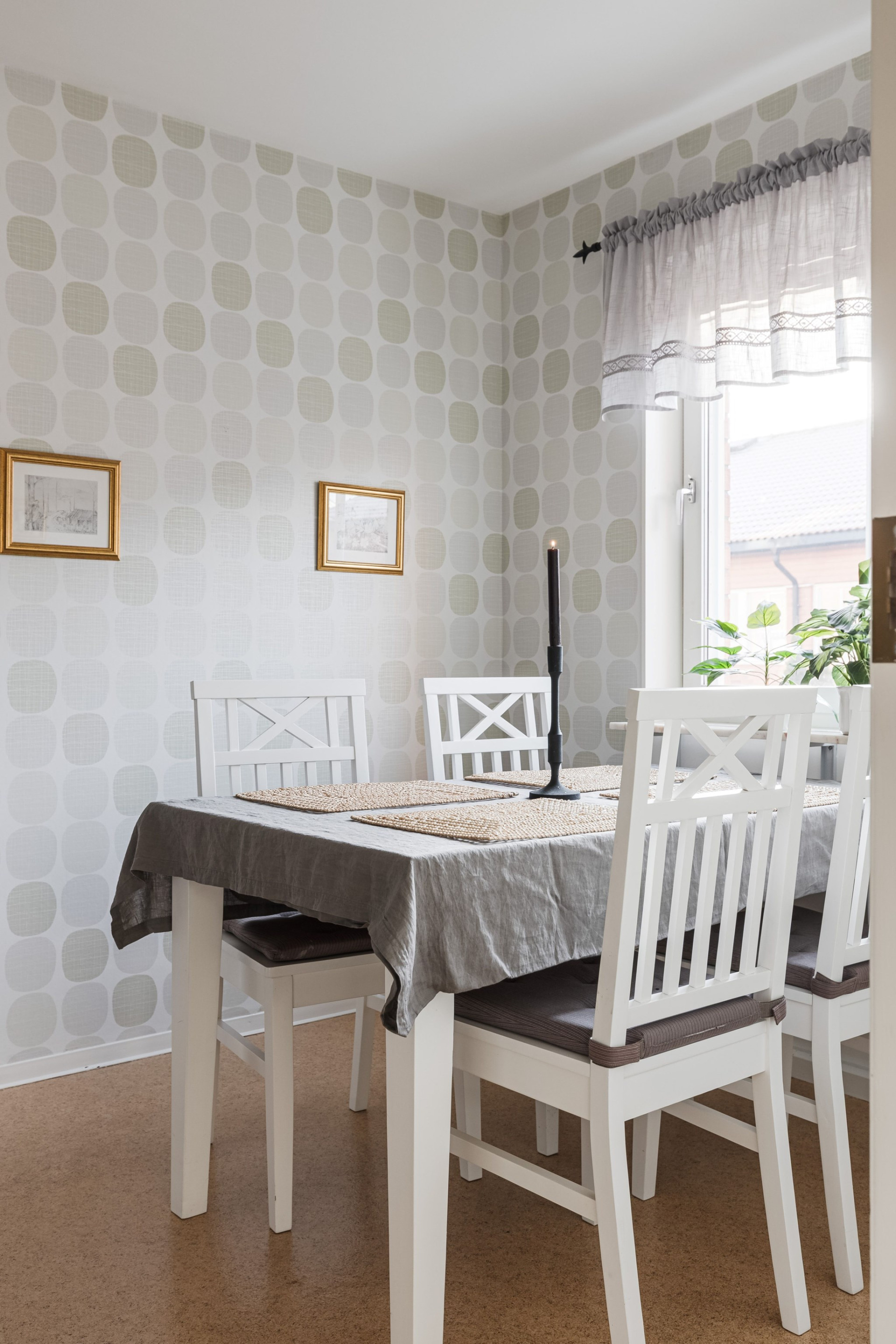 Kök med plats för matbord vid fönster! Här finns hel kyl och frys, spis, ugn, fläkt samt diskmaskin. Plastmatta på golv samt tapet på vägg.