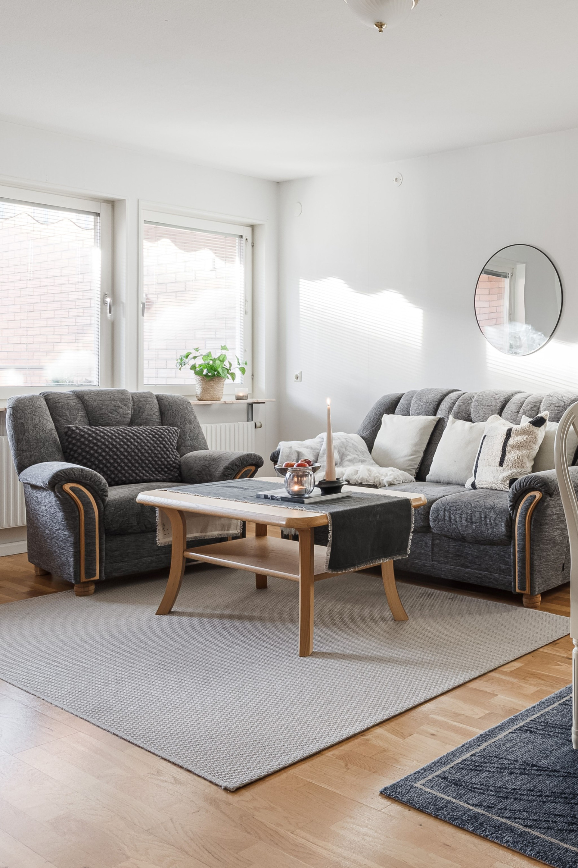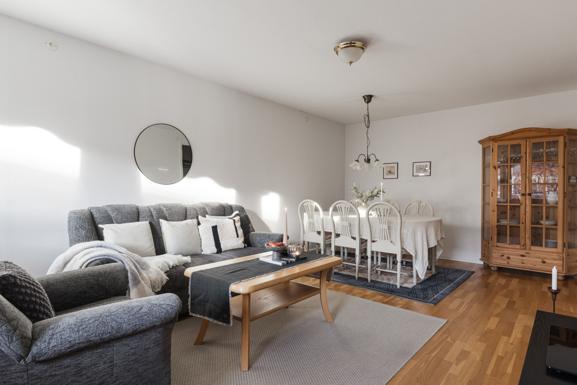 Rymligt vardagsrum med god plats för möblemang. Här når man den härliga balkongen med markis och tillgång till el.