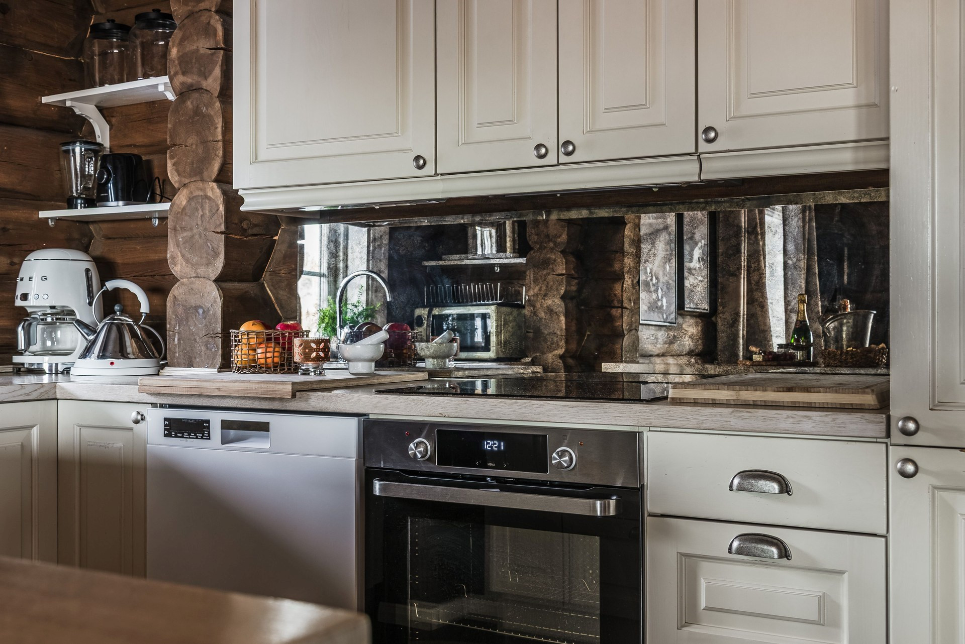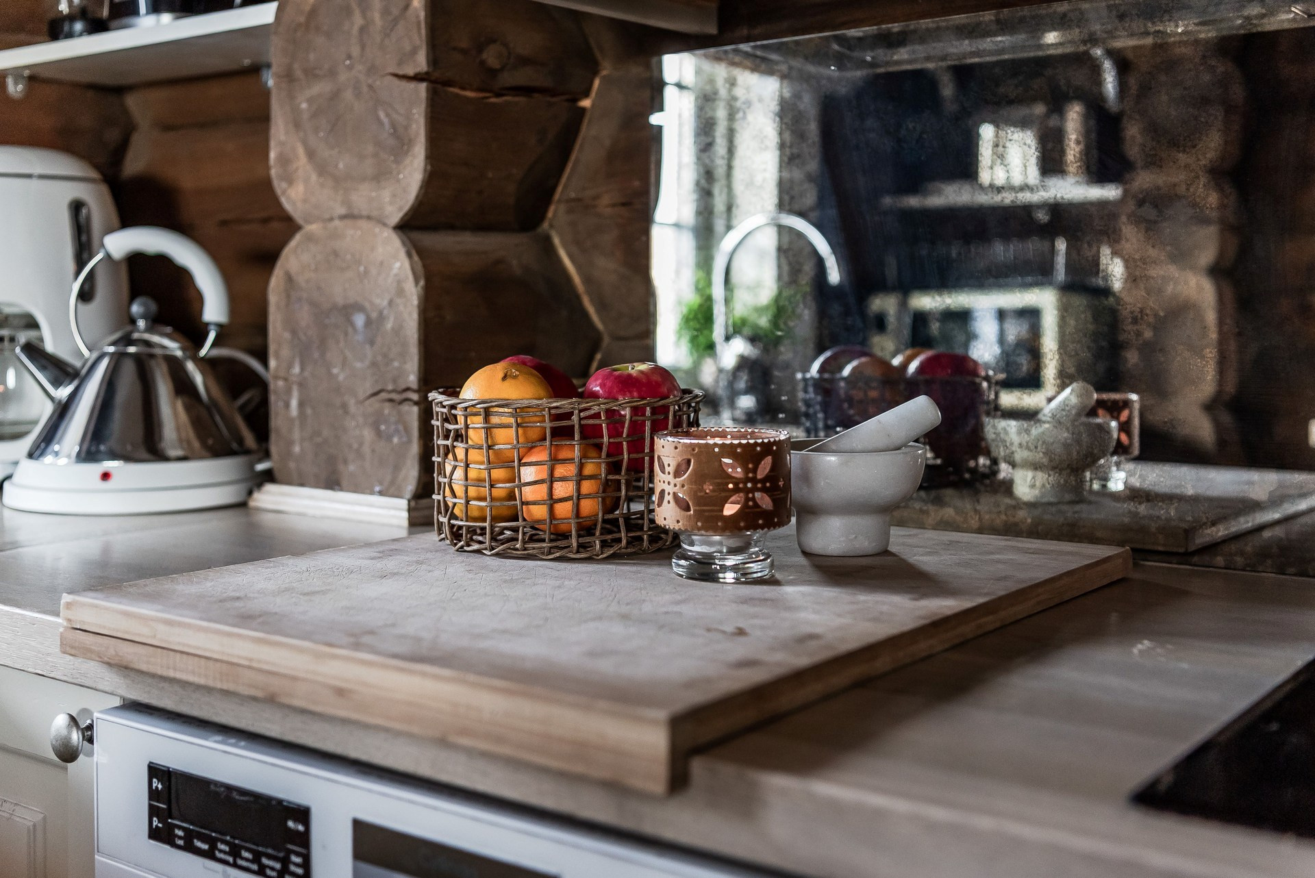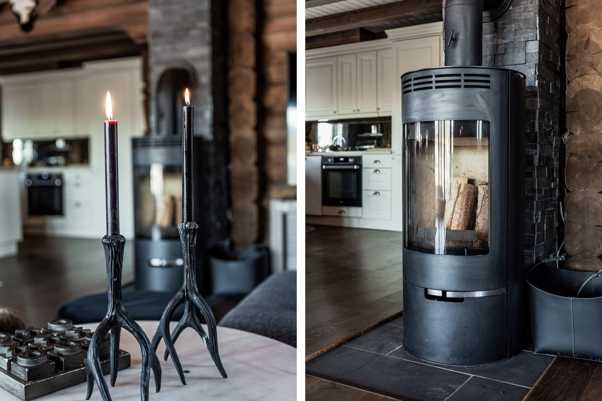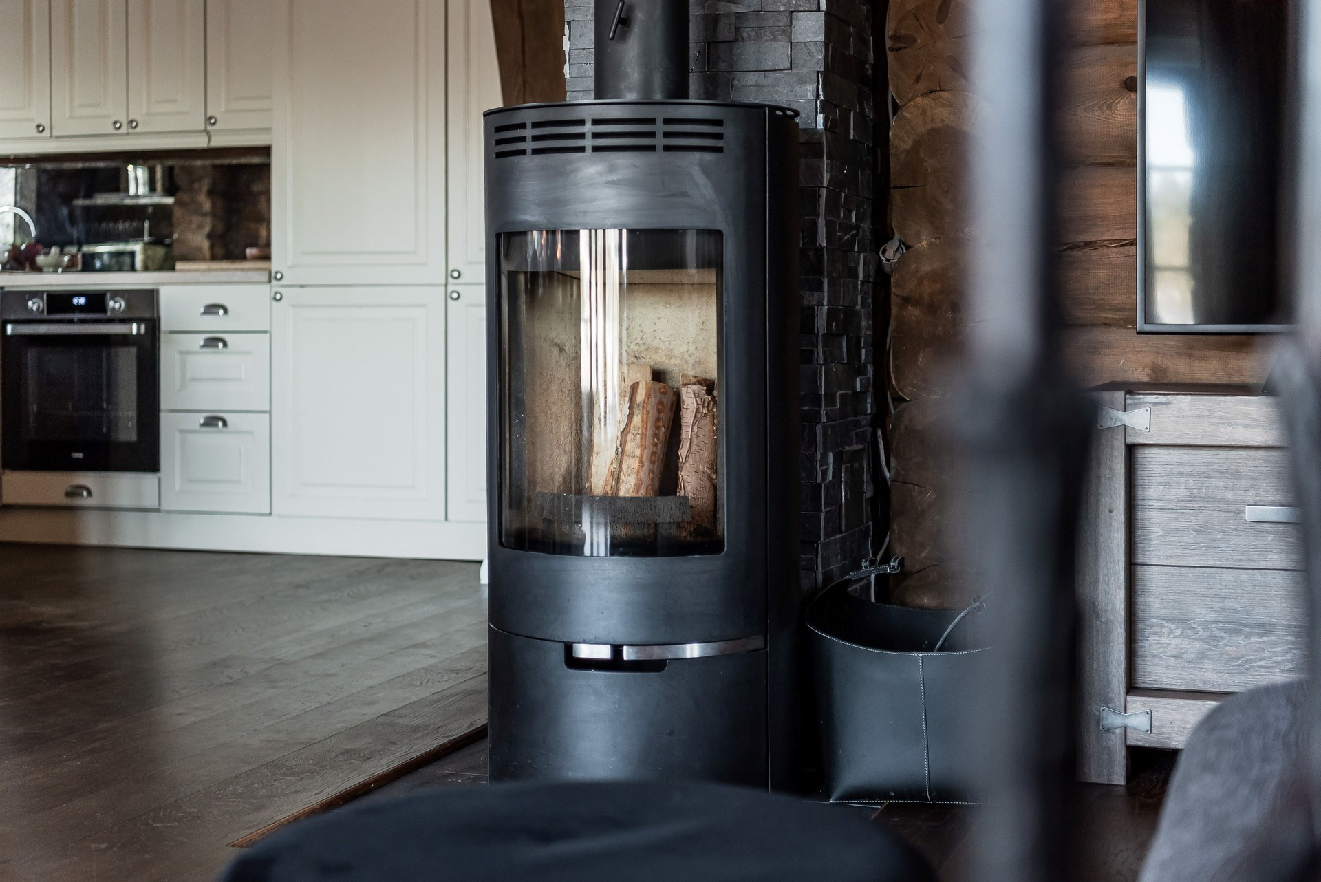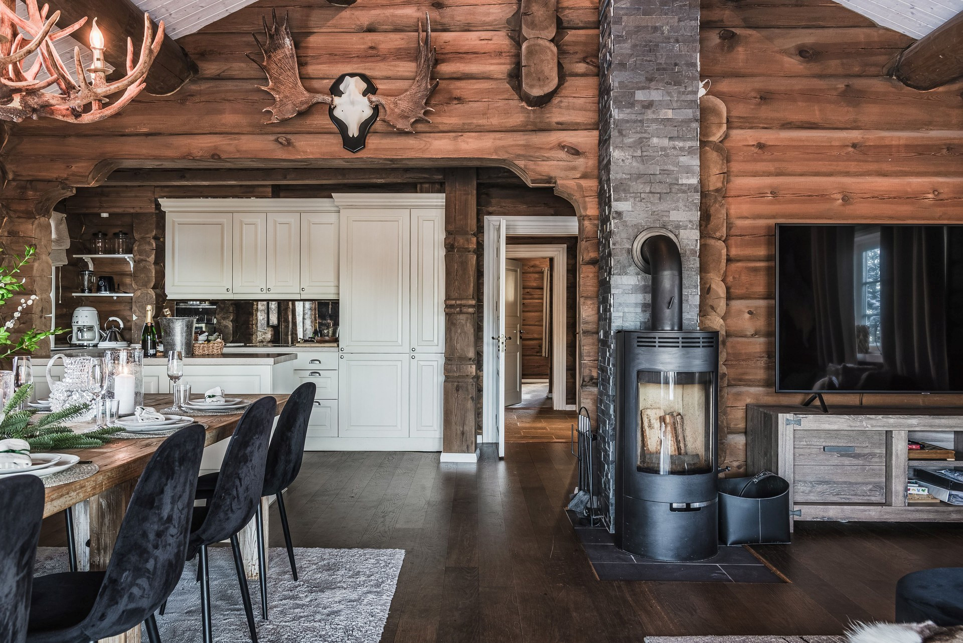 Köket har en öppen planlösning mot allrummet. Köket är utrustat med spishäll, spisfläkt, ugn, integrerad kyl/frys och diskmaskin. Massivt rökt ekgolv och timmerväggar.