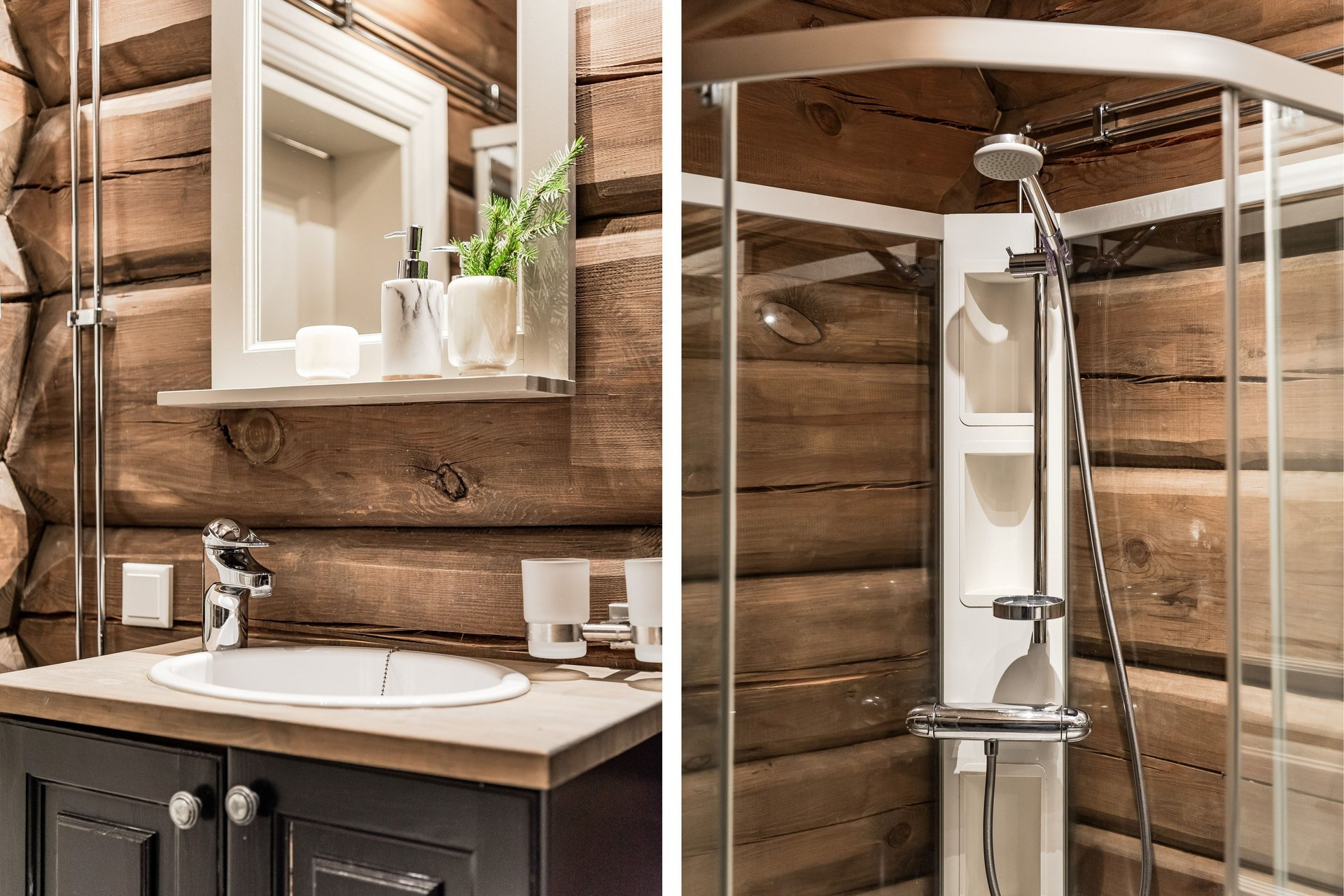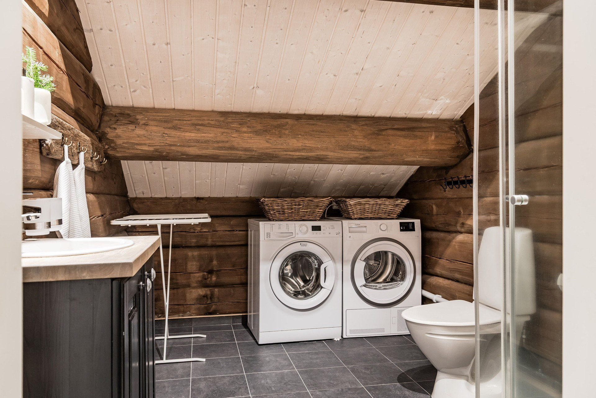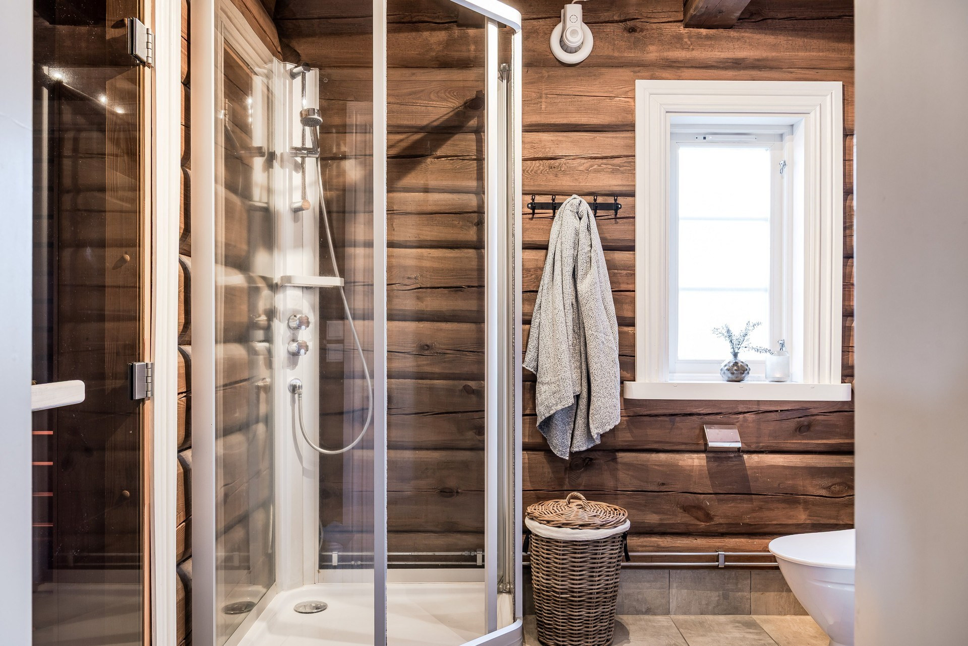 I detta snygga badrum ligger klinker på golvet och timmerväggar. Här finns toalett, handfat, duschkabin och en bastu.