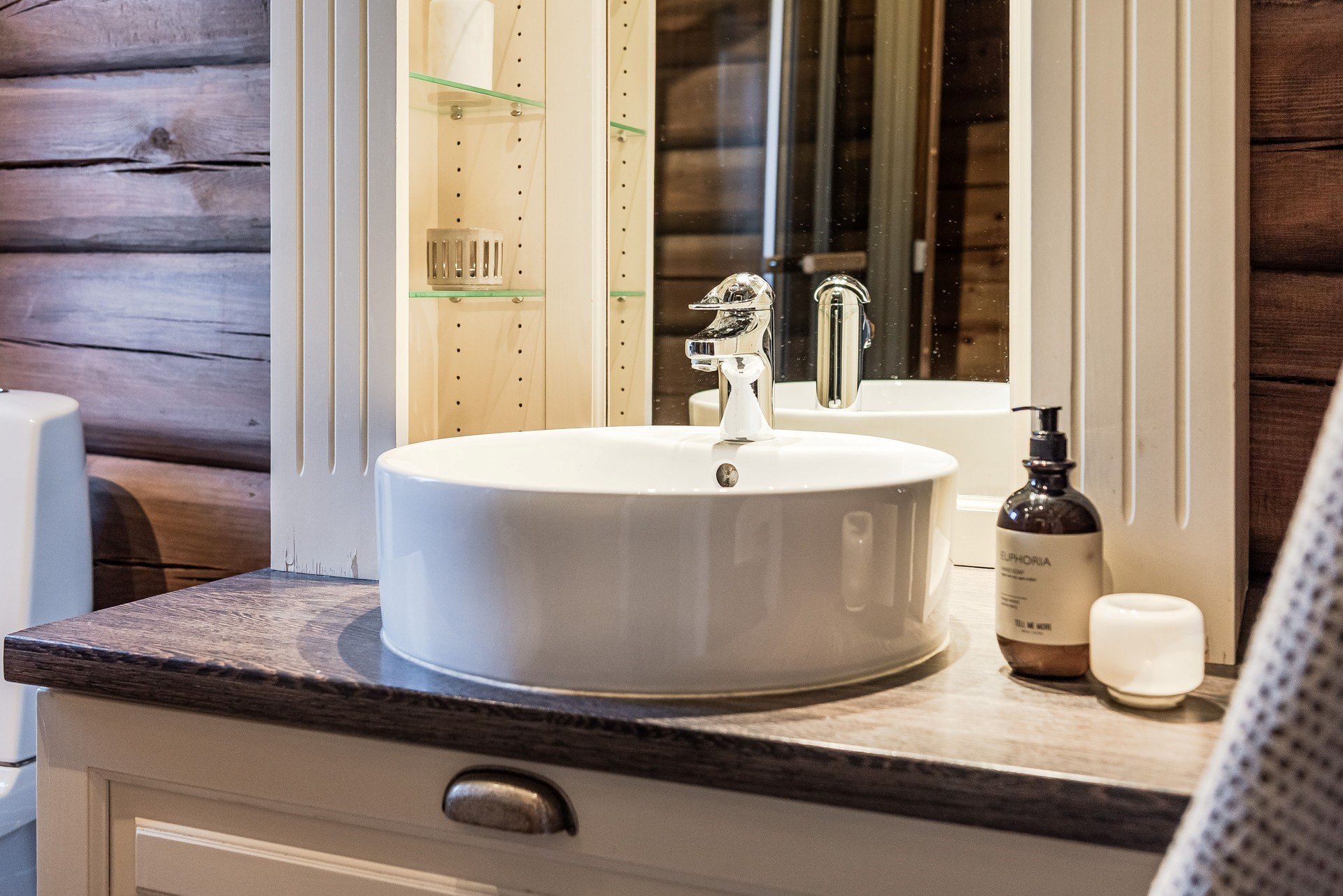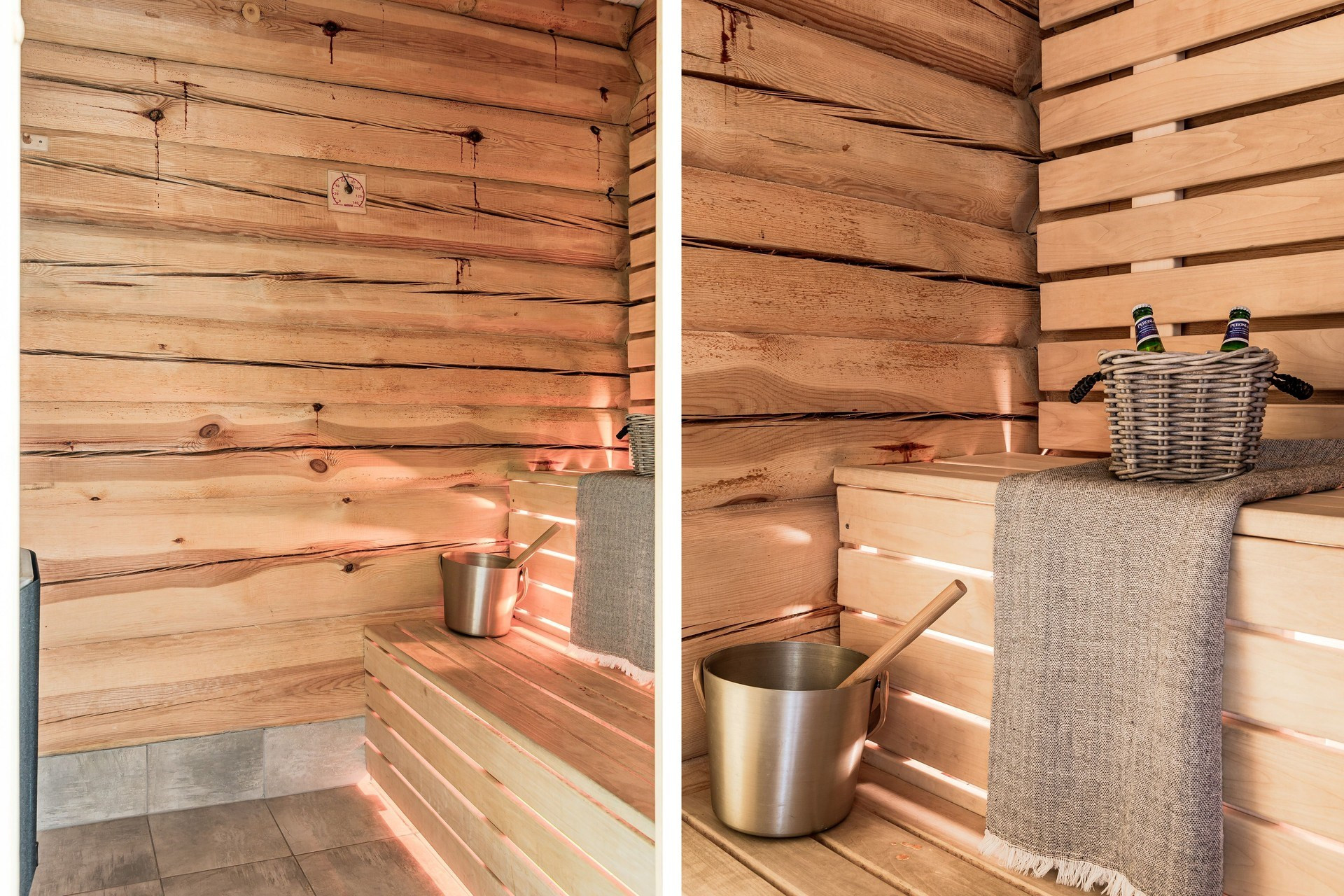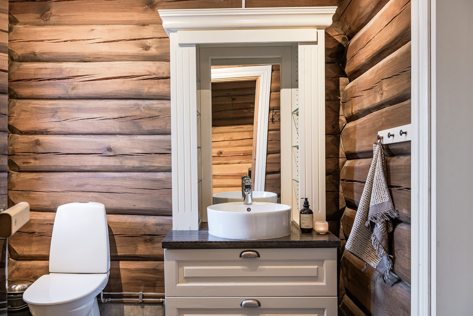 I detta snygga badrum ligger klinker på golvet och timmerväggar. Här finns toalett, handfat, duschkabin och en bastu.