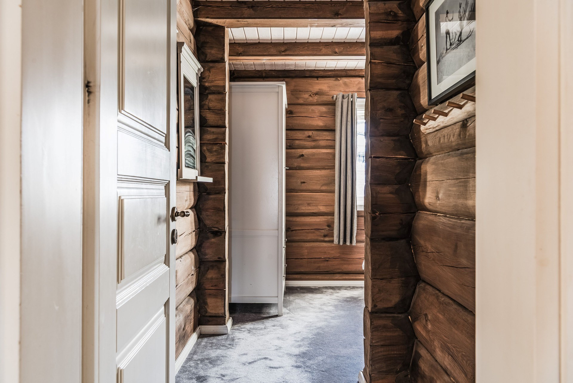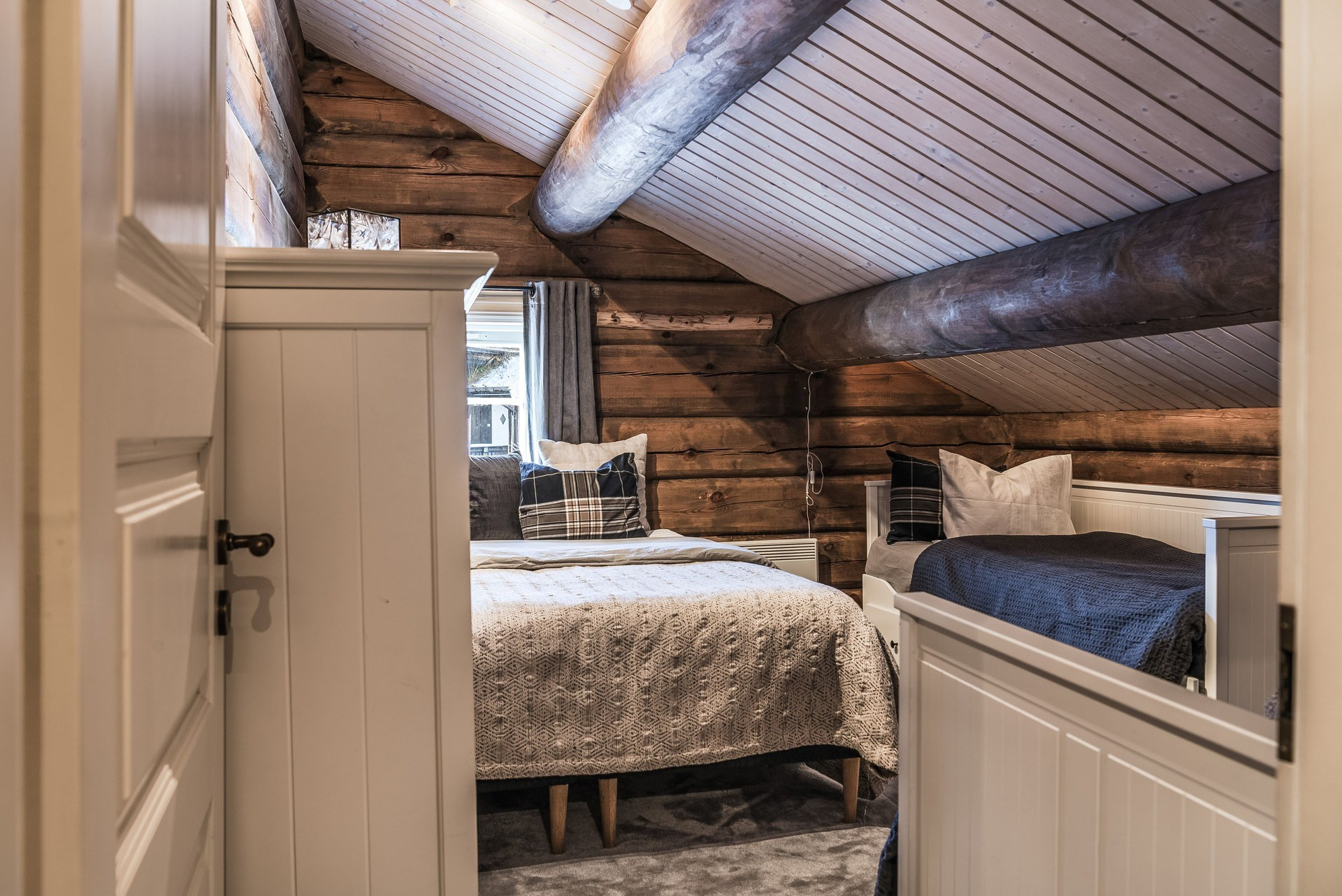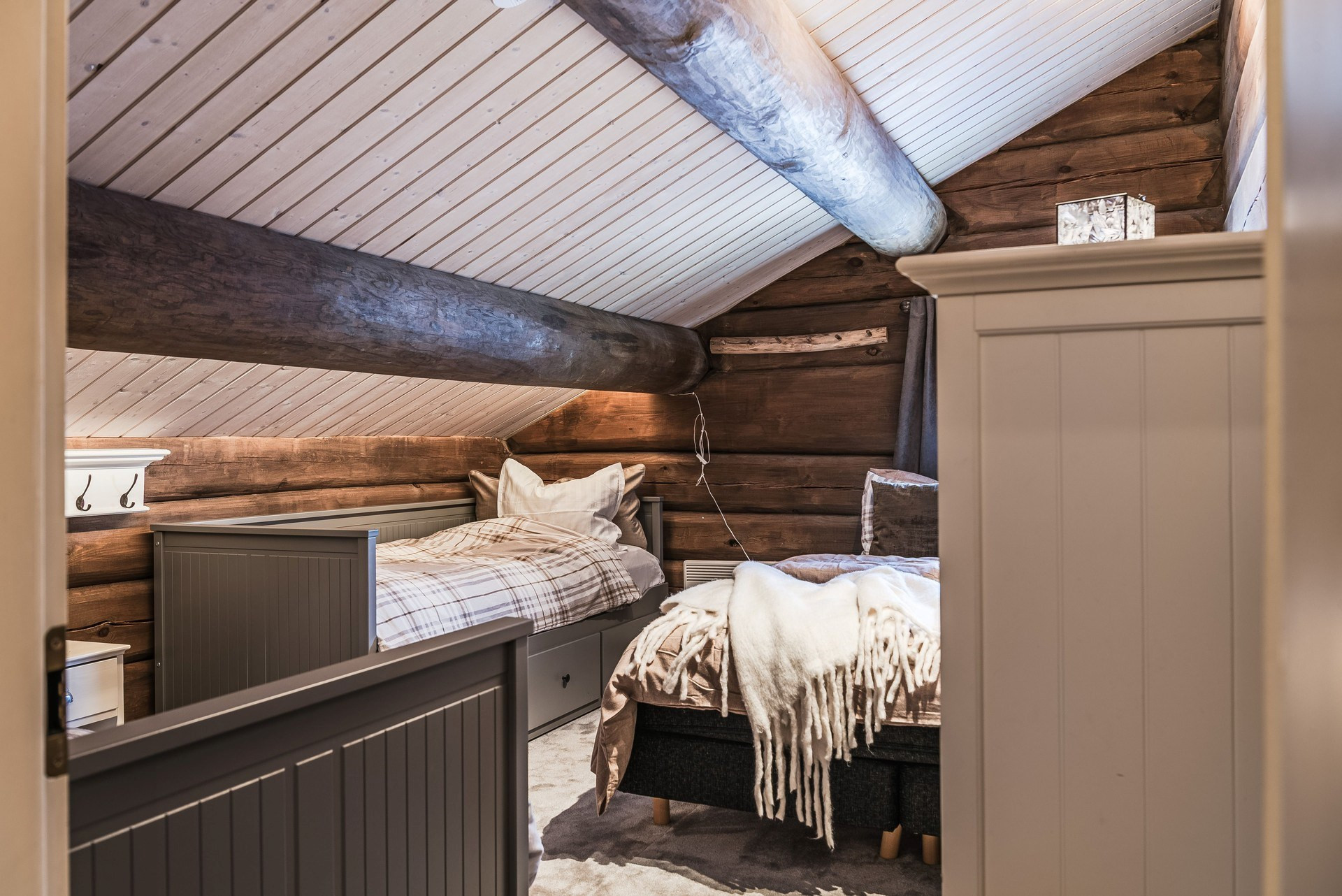 Ege matta och timmerväggar. Här finns familjesäng och två stycken garderober.