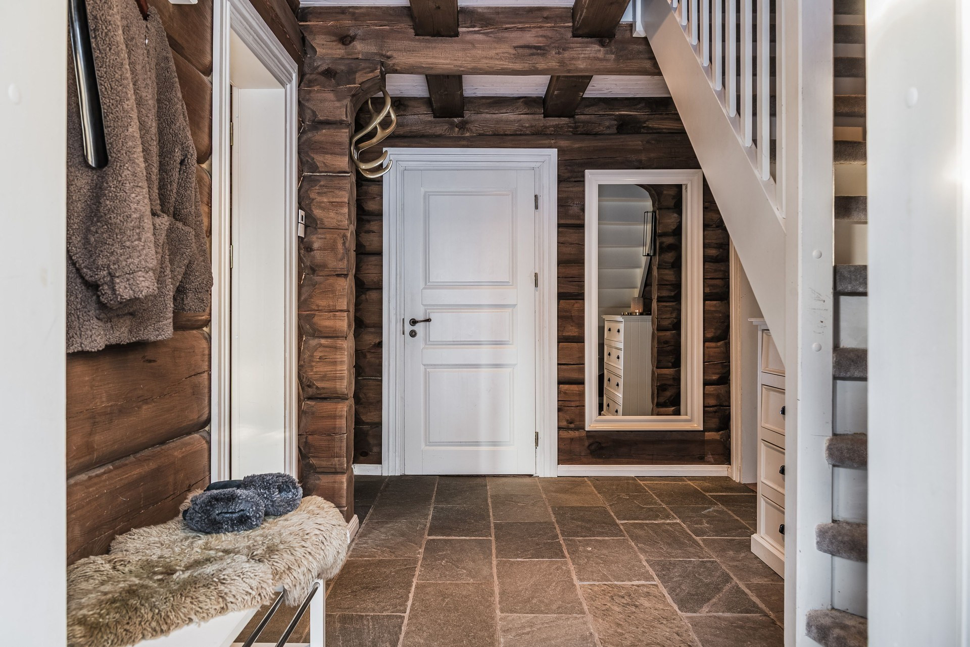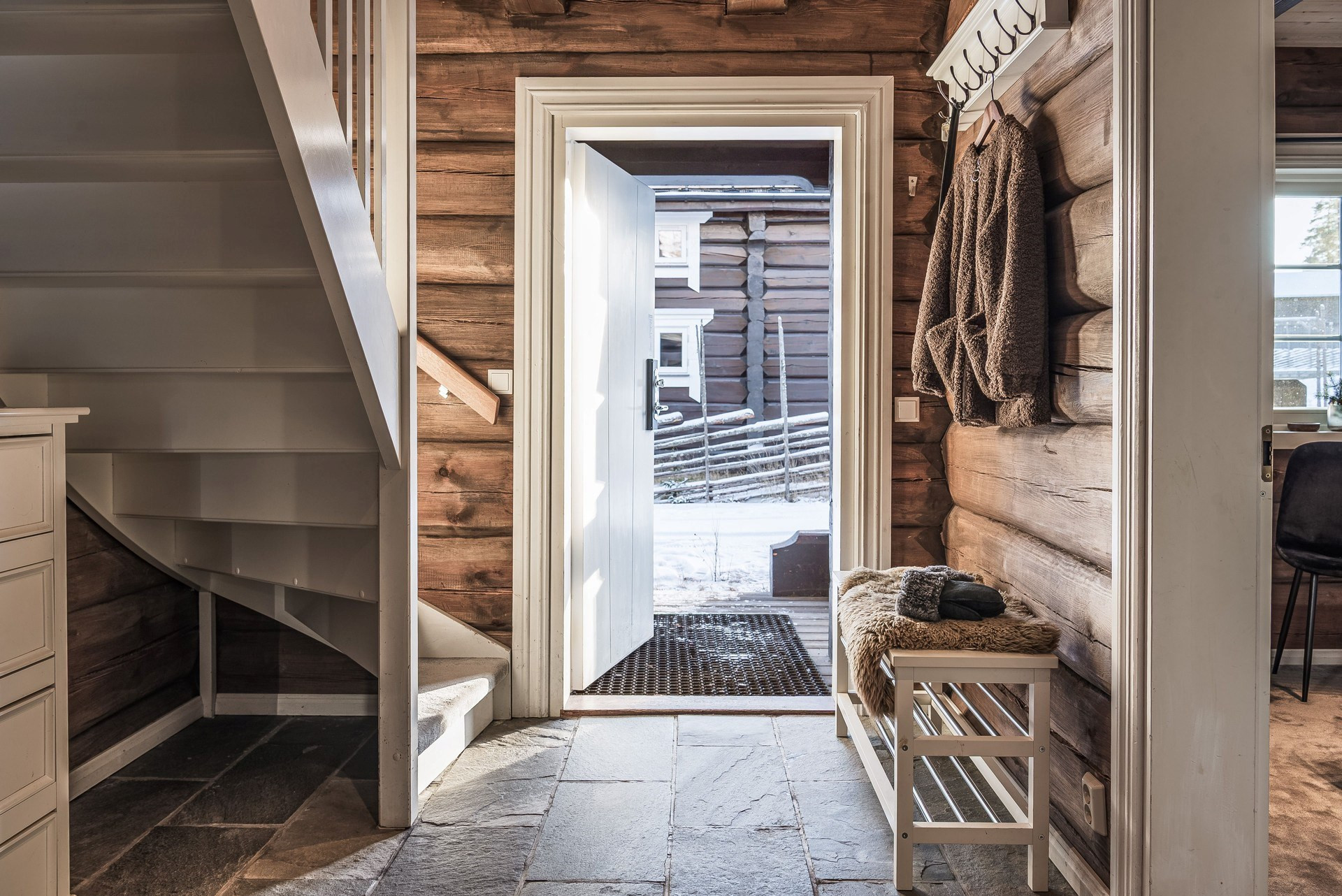 Rymlig hall med plats för avhängning. Här ligger skiffergolv och timmerväggar.