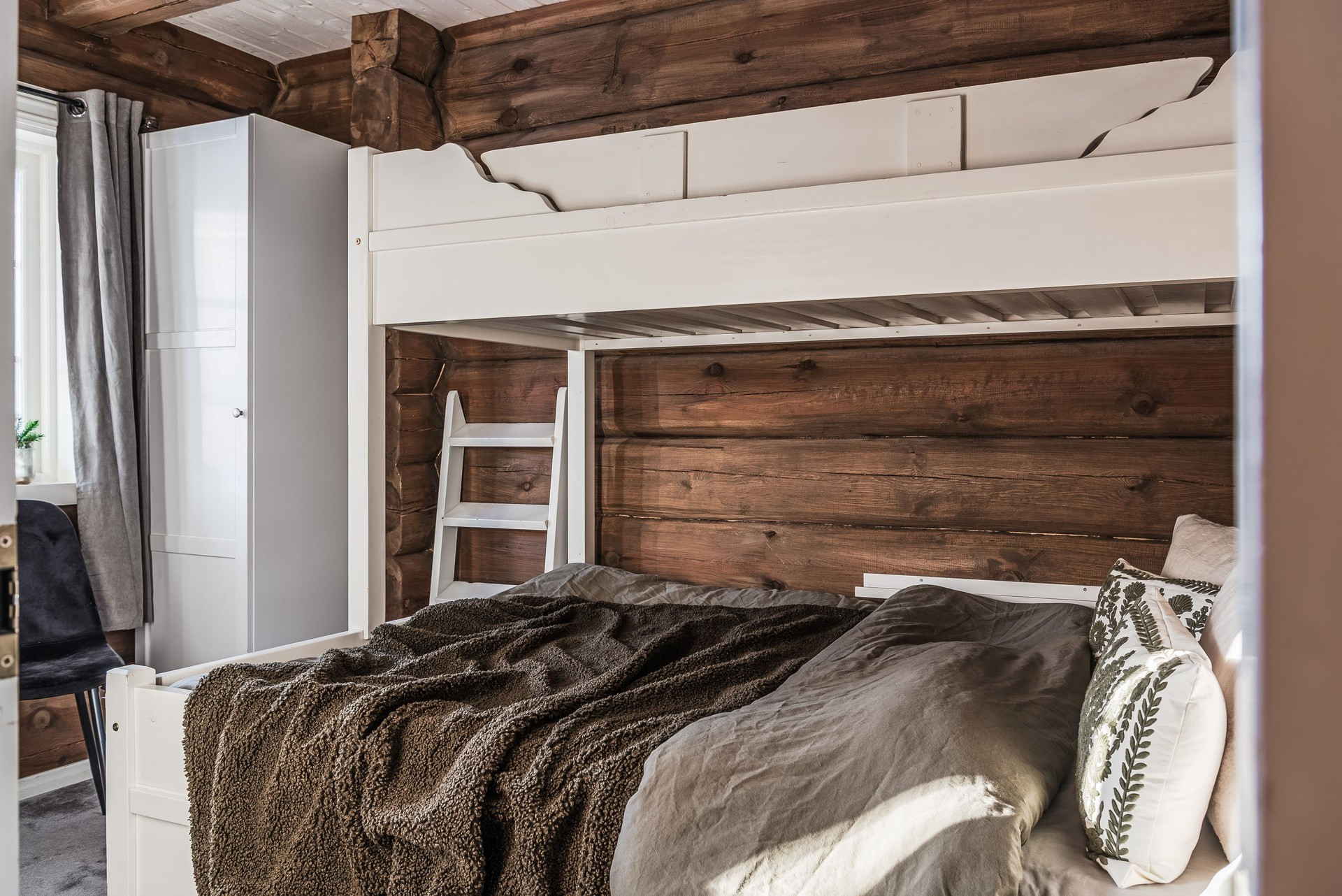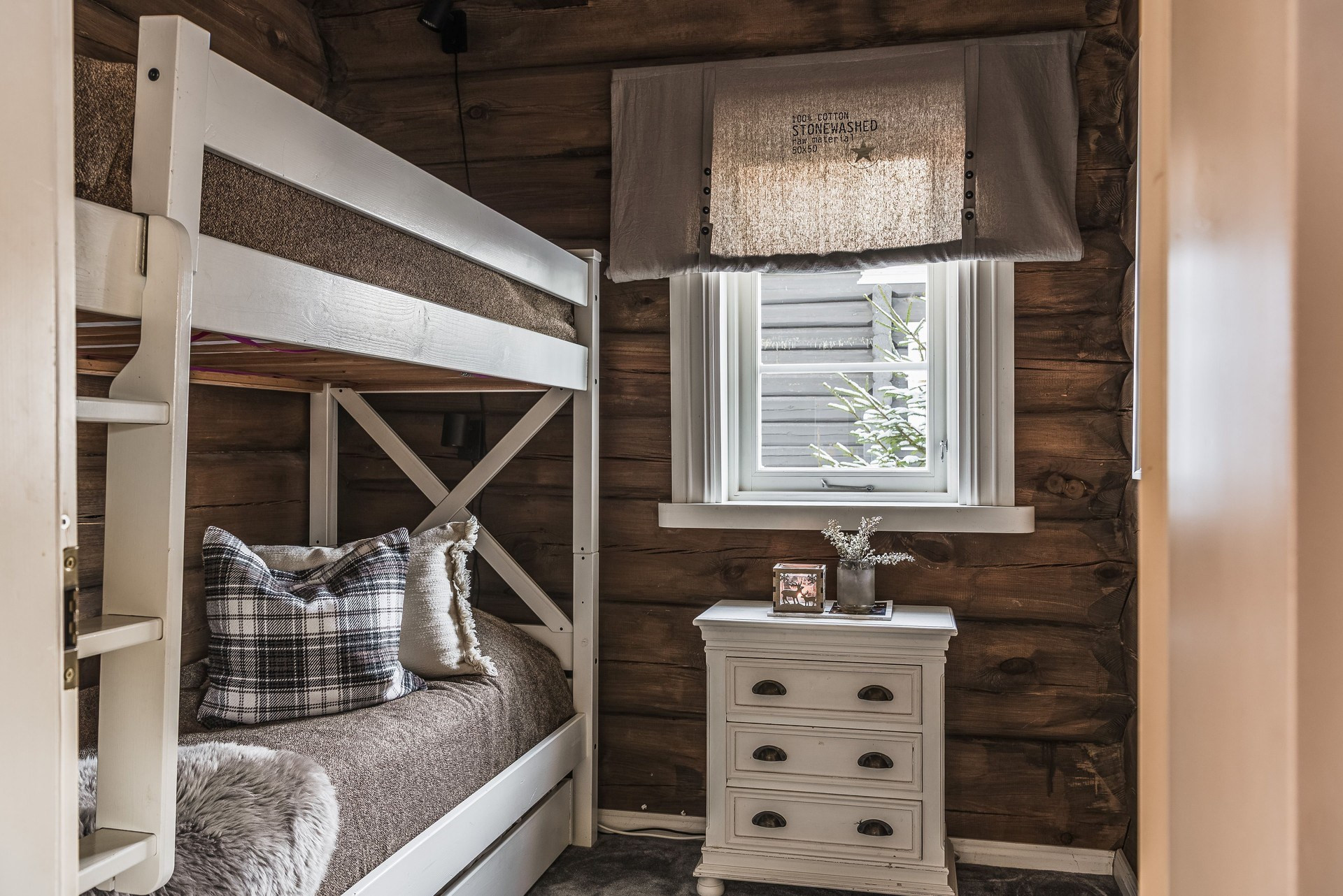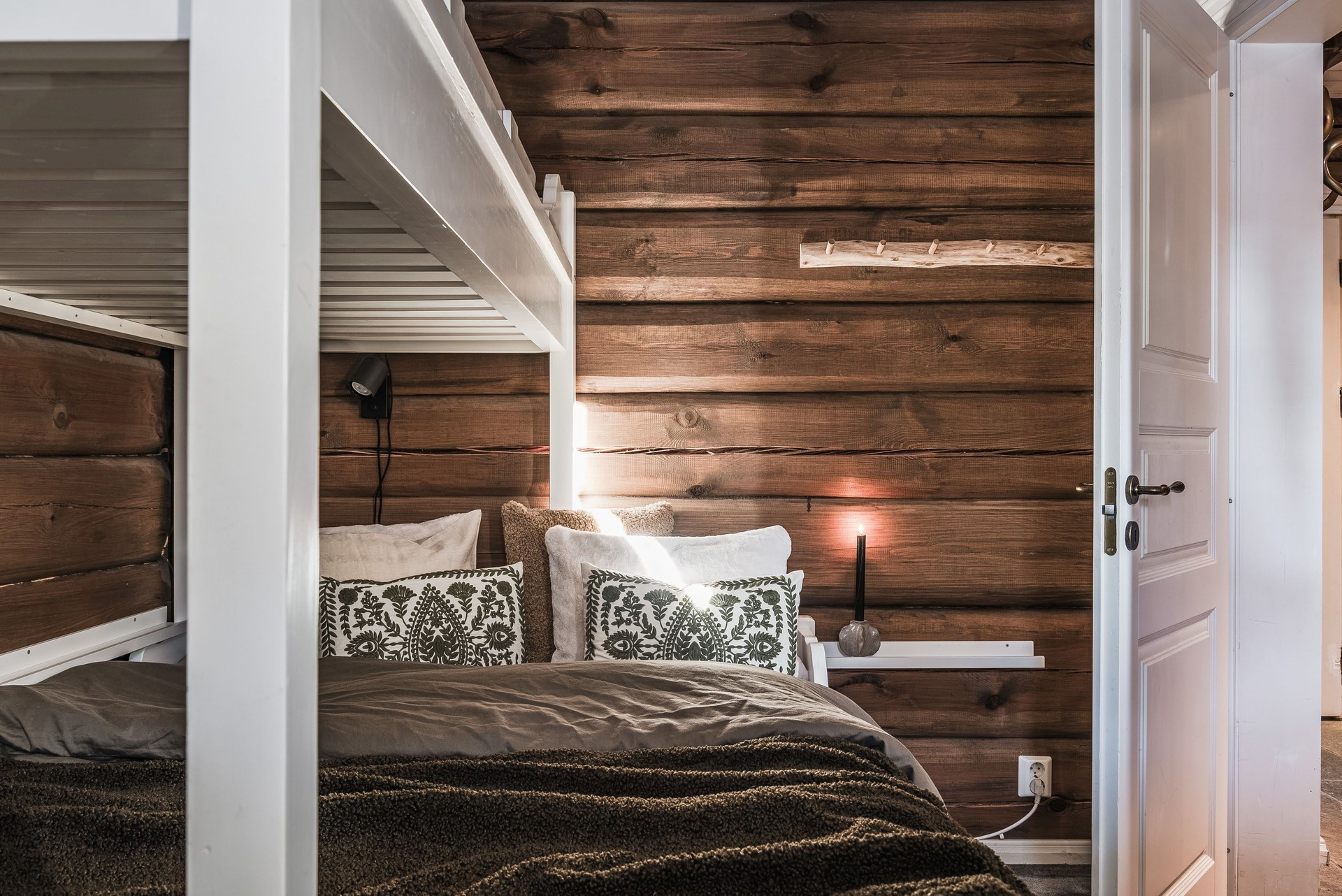 Våningssäng. Ege matta och timmerväggar.