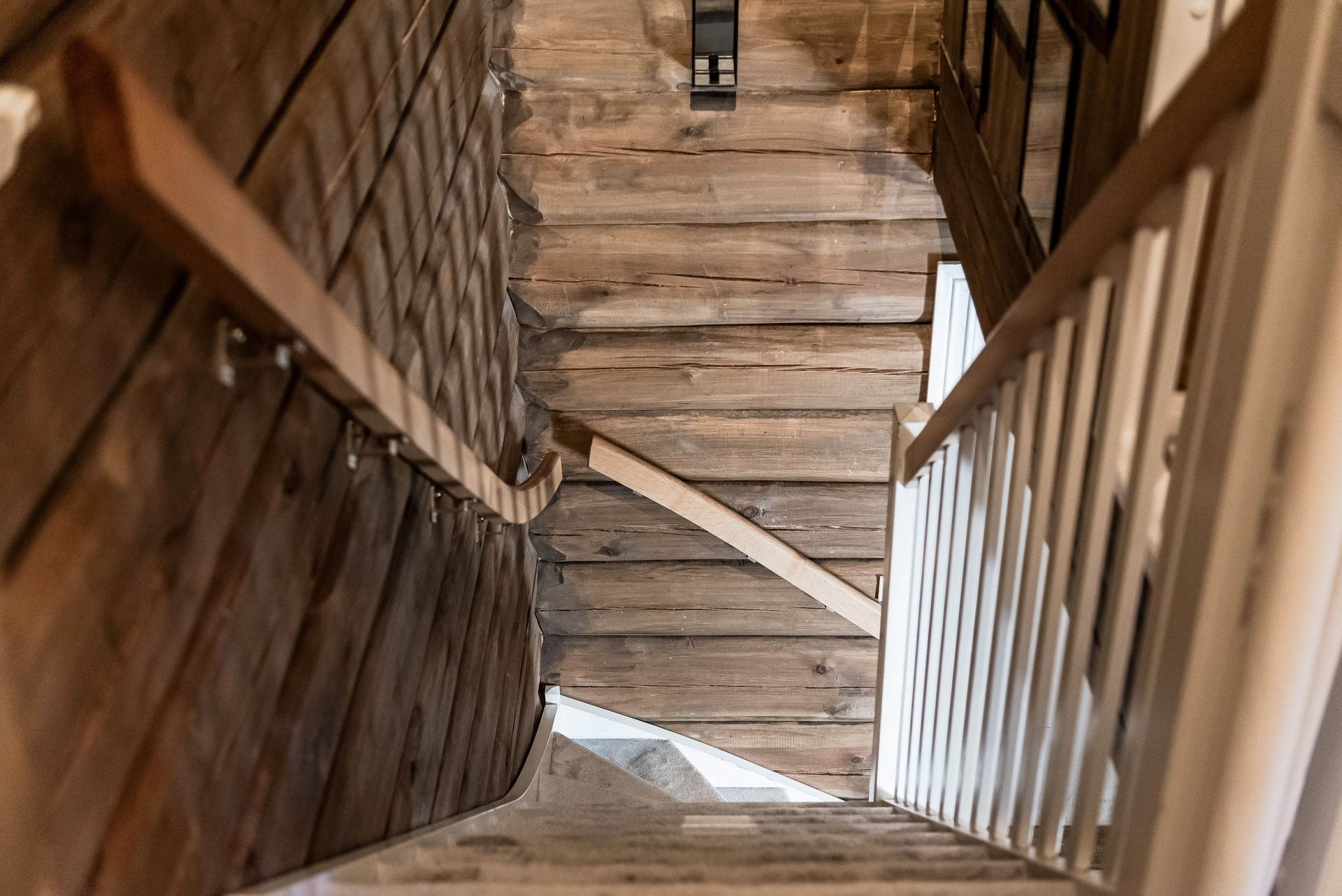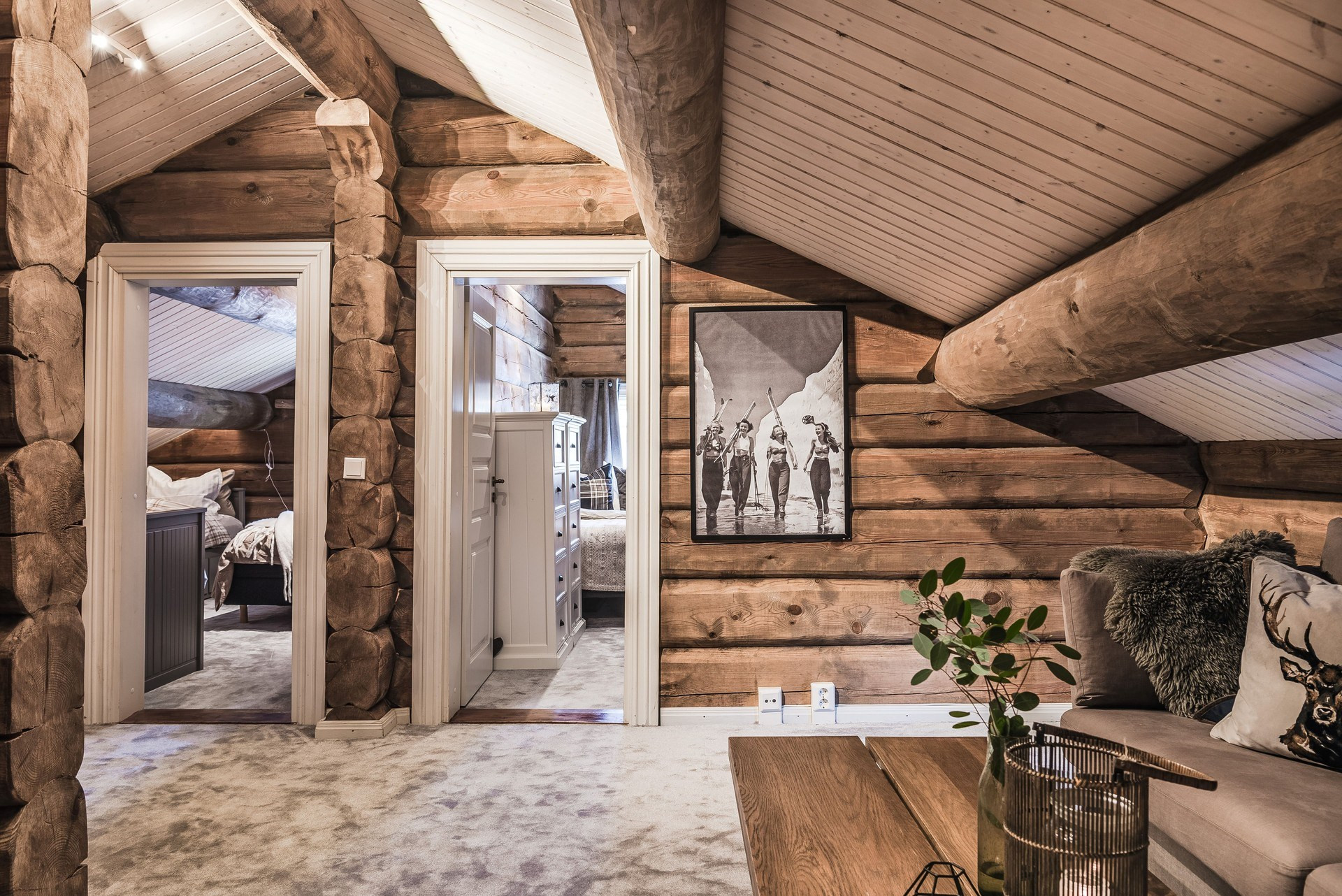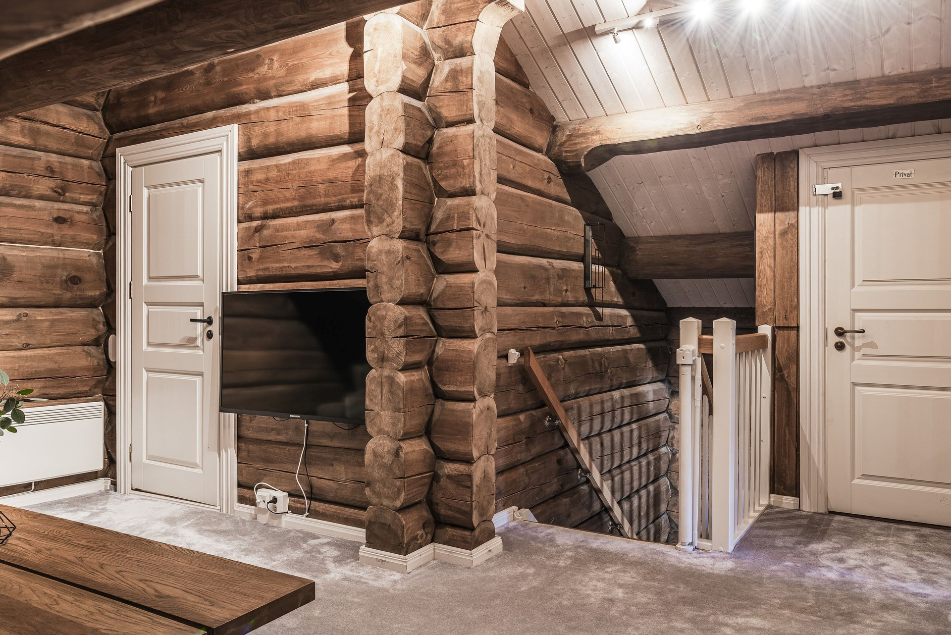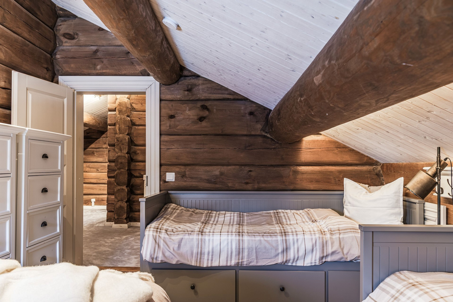 Våningssäng. Ege matta och timmerväggar.