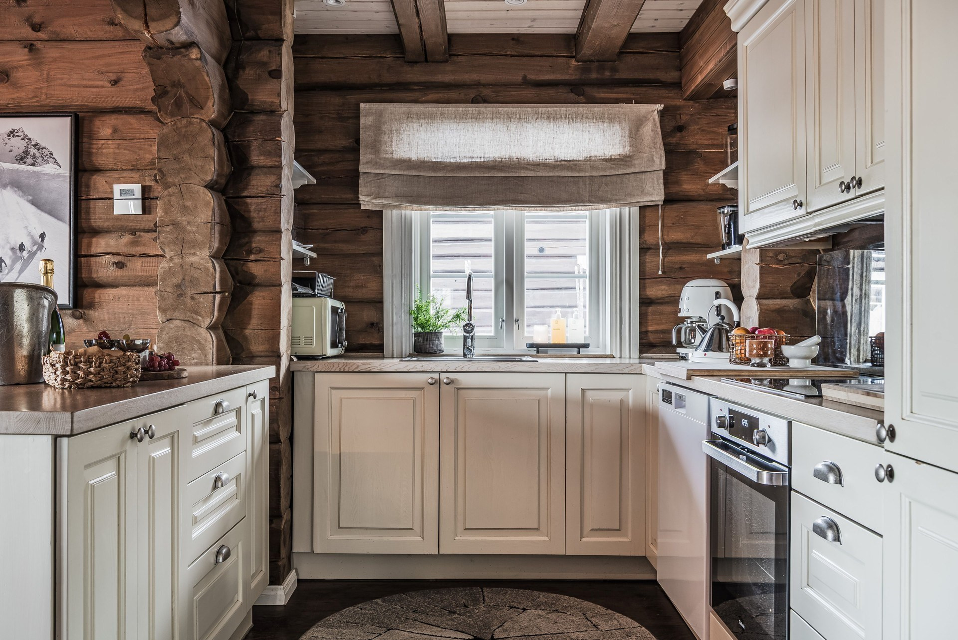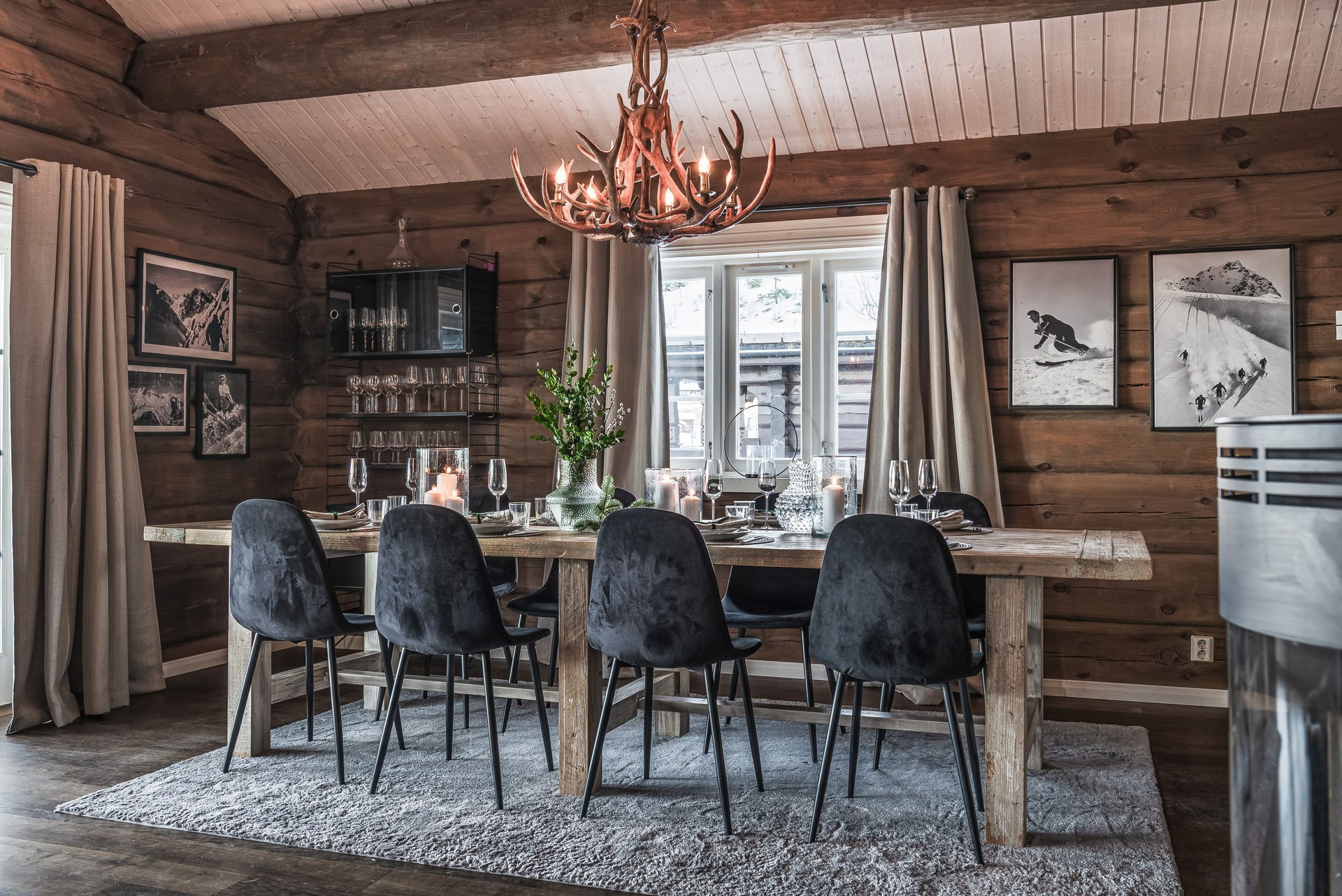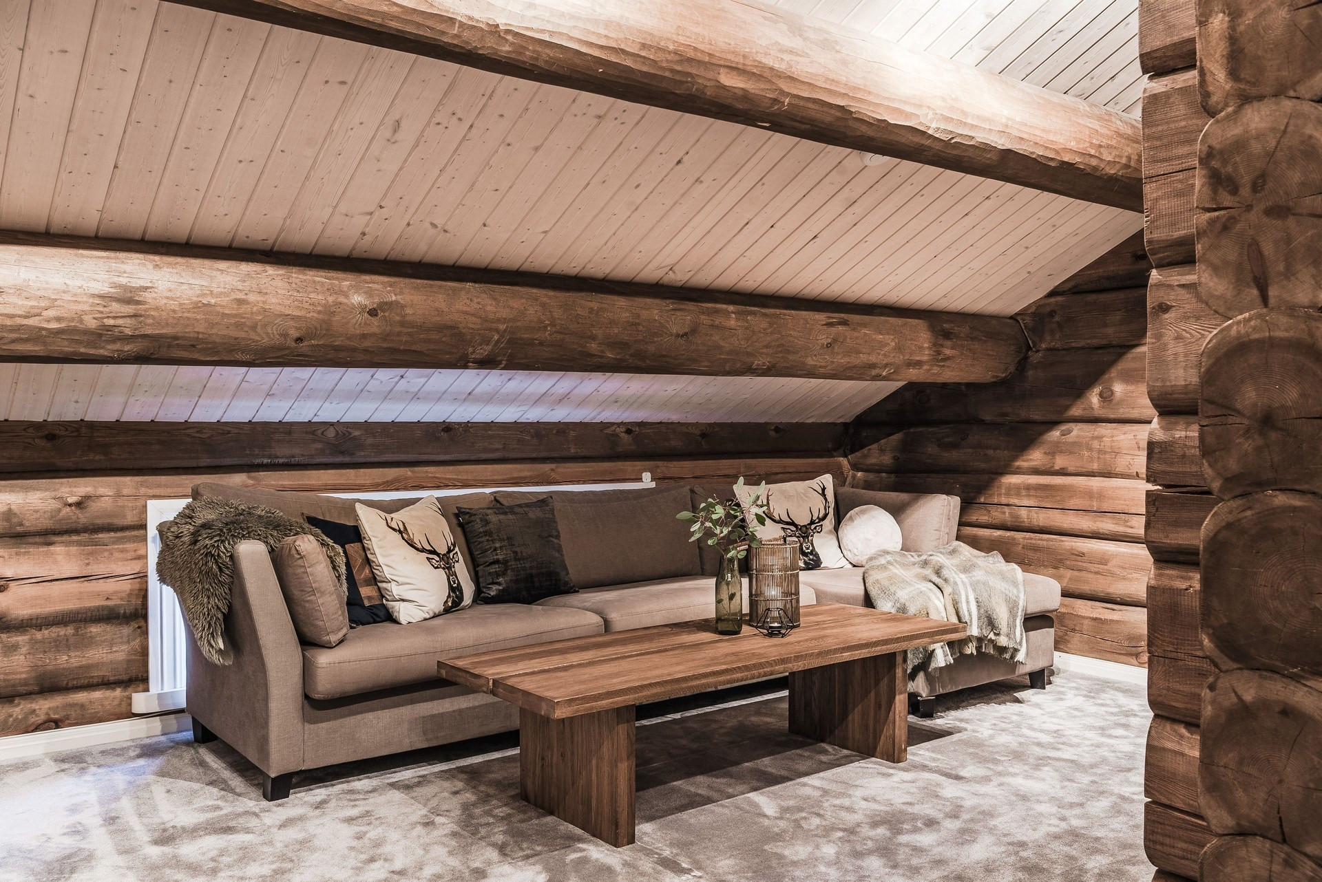Här ligger en ege matta på golv och timmerväggar.