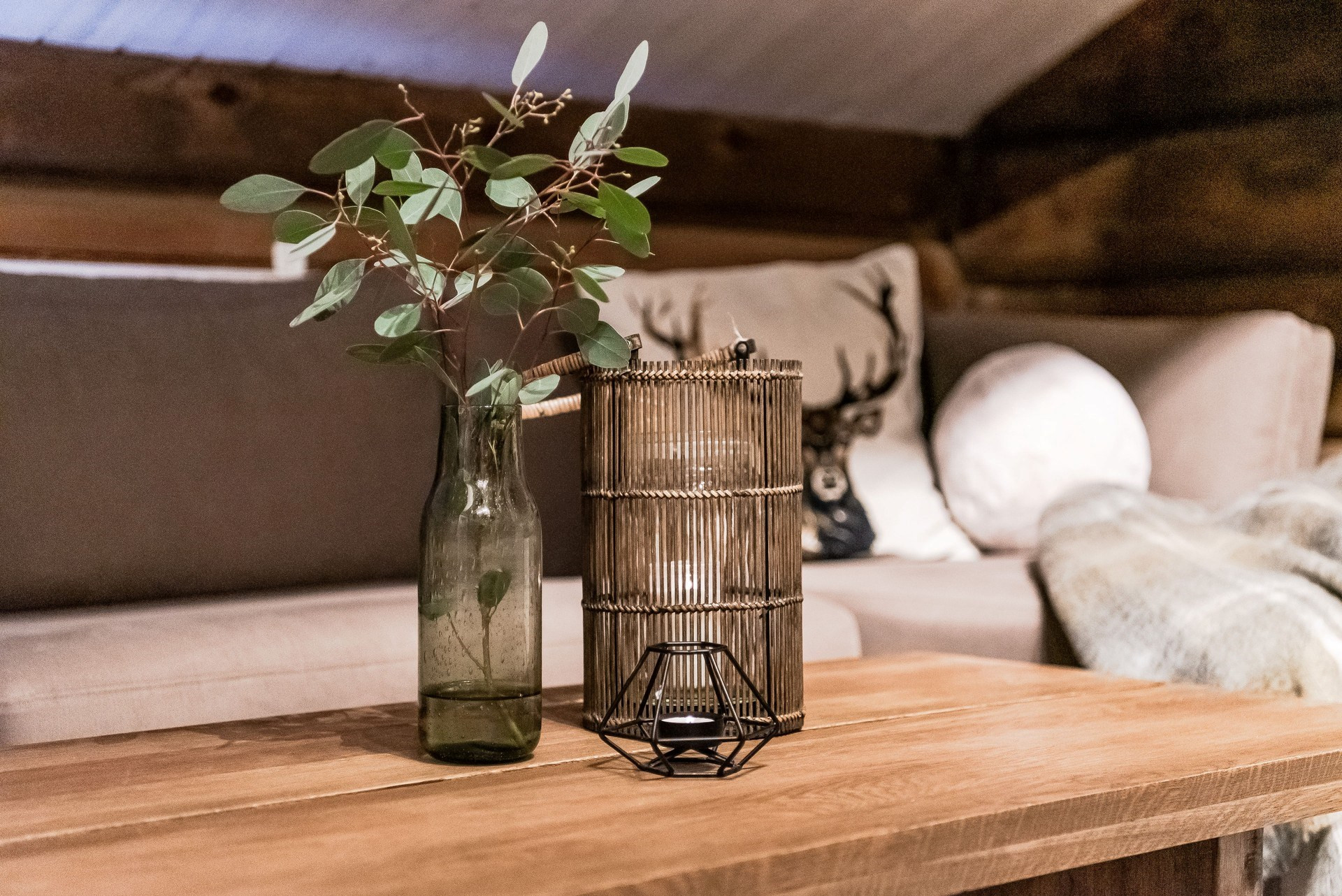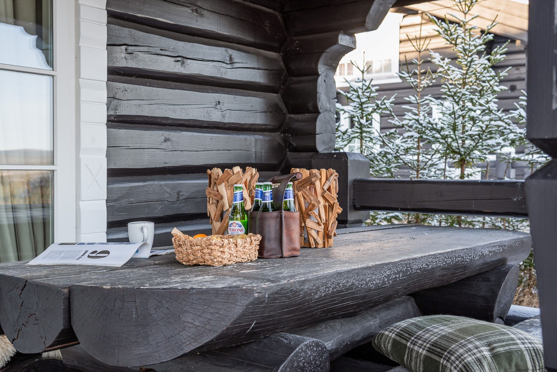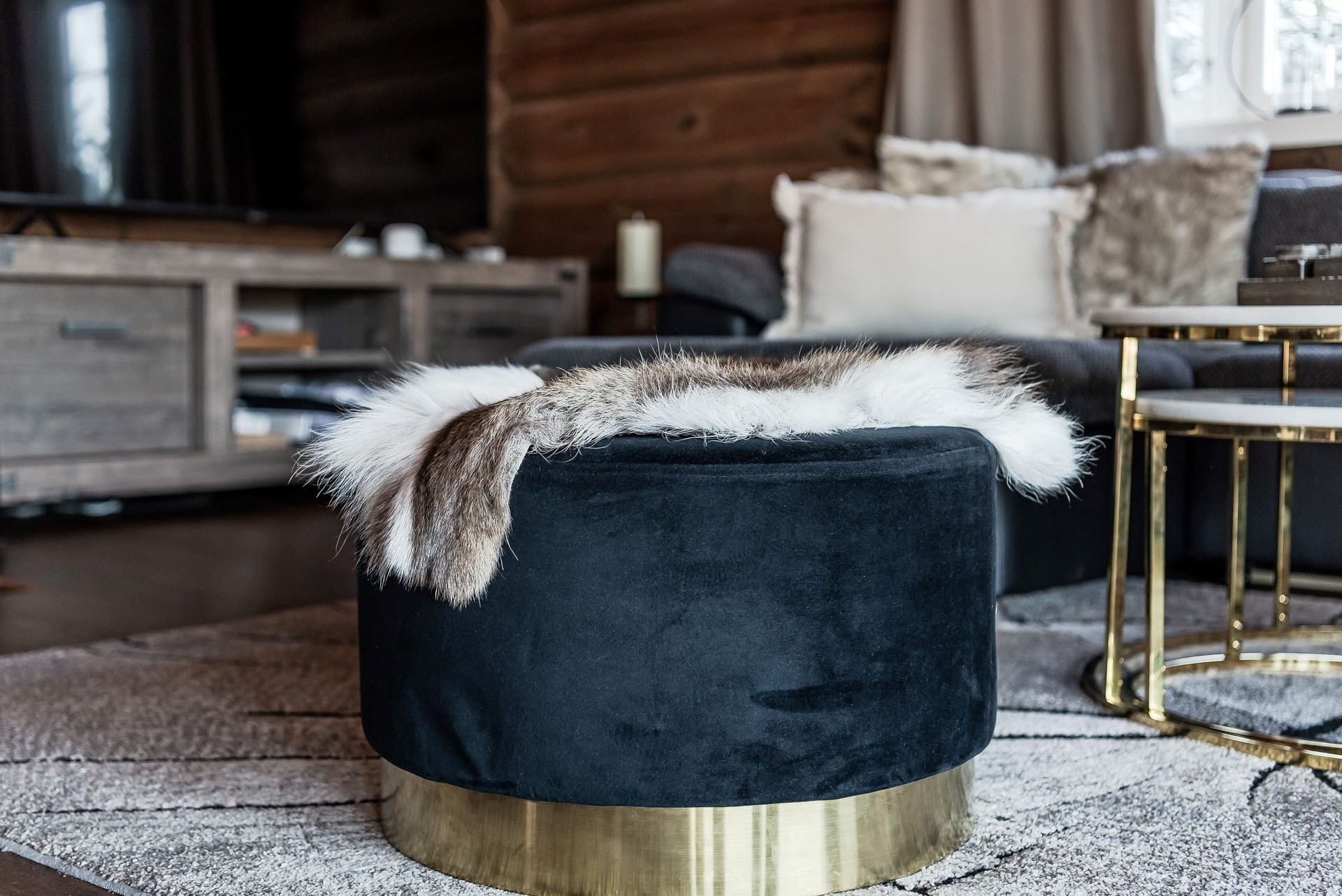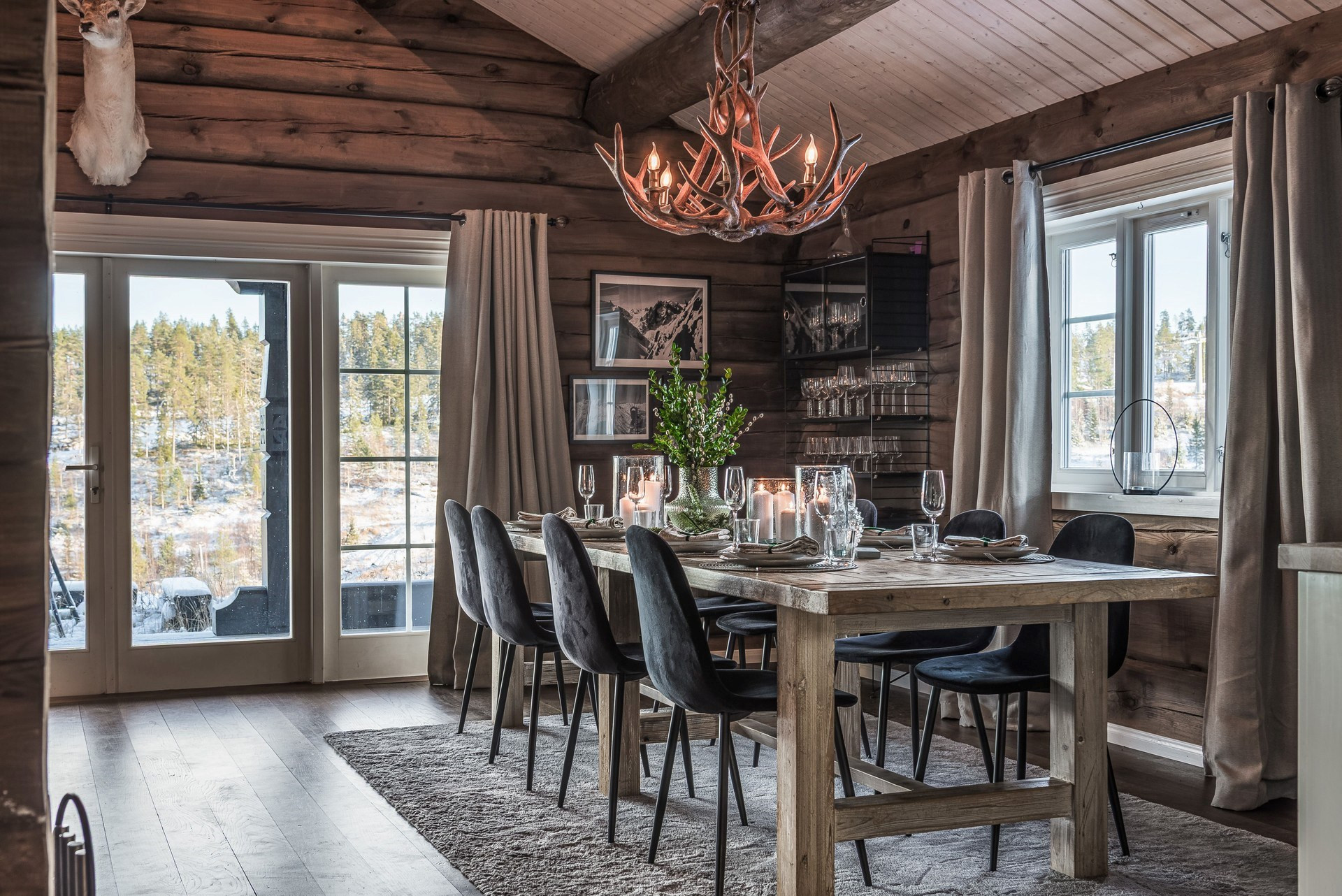 Här ligger en ege matta på golv och timmerväggar.