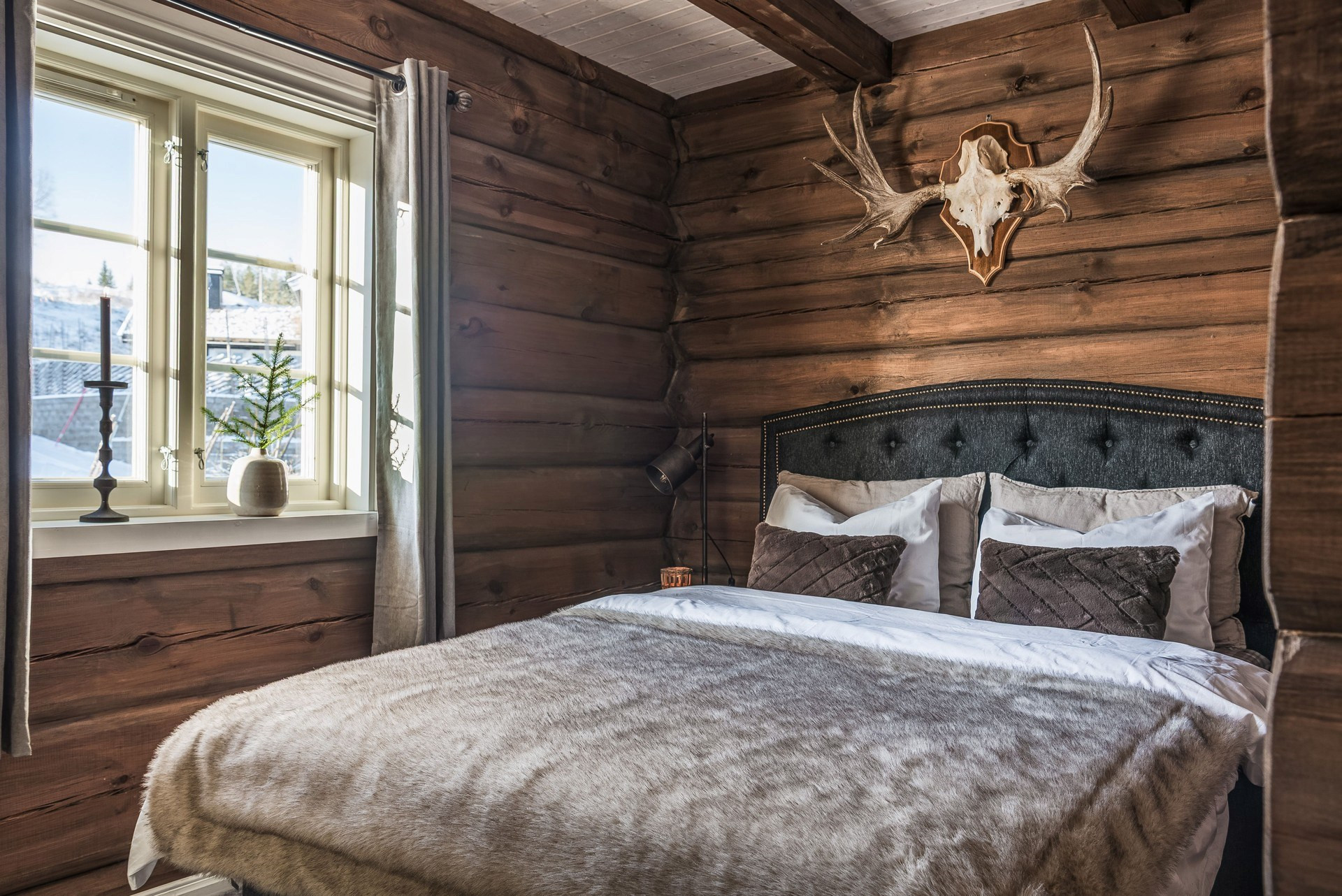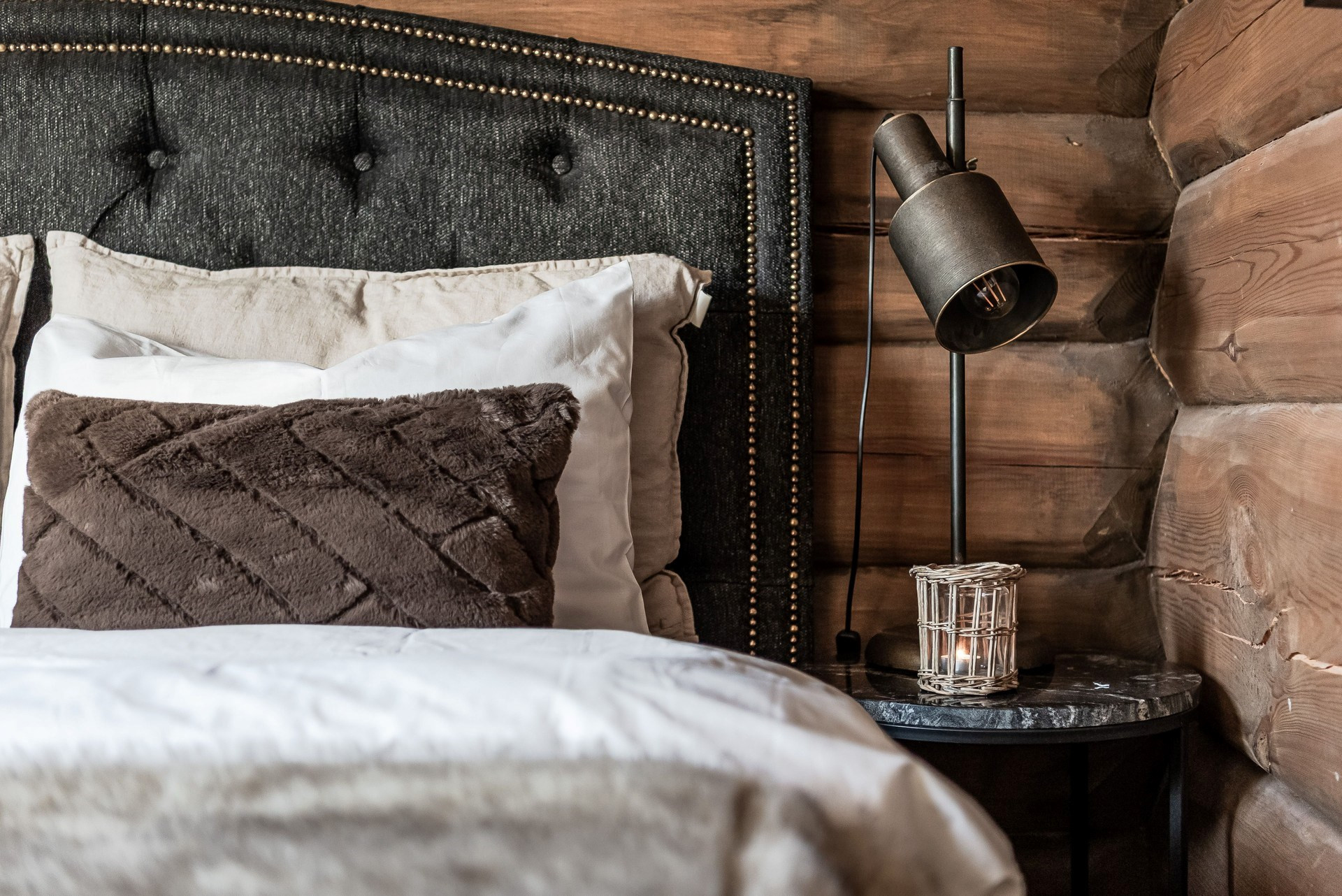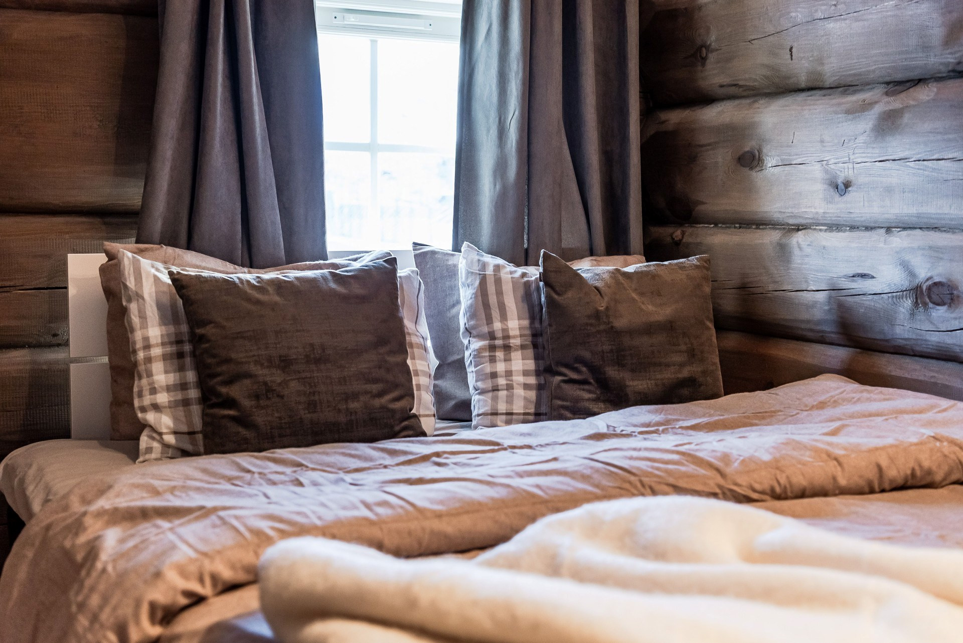 Här ligger ege matta och timmerväggar. Plats för dubbelsäng.