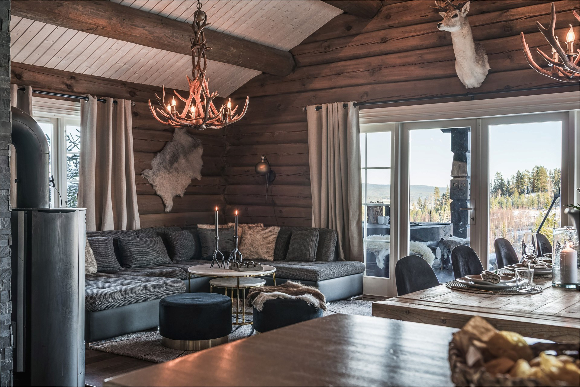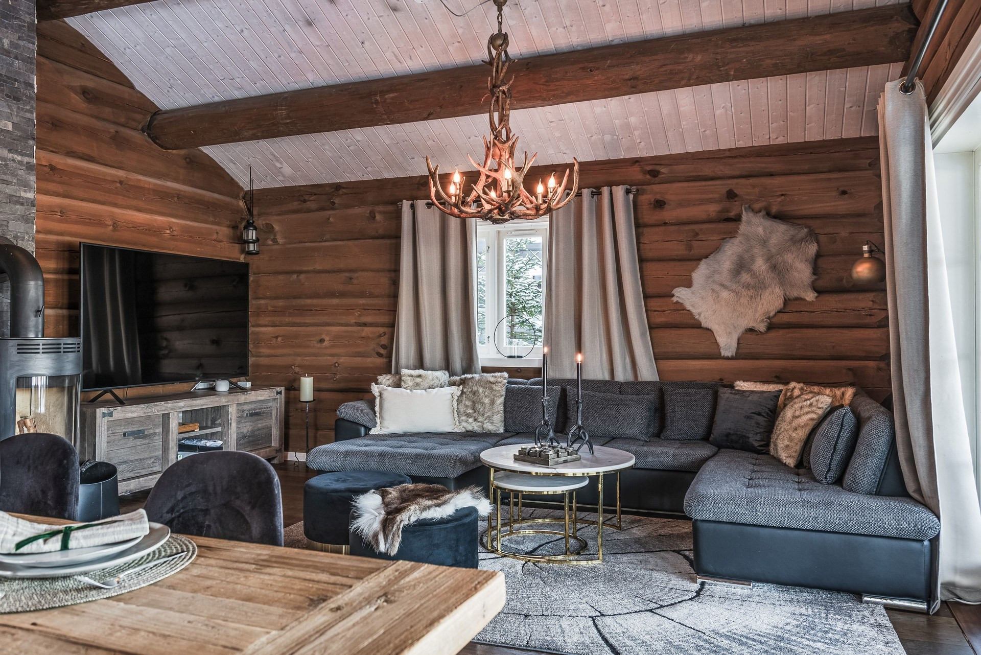 Ljust allrum med stora glaspartier mot skidbacken. Ryggåstak ger en otrolig känsla av rymd. Från allrummet nås altanen som erbjuder en underbar utsikt. I allrummet finns gott om plats för den stora soffan men även ett större matbord. Här finns även en braskamin som höjer mysfaktorn. Massivt rökt ekgolv och timmerväggar.
