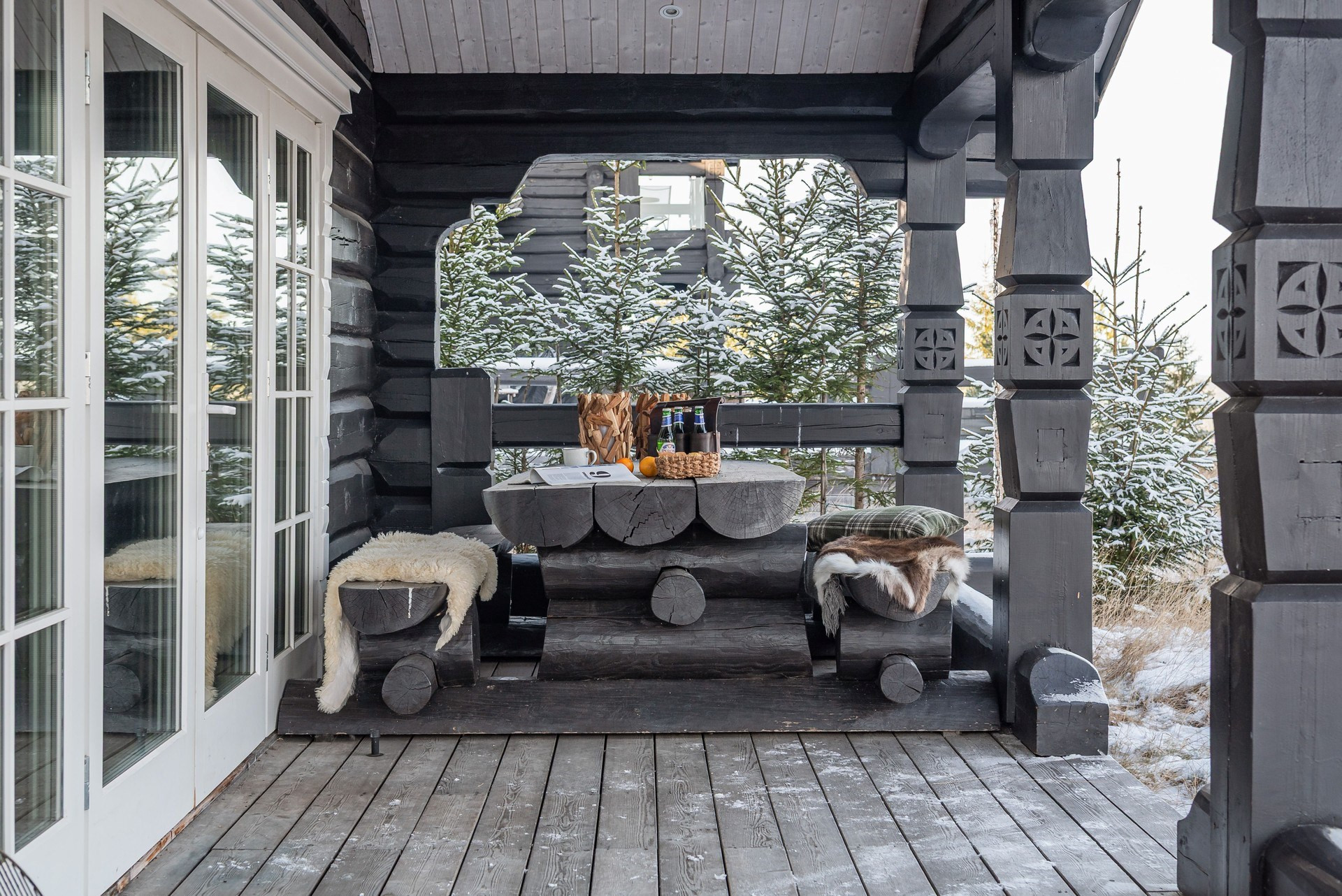 Altan under tak med timmermöbel och eldplats strax utanför.TV- och internetanslutning