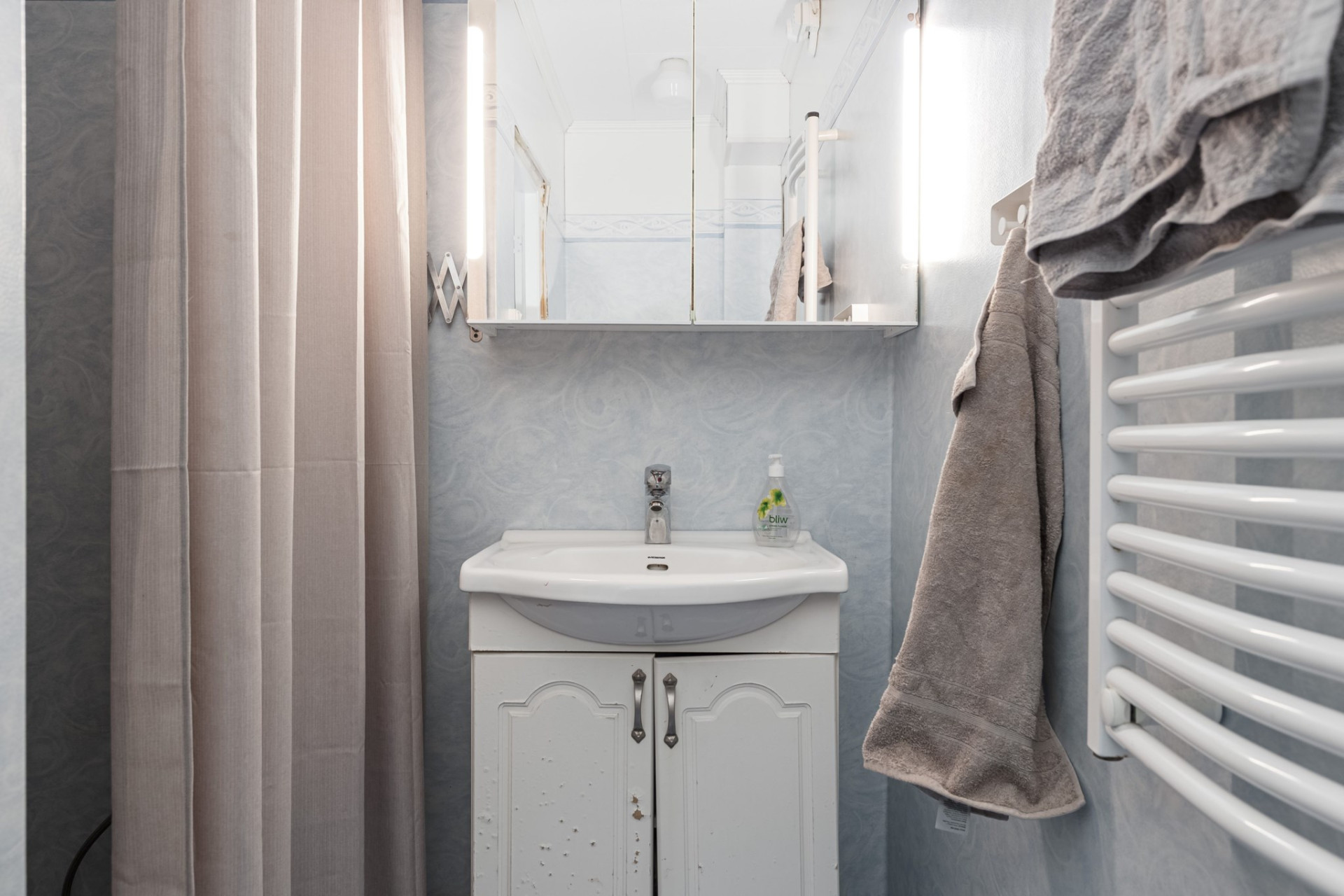 Rymligt badrum med våtrumsmatta på golv och väggar. Utrustat med wc, tvättställ med kommod samt dusch.