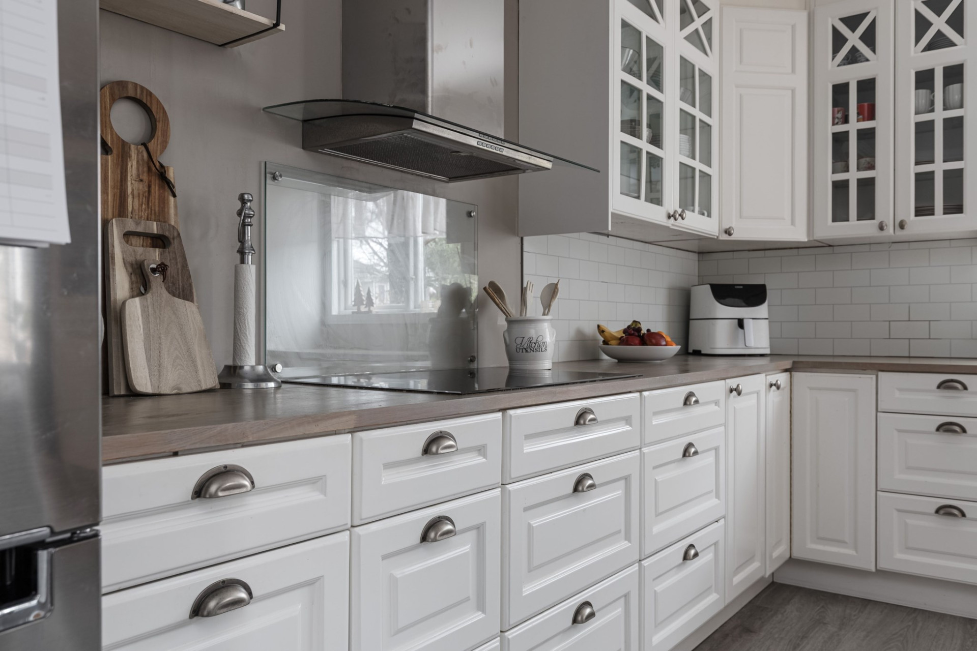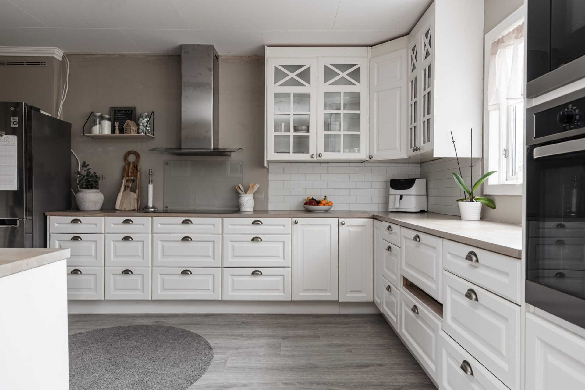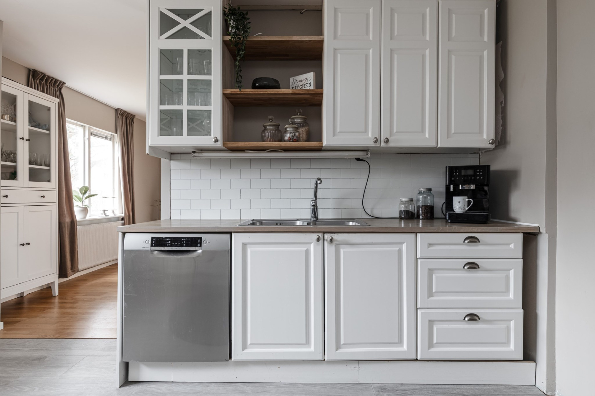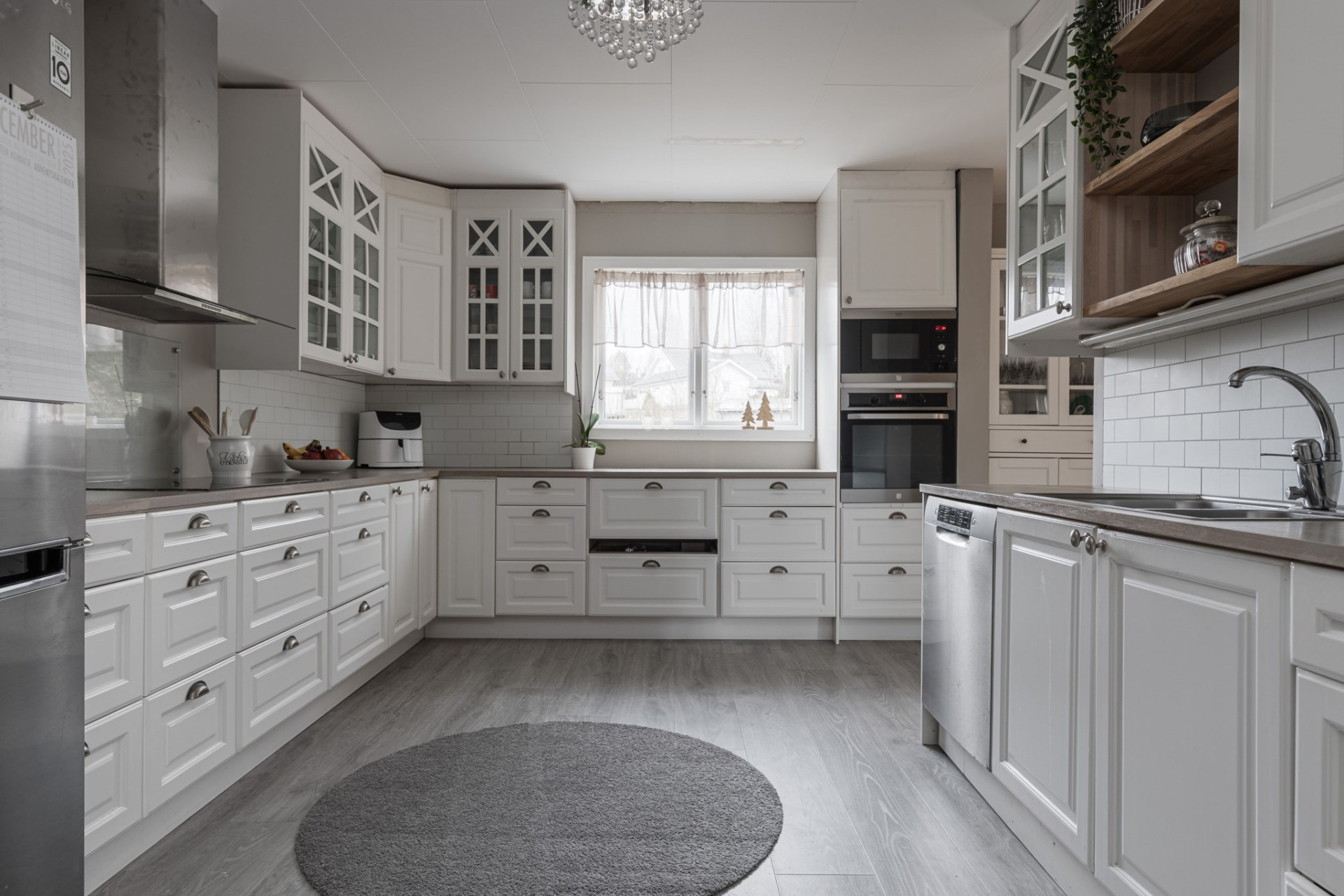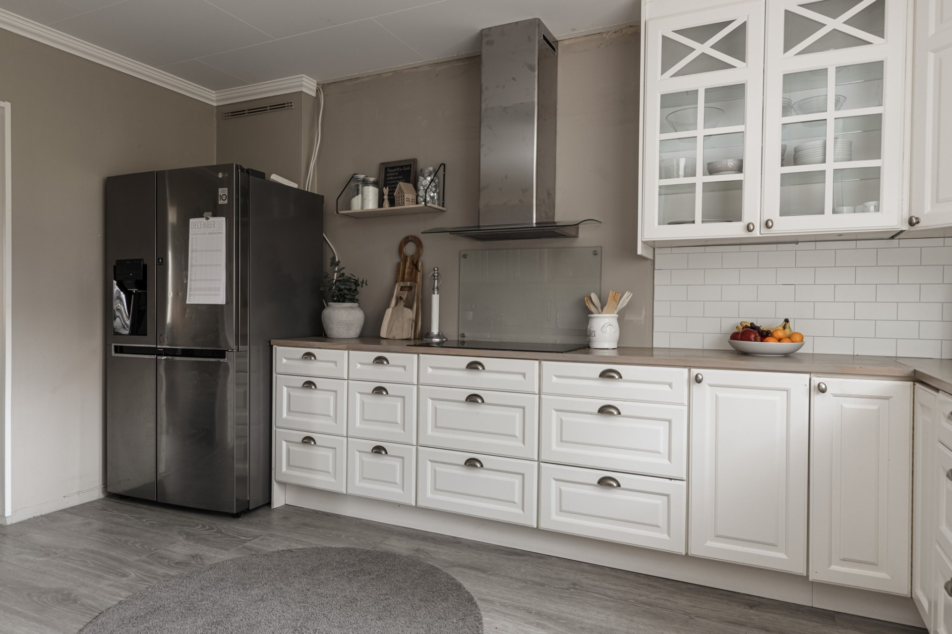 Nytt modernt kök i en vit kulör, goda förvaringsmöjligheter! Den maskinella utrustningen består av kyl/frys, spis/ugn, spisfläkt och diskmaskin. Nya vitvaror och golv.