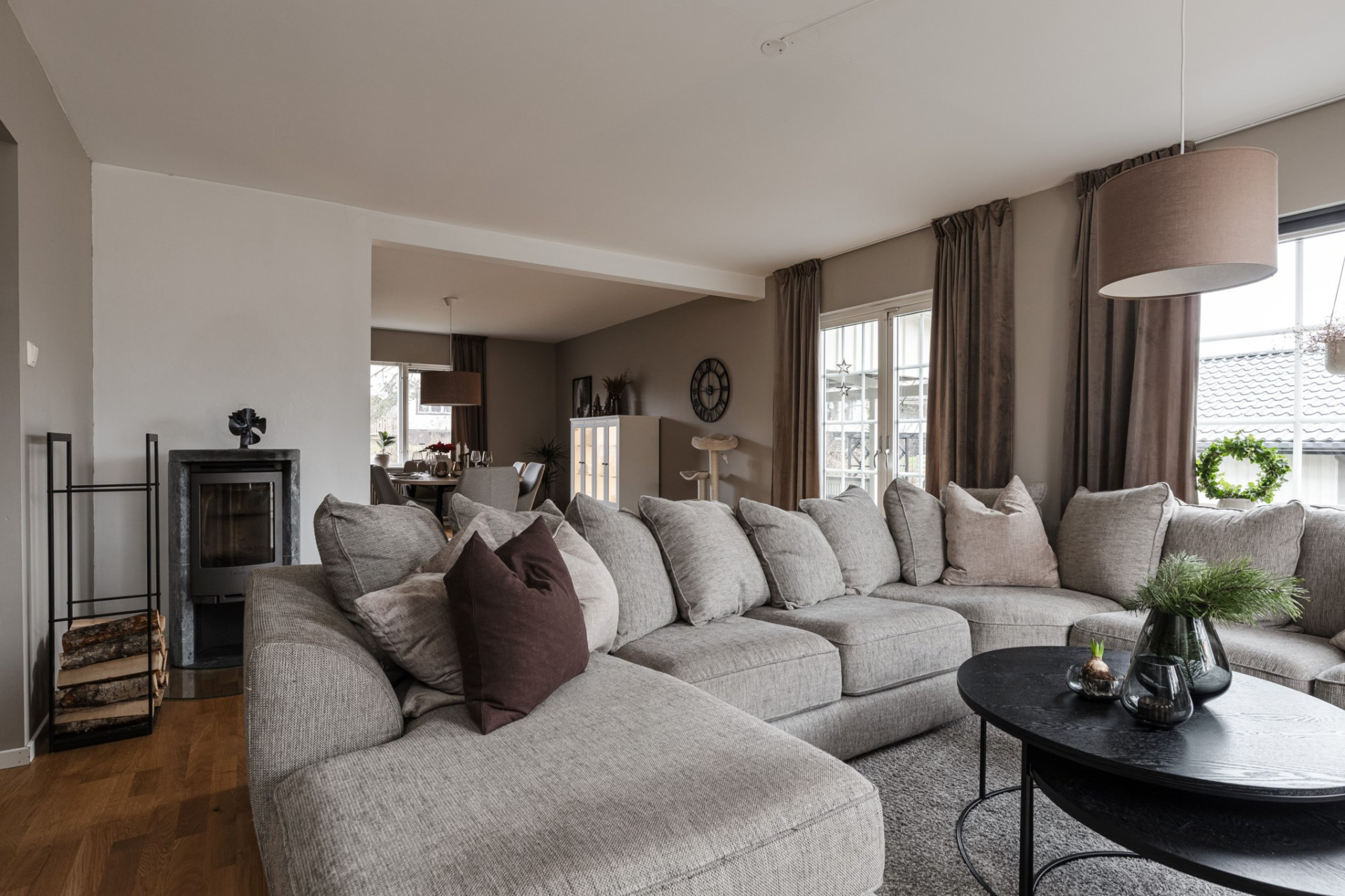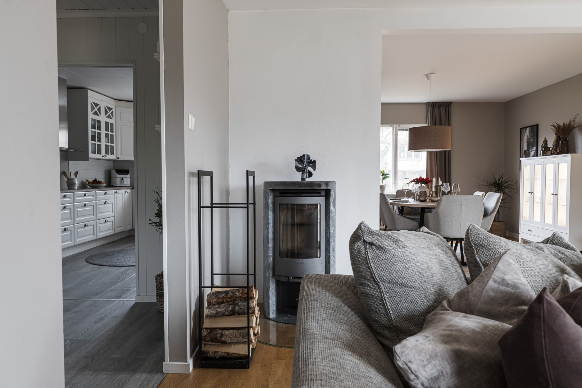 Rymligt vardagsrum med nymålade väggar och plats för både matsalsbord samt soffgrupp. Kamin.