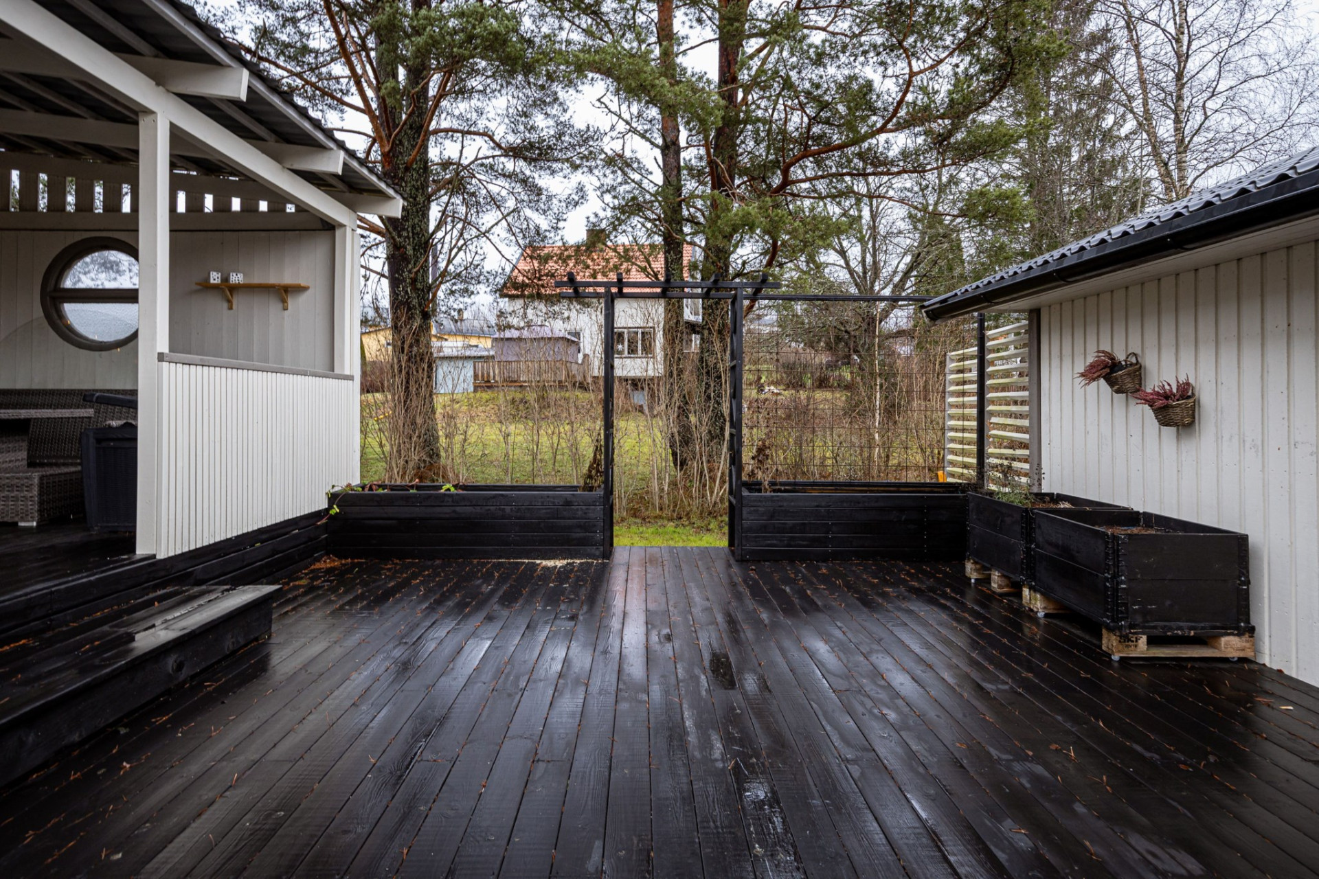 Härlig tomt med nyplanterad tujahäck.Uteplats/balkong