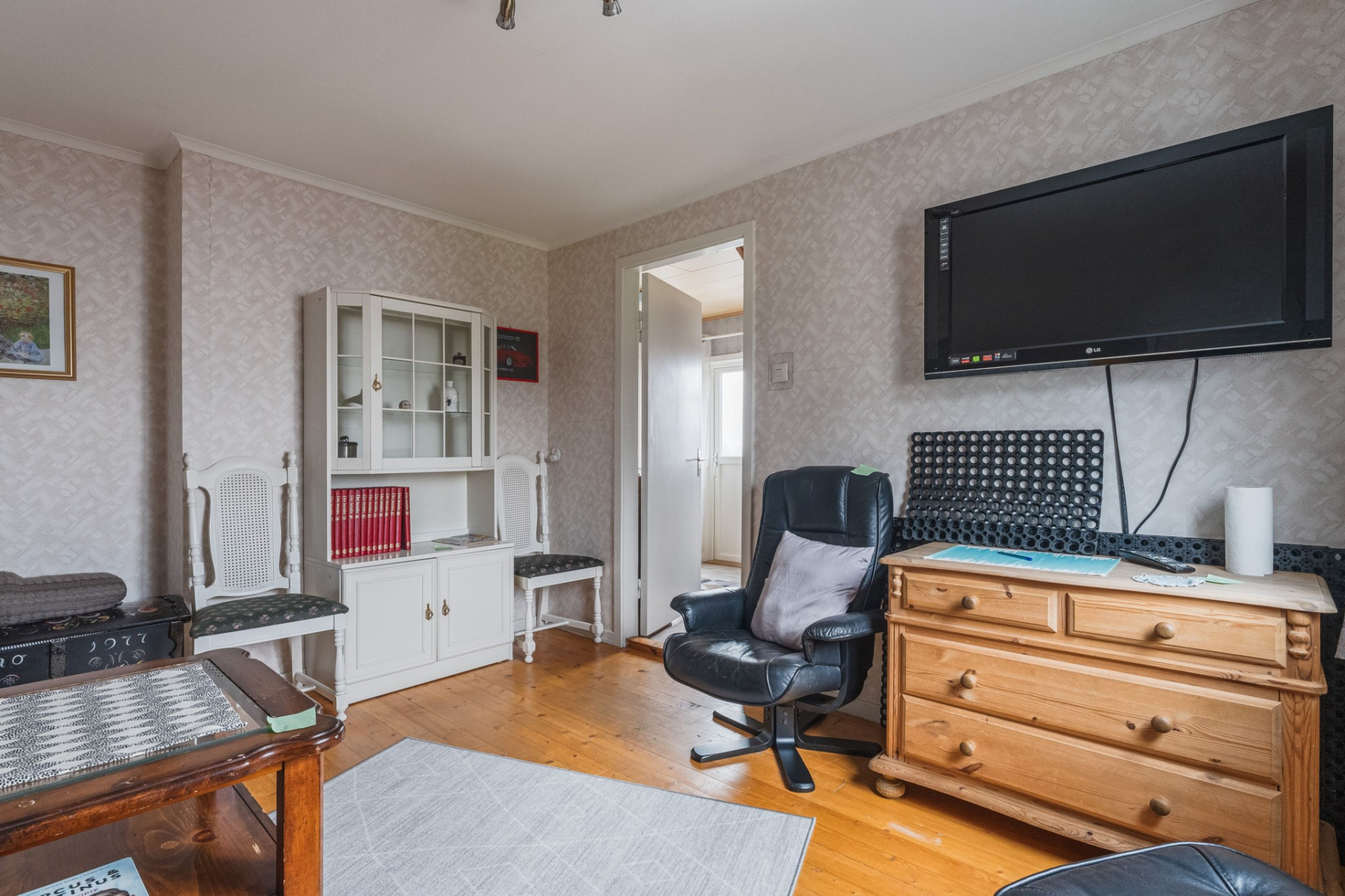 Stort vardagsrum med gott om plats för både soffgrupp och matbord. Plastmatta på golv och tapetserade väggar.