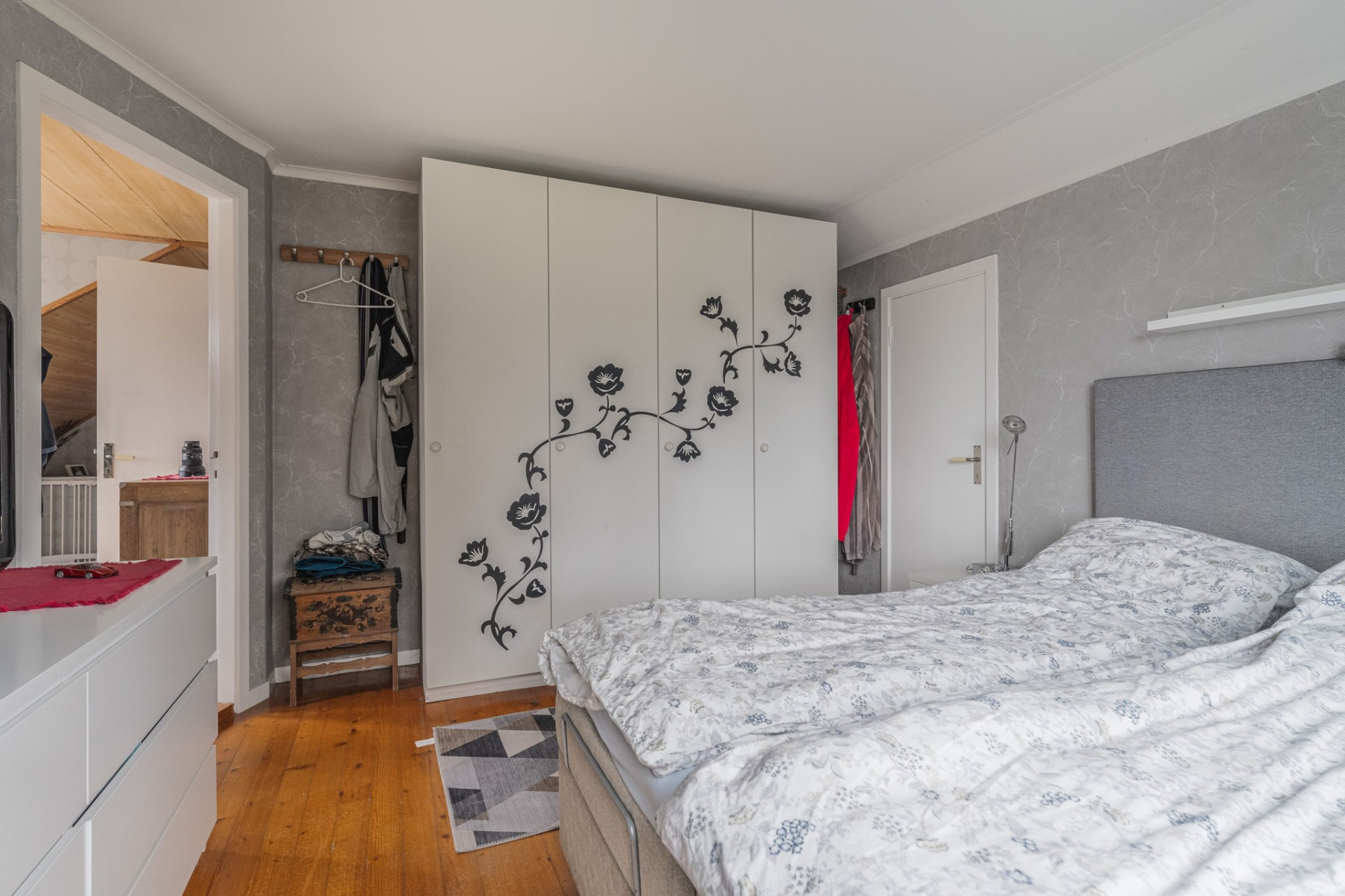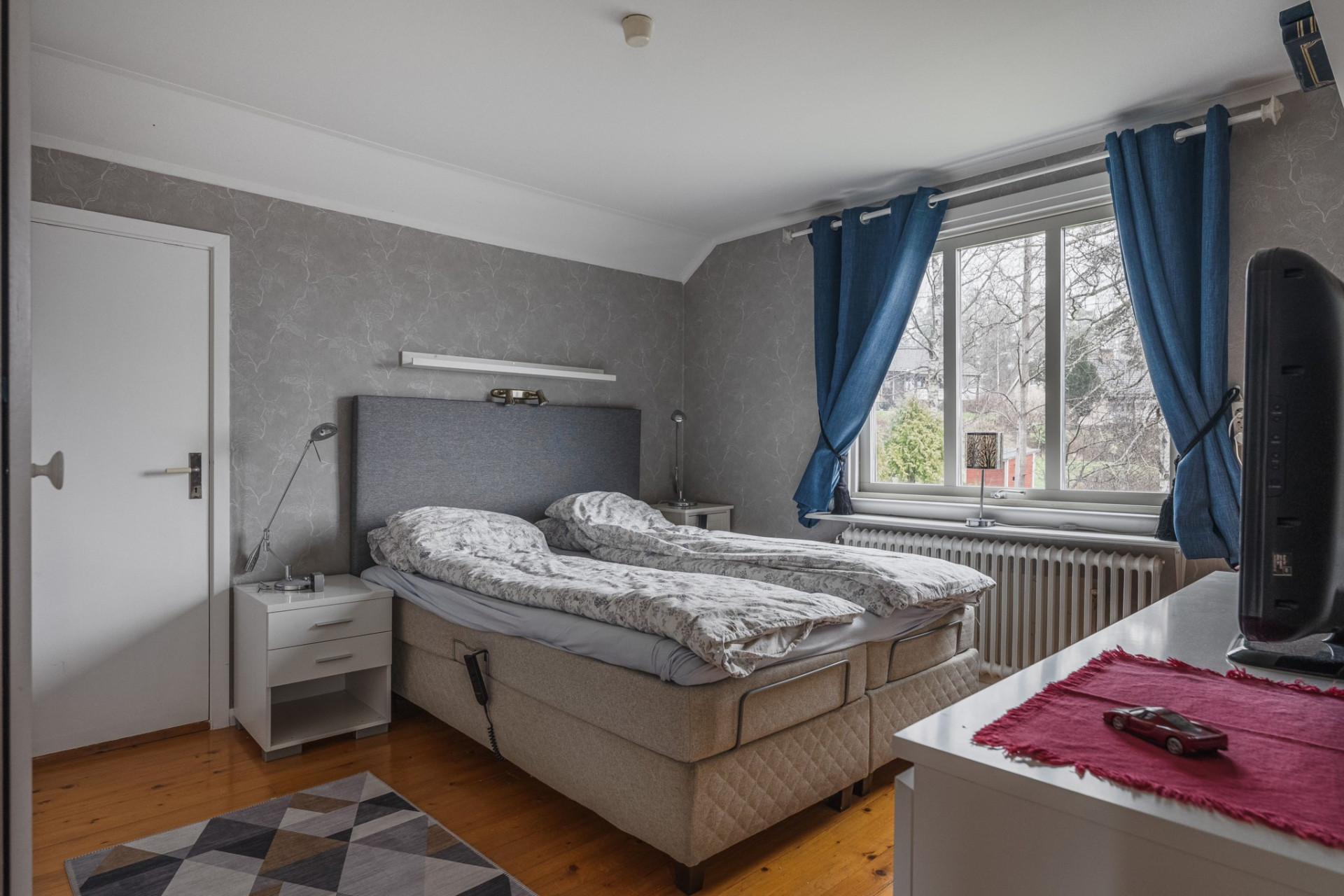 Rymligt sovrum med bra ytor för möblering samt praktiska kattvindar som ger extra förvaring. Rummet har trägolv och tapetserade väggar.