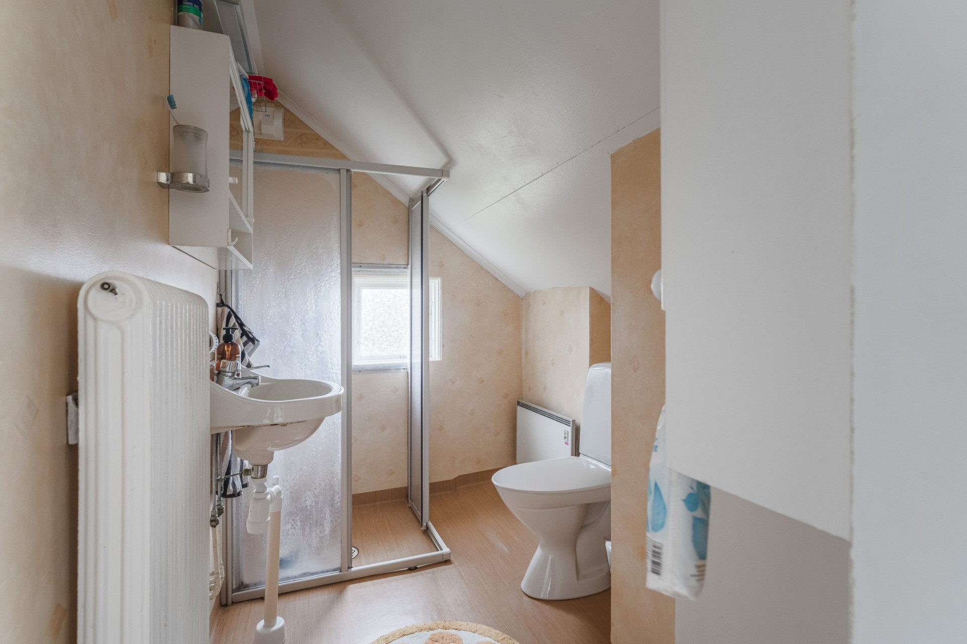Rymligt och funktionellt badrum utrustat med dusch, wc och tvättställ. Våtrumsmatta på både golv och väggar.