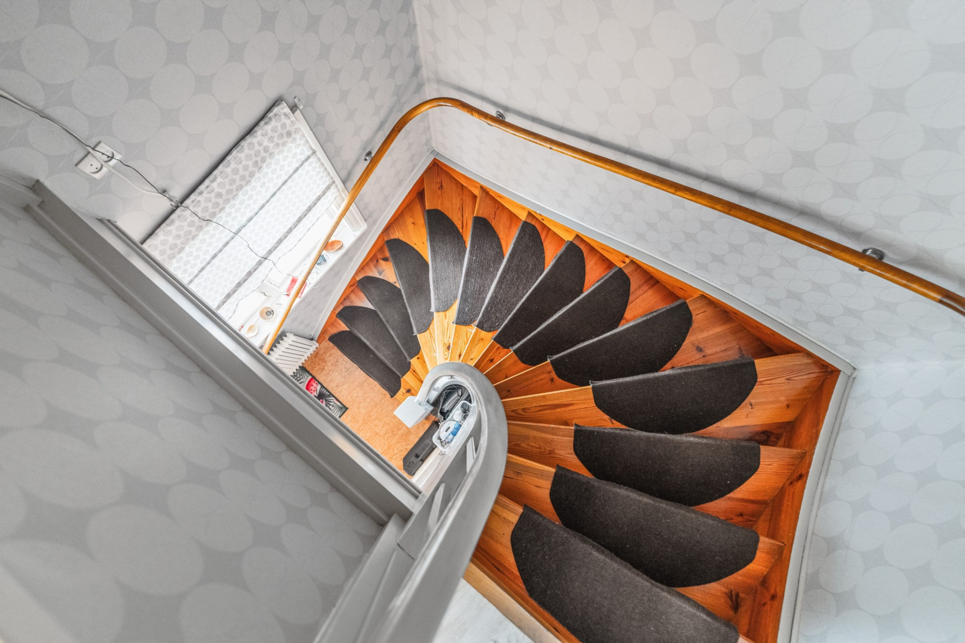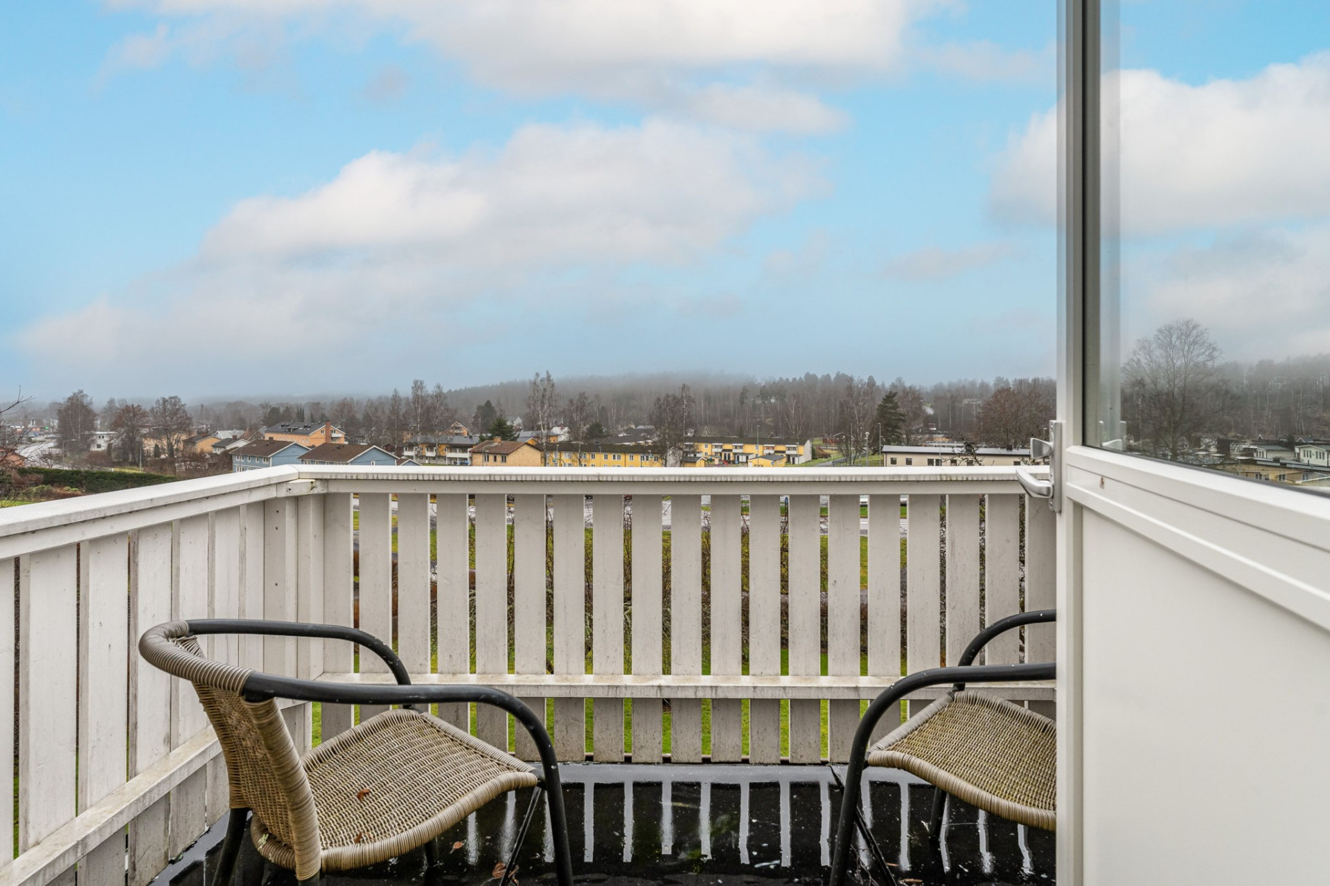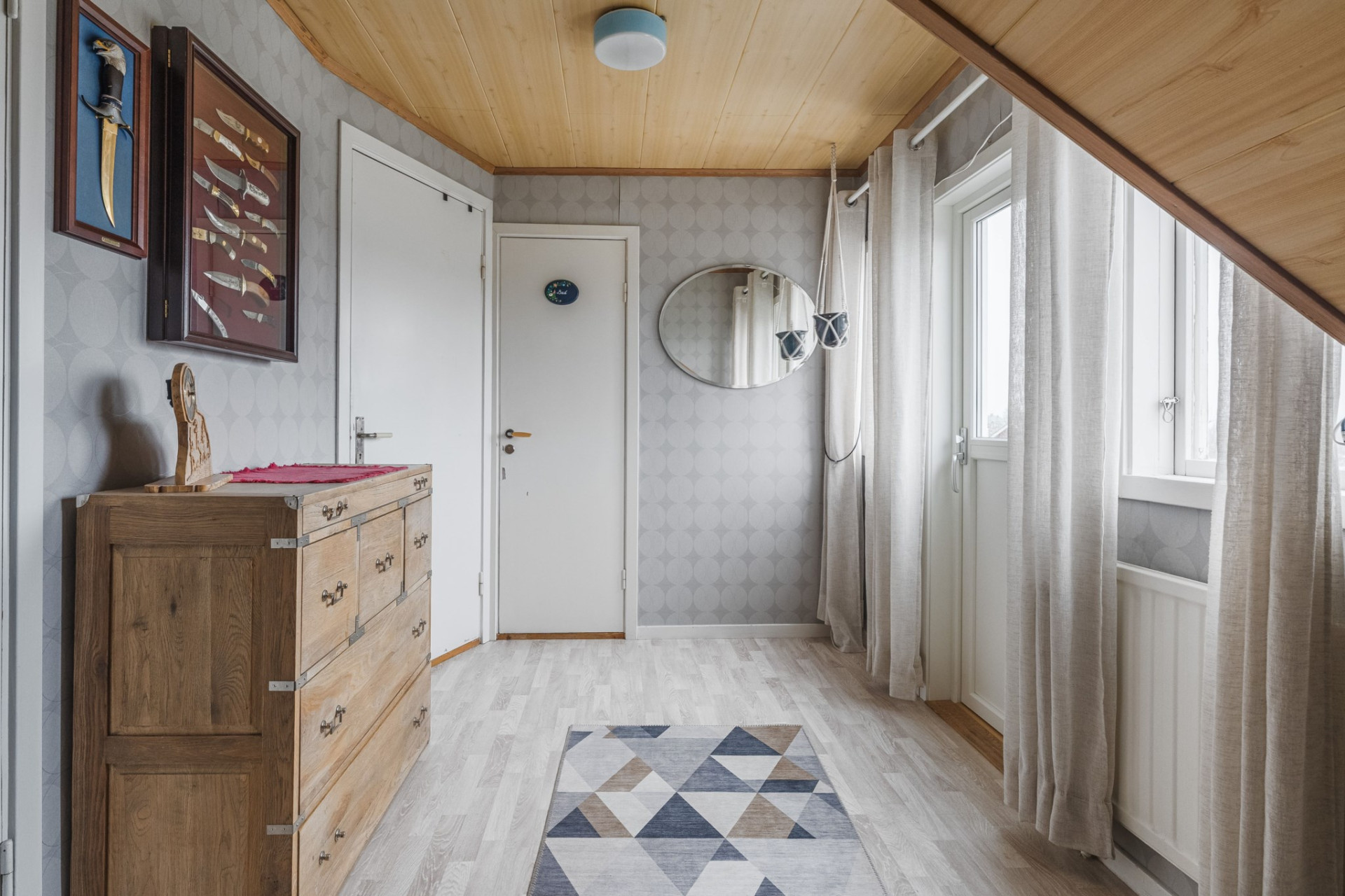 Övre hall med utgång till balkong. Plastmatta på golv och tapetserade väggar.