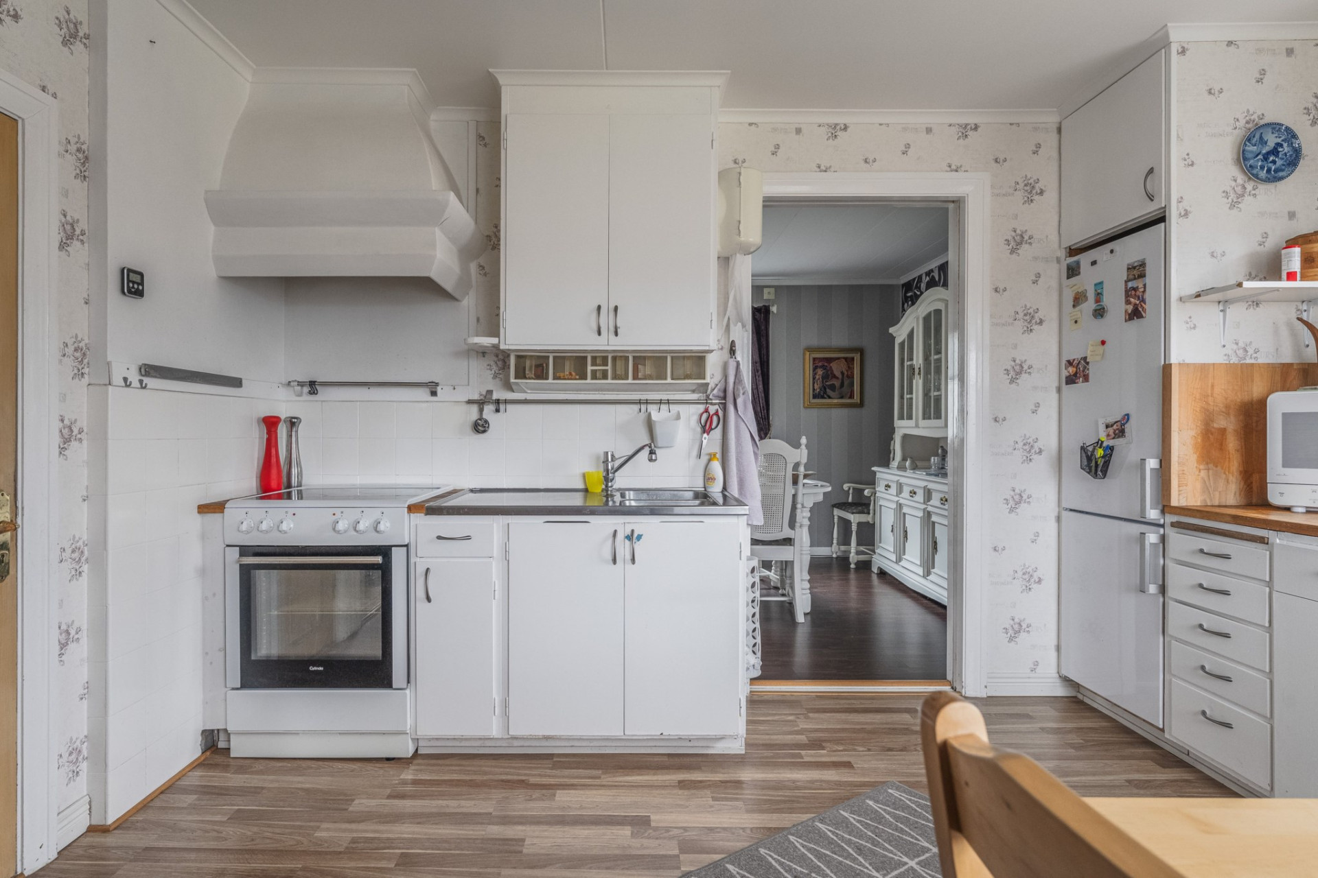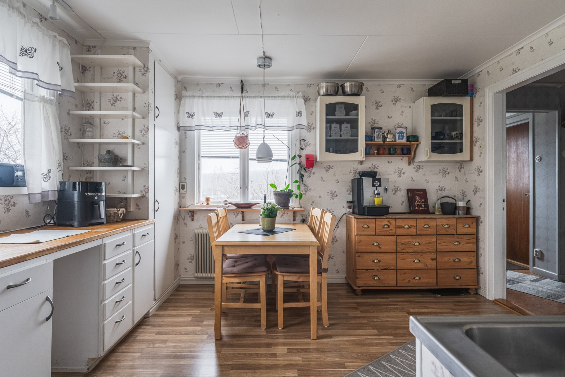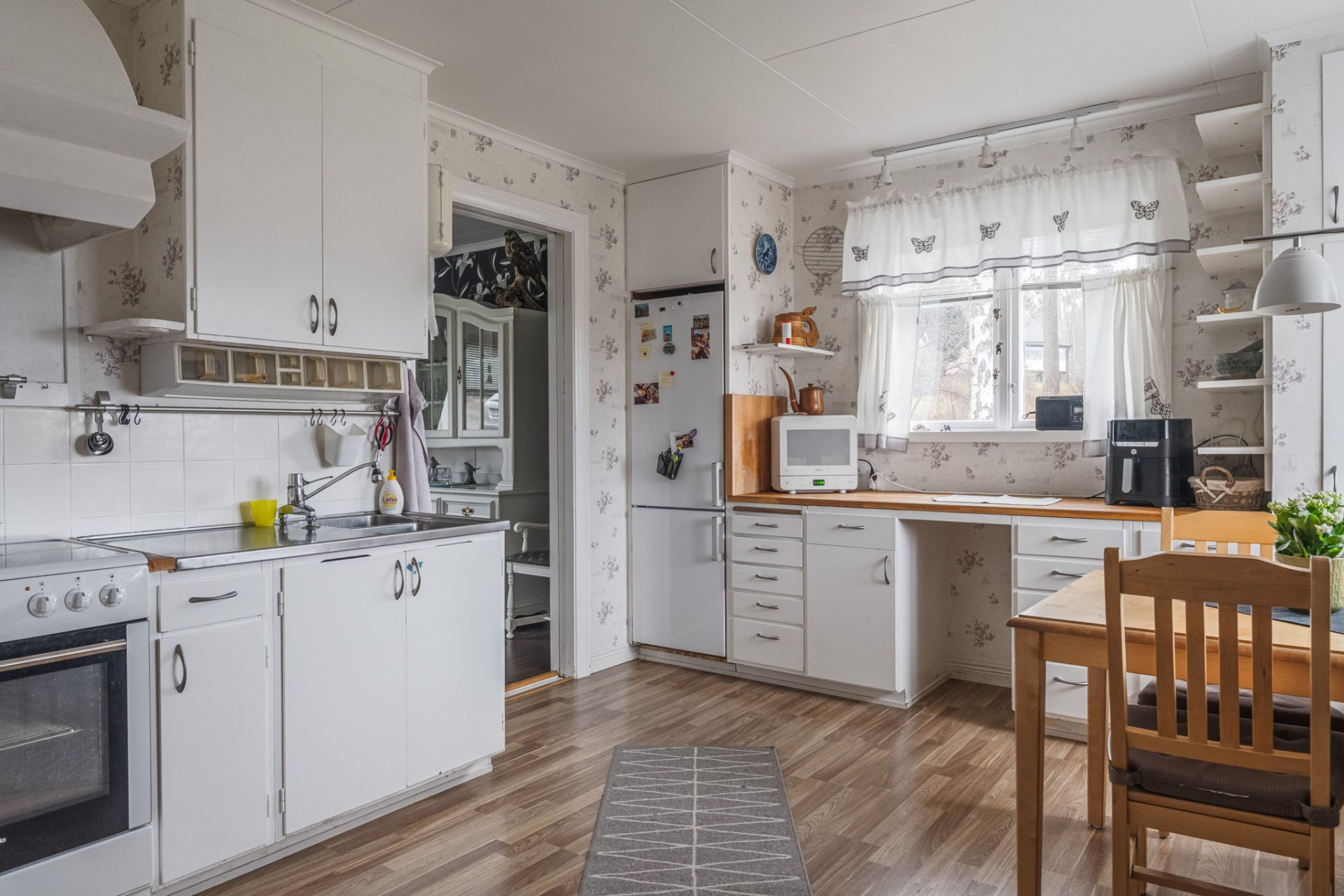 Charmigt kök med goda arbetsytor och bra förvaringsmöjligheter. Köket är utrustat med kyl/frys, spis med ugn samt fläkt. Plats för matbord vid fönster. Plastmatta på golv och tapetserade väggar.