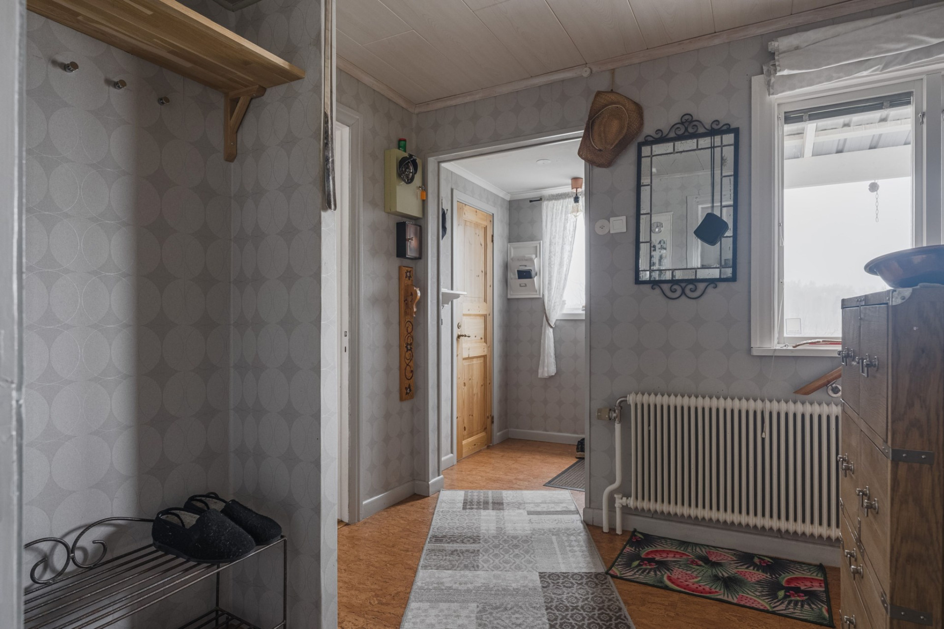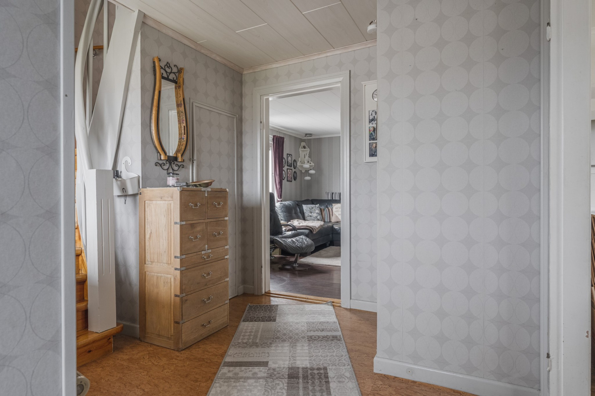 Rymlig hall med goda förvaringsmöjligheter i garderob. Plastmatta på golv och tapetserade väggar.