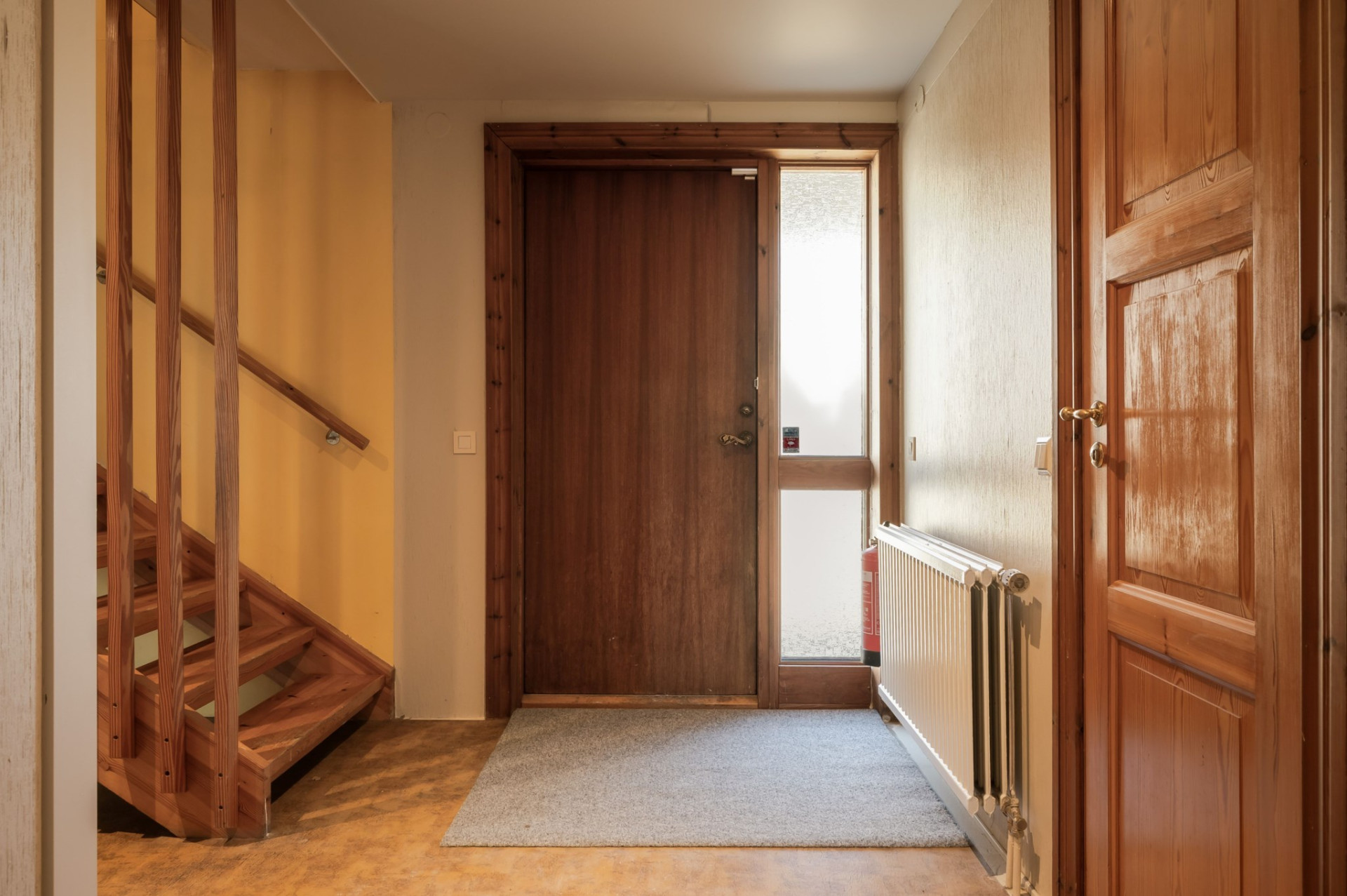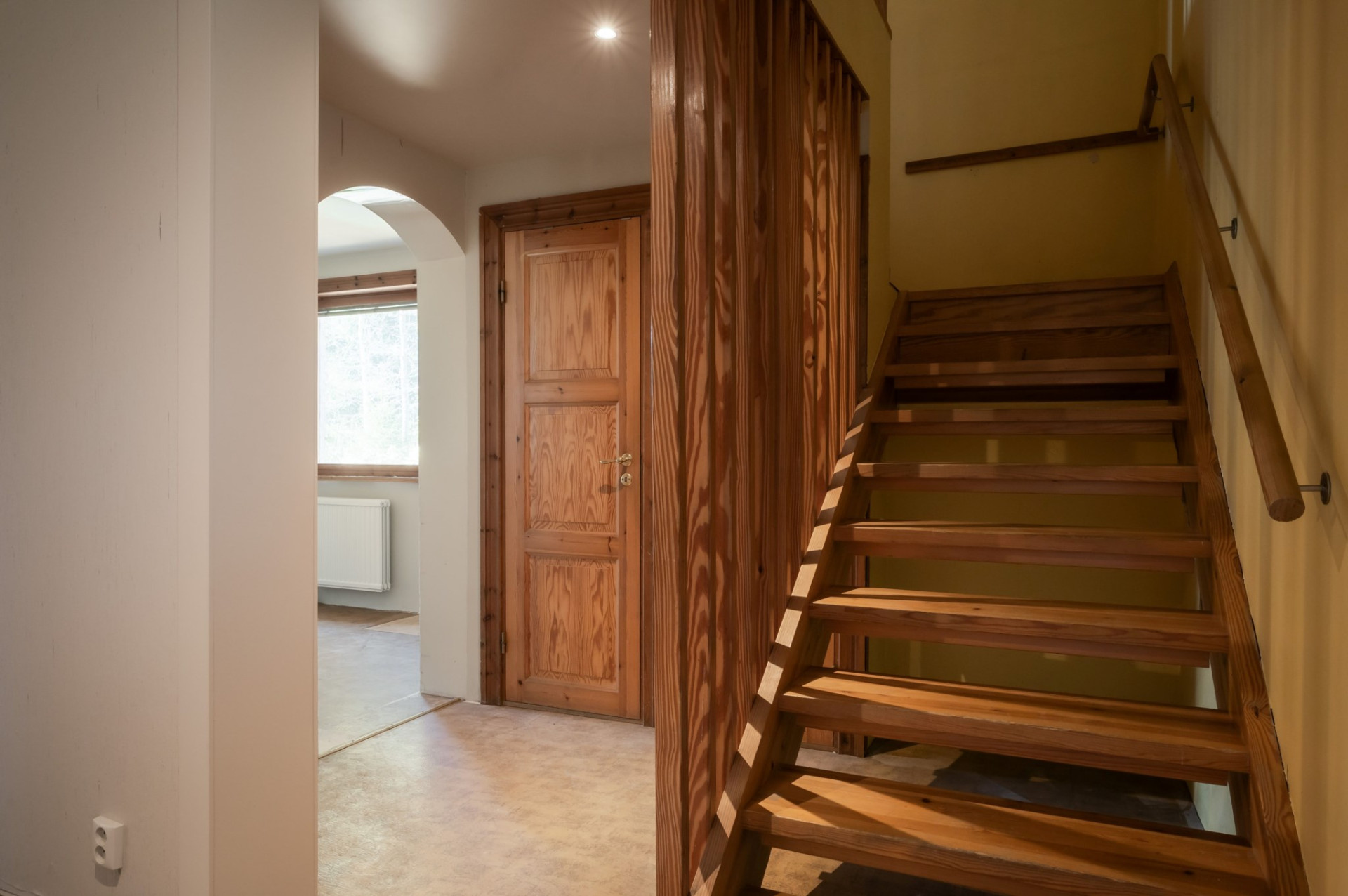 Rymlig hall med goda förvaringsmöjligheter. Härifrån nås trappa till både övre plan och källarplan