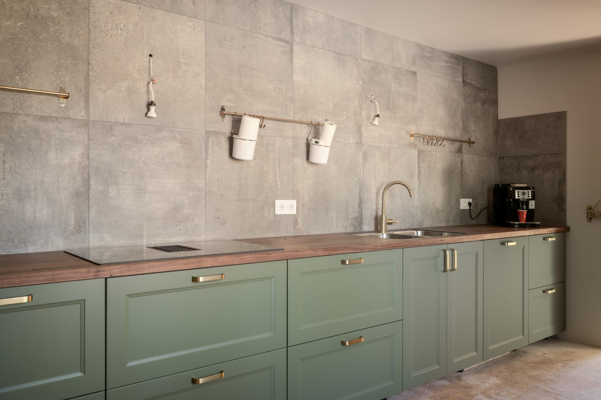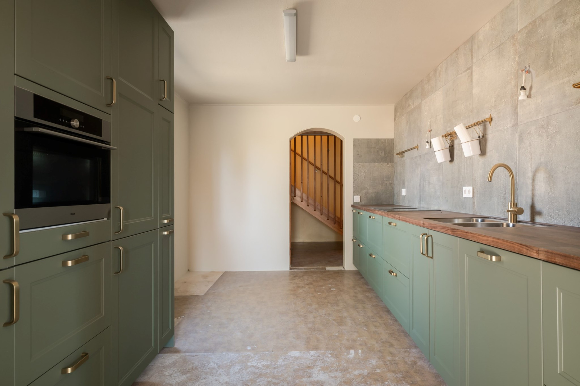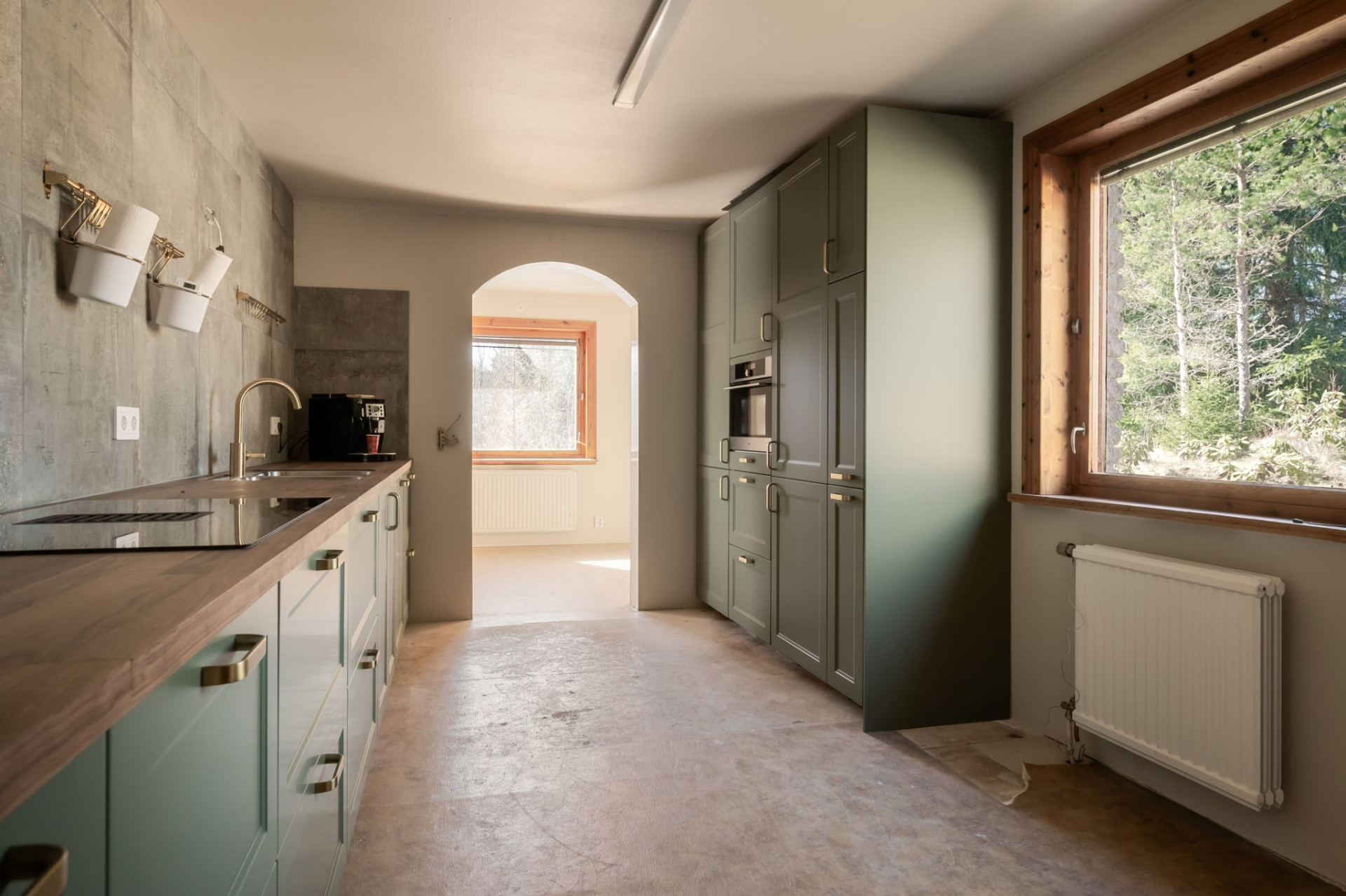 Nyrenoverat kök i smakfull design. Här finns goda ytor samt förvaringsmöjligheter. Integrerad kyl och frys, diskmaskin samt spishäll med fläkt.