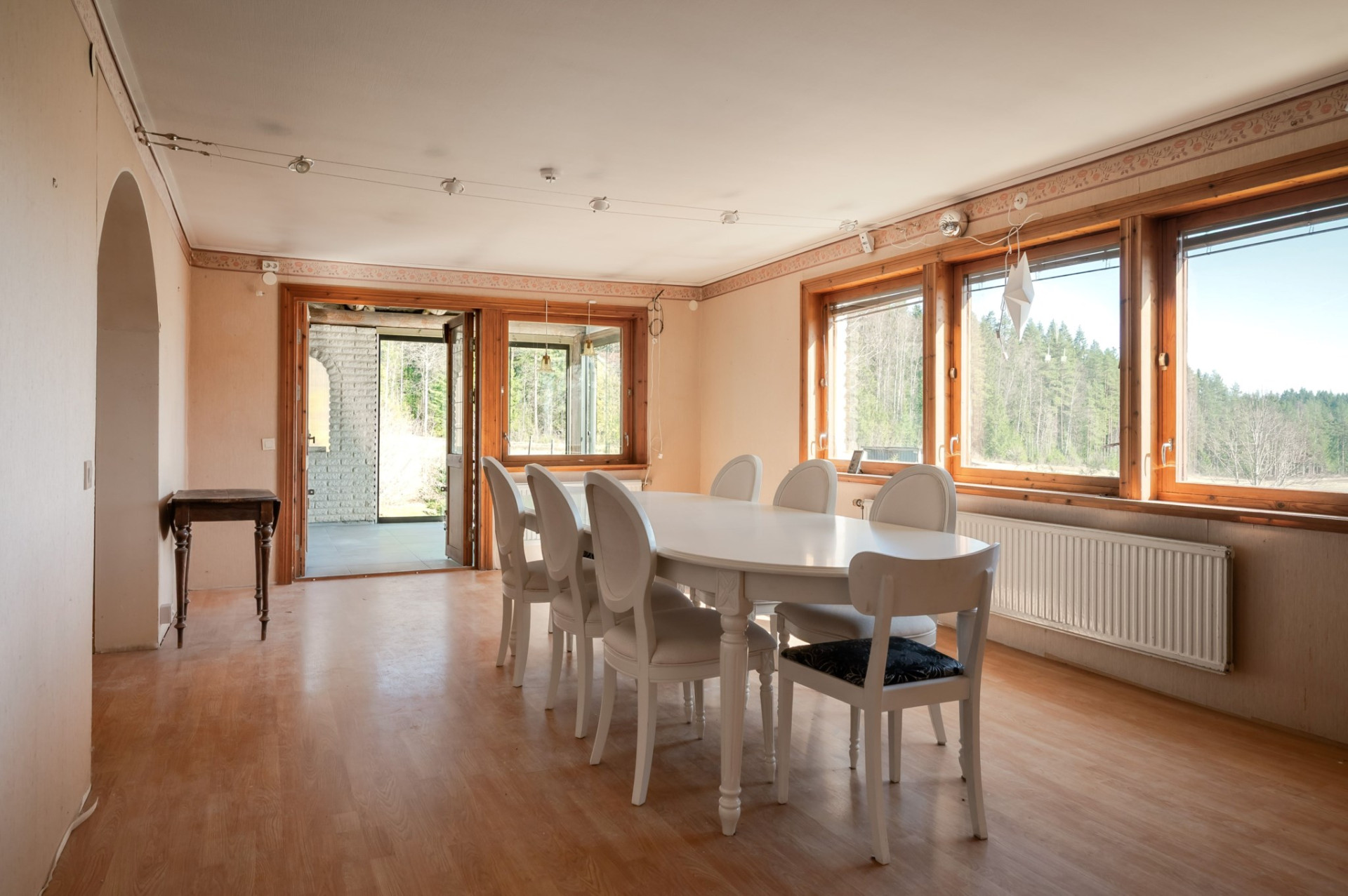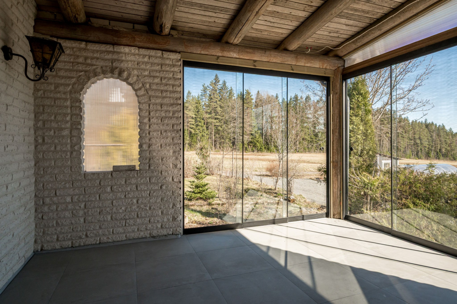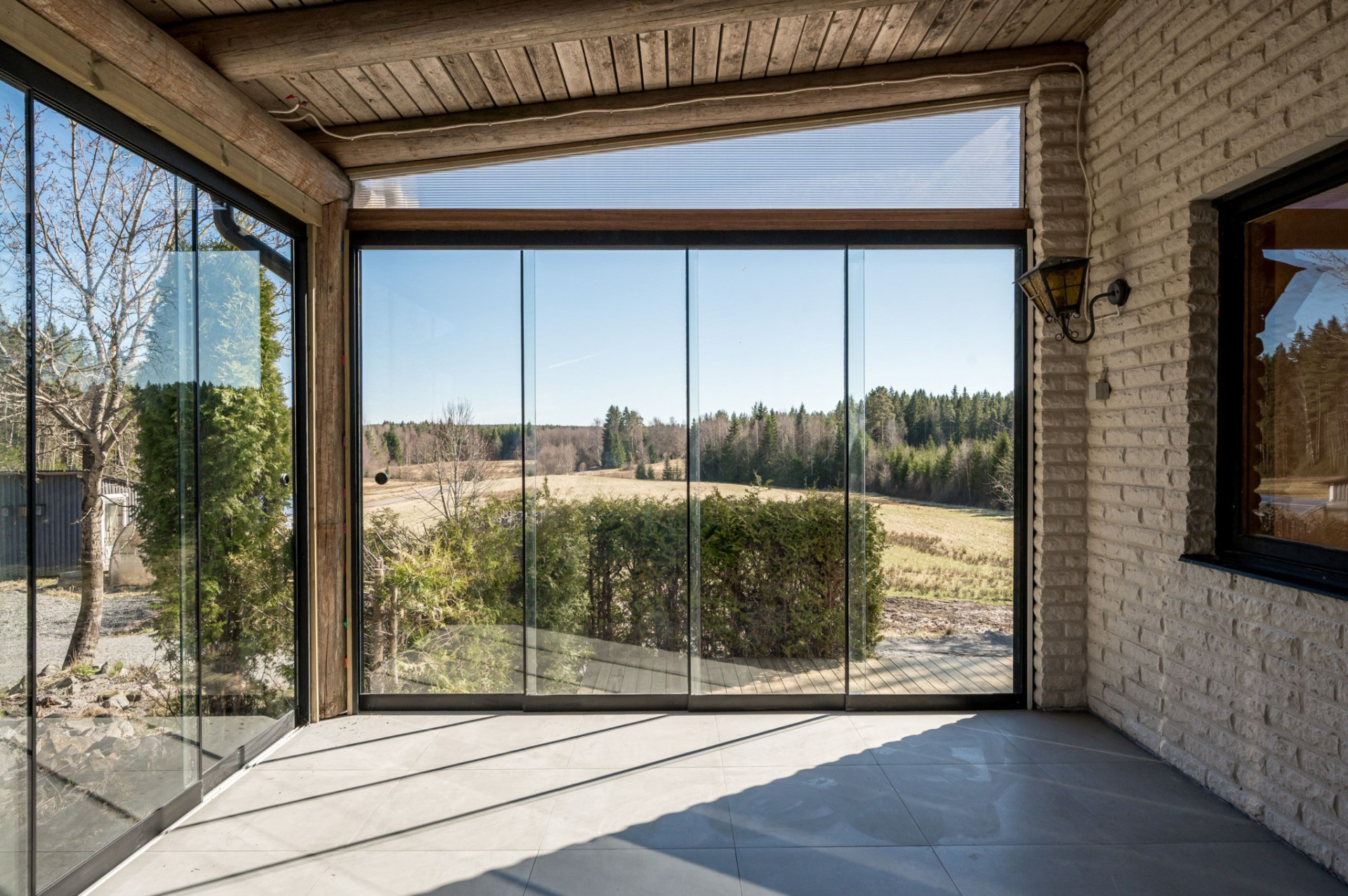 Stort matsalrum med utgång till en inglasad altan, med nya glasdörrar och klinker på golv.