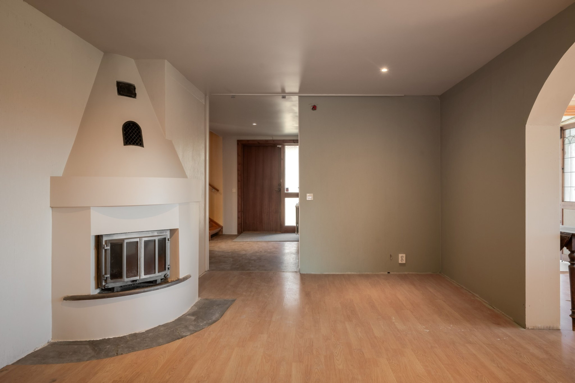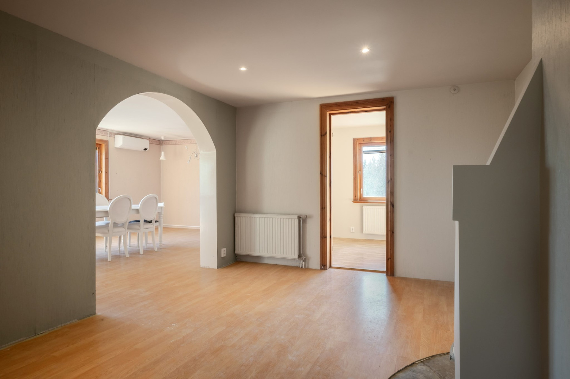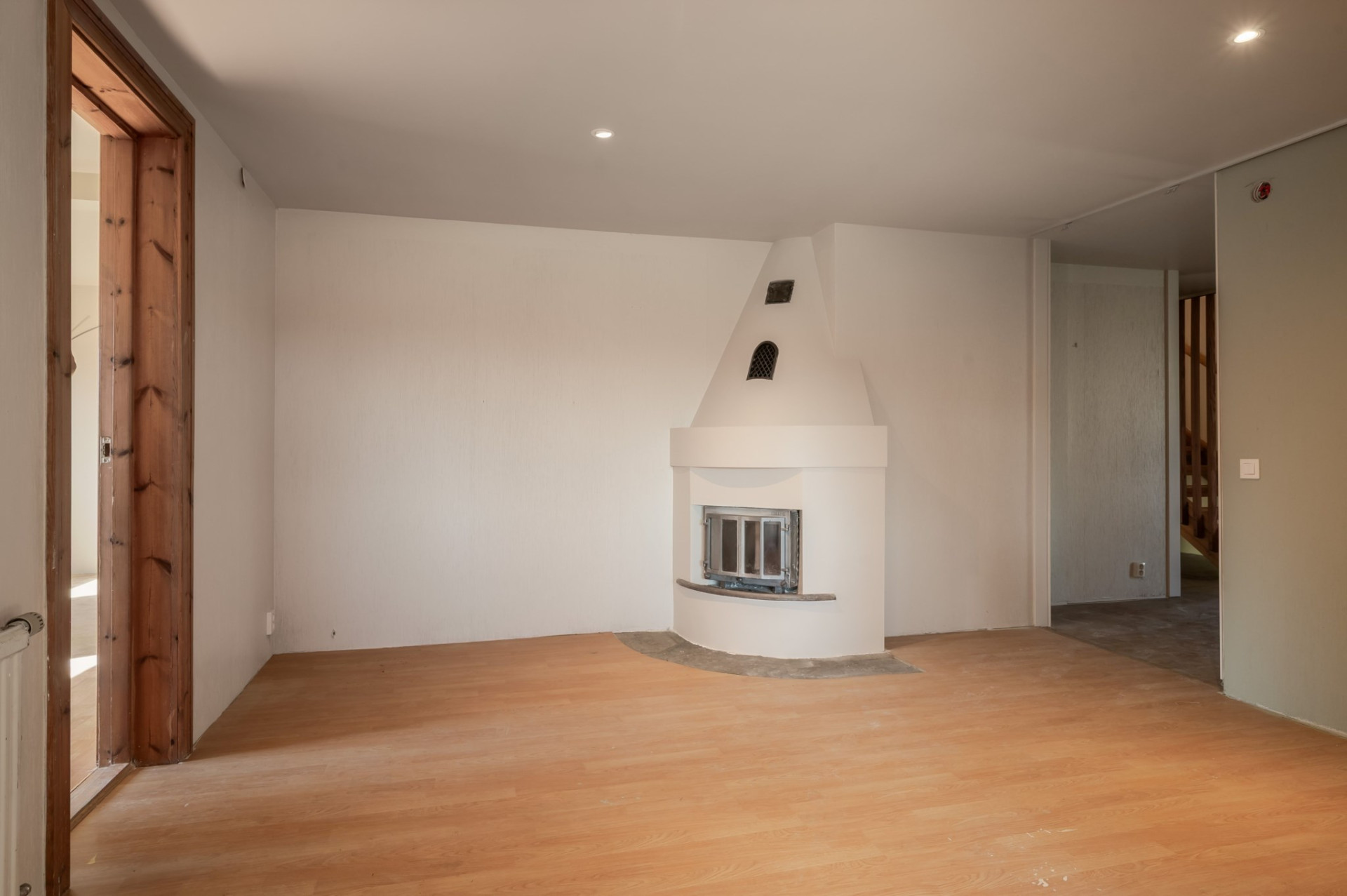 Stort allrum med god plats för möblemang. Här finns en öppen spis med insats.