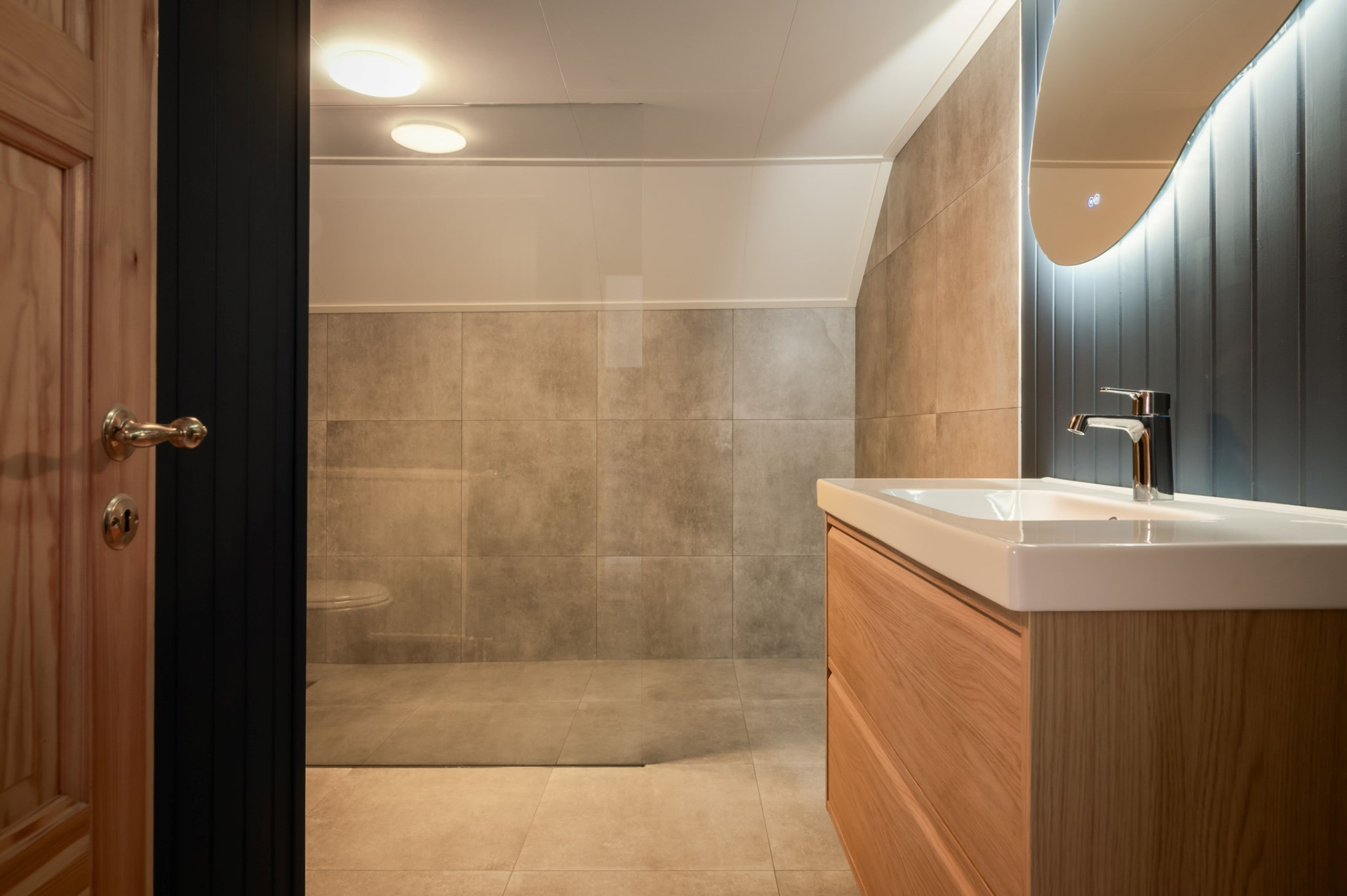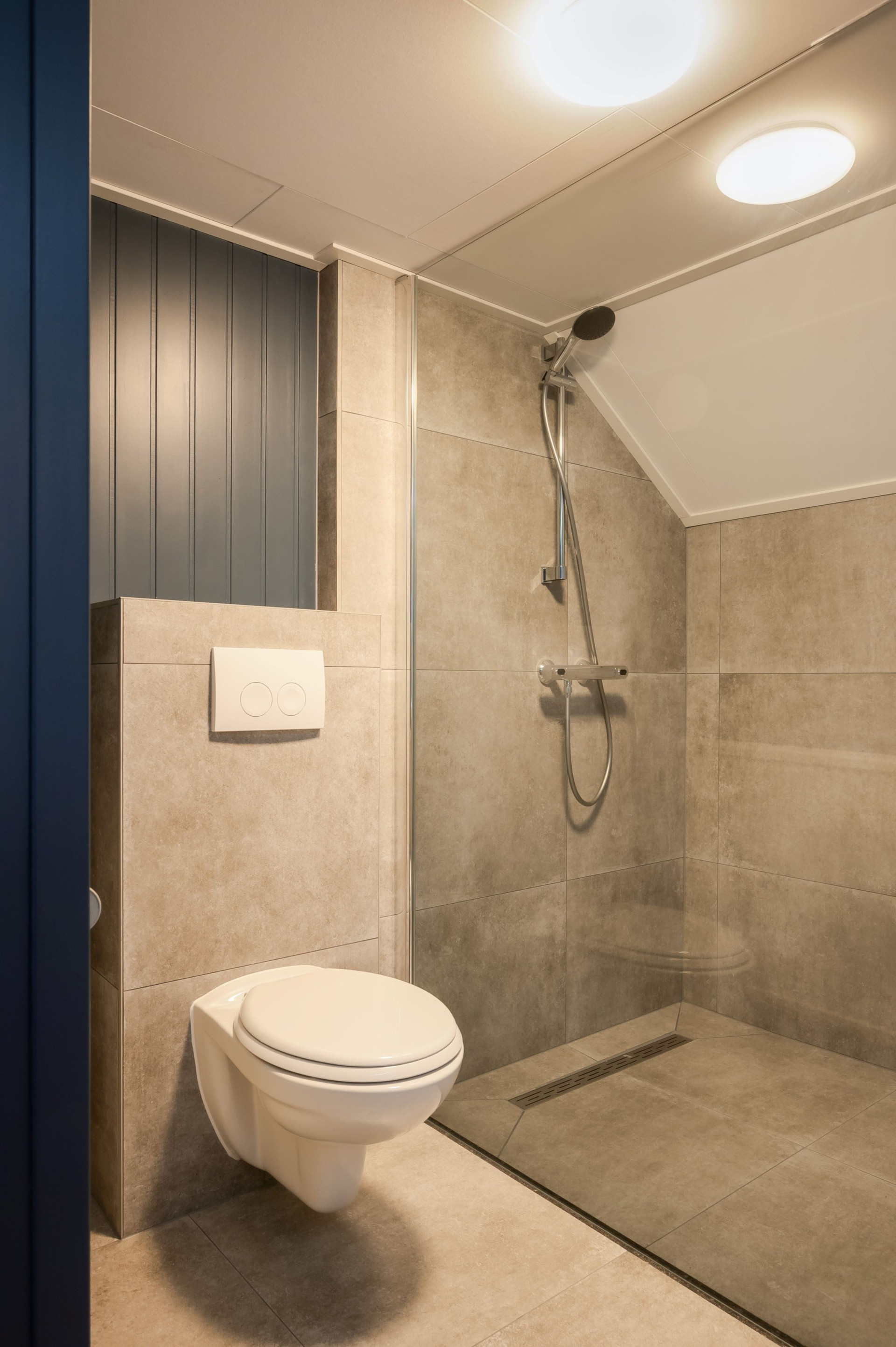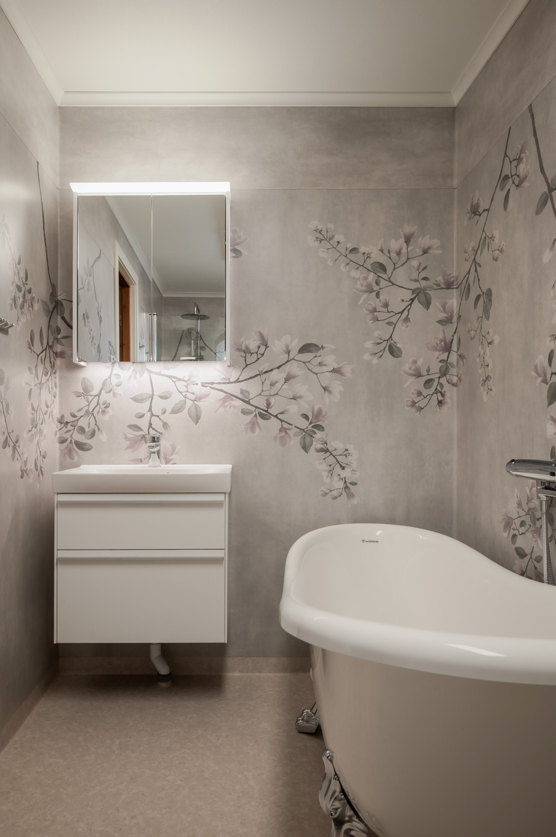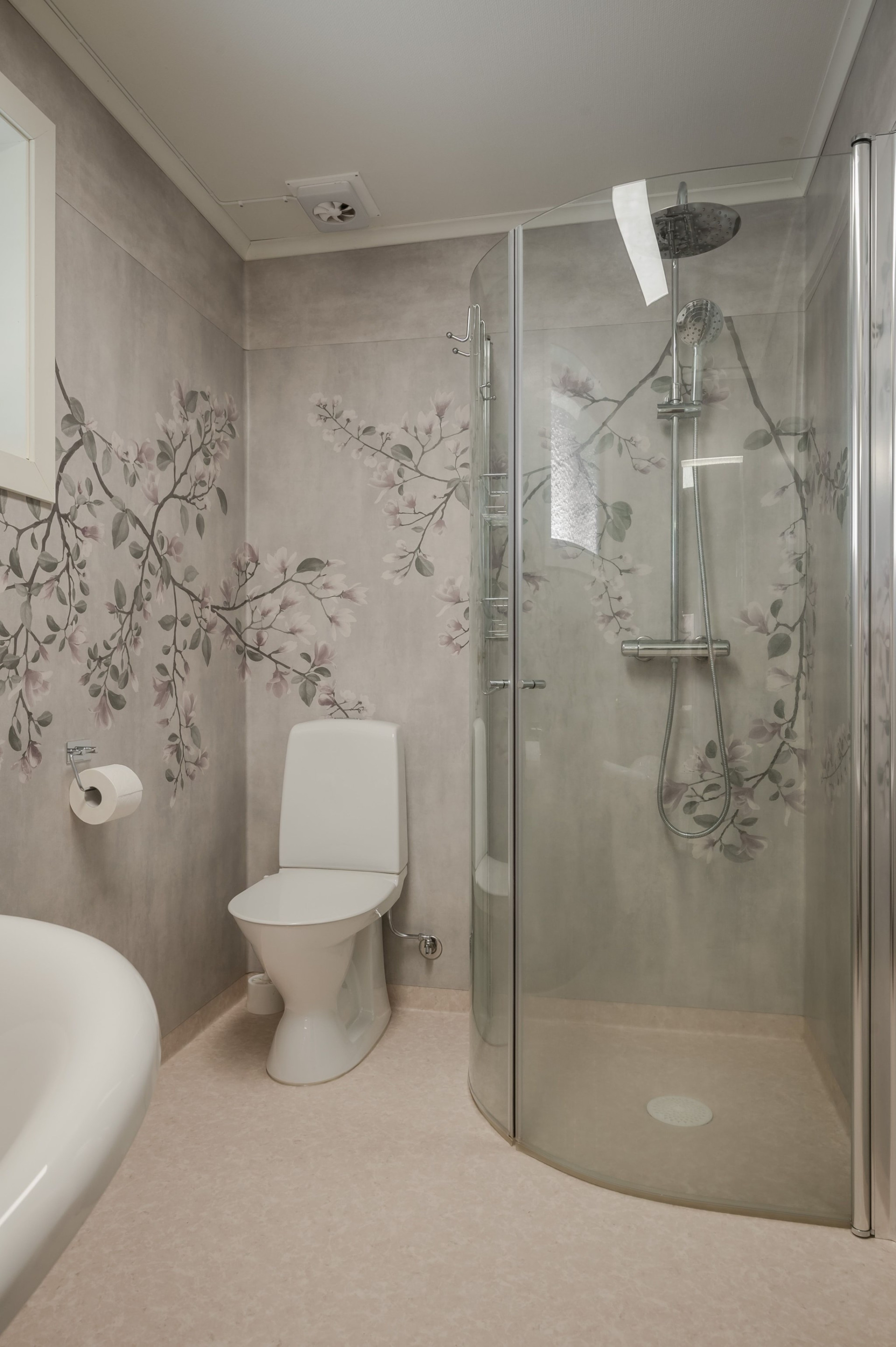 Renoverat badrum med våtrumstapet på golv och vägg. Här finns dusch, badkar, handfat och wc-stol. Golvvärme!