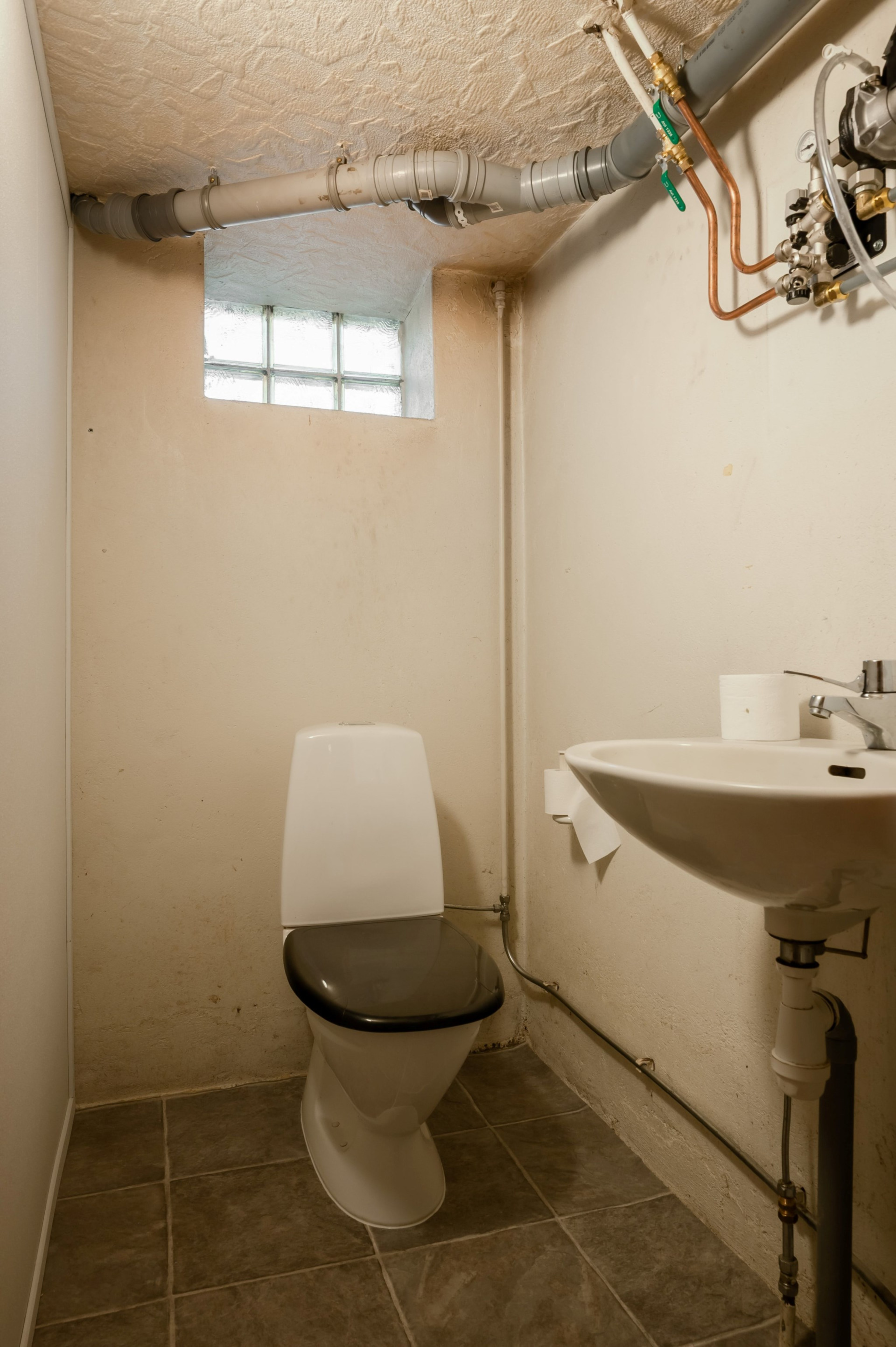 Vidare från bostadens största sovrum nås en nyrenoverad WC.